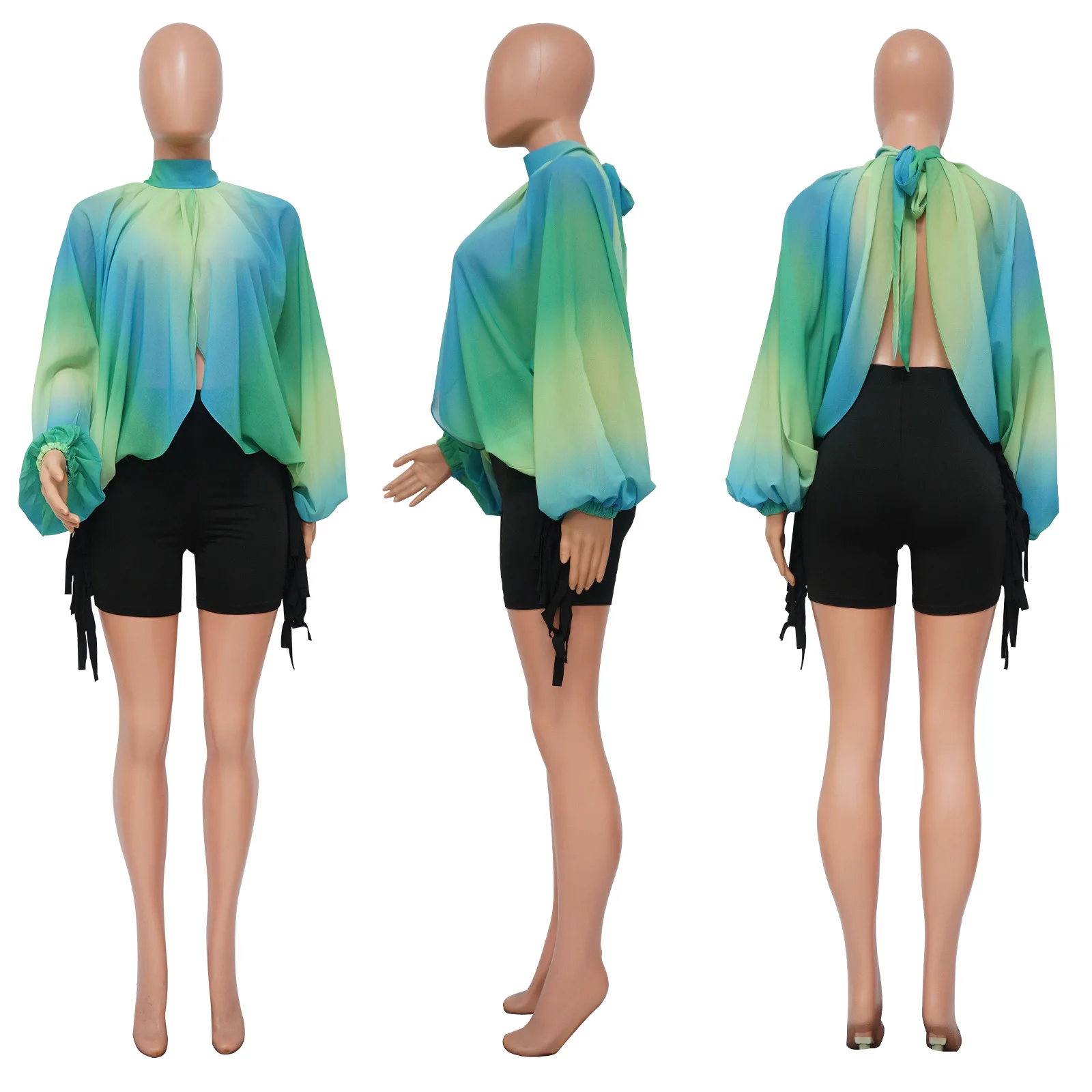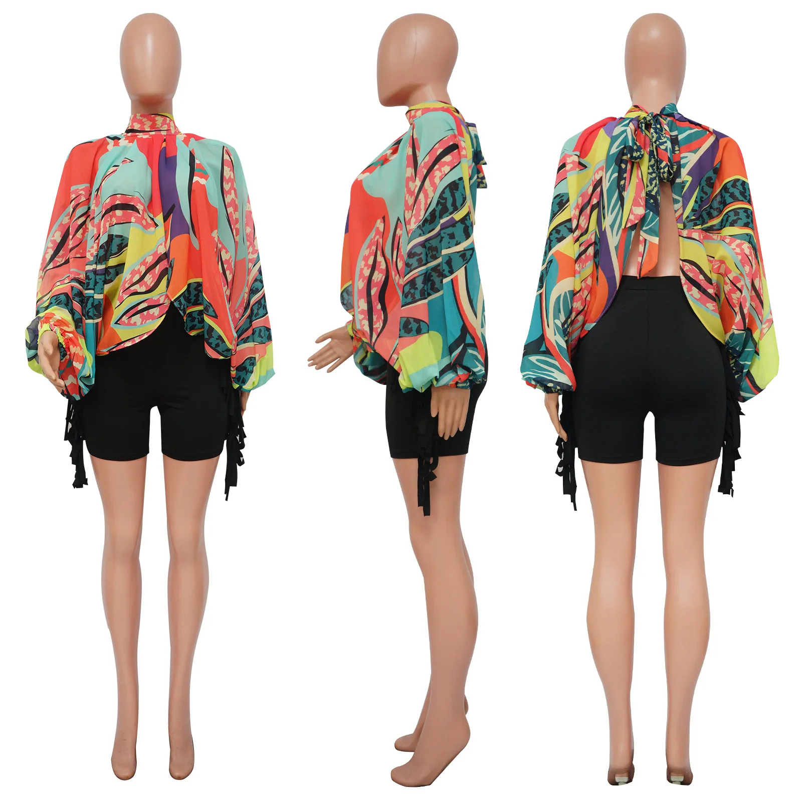 D0906TA25 2023 Spot Goods Chiffon Print Breathable Long Sleeve Turtleneck Blouse Tops For Women Sehe Fashion
