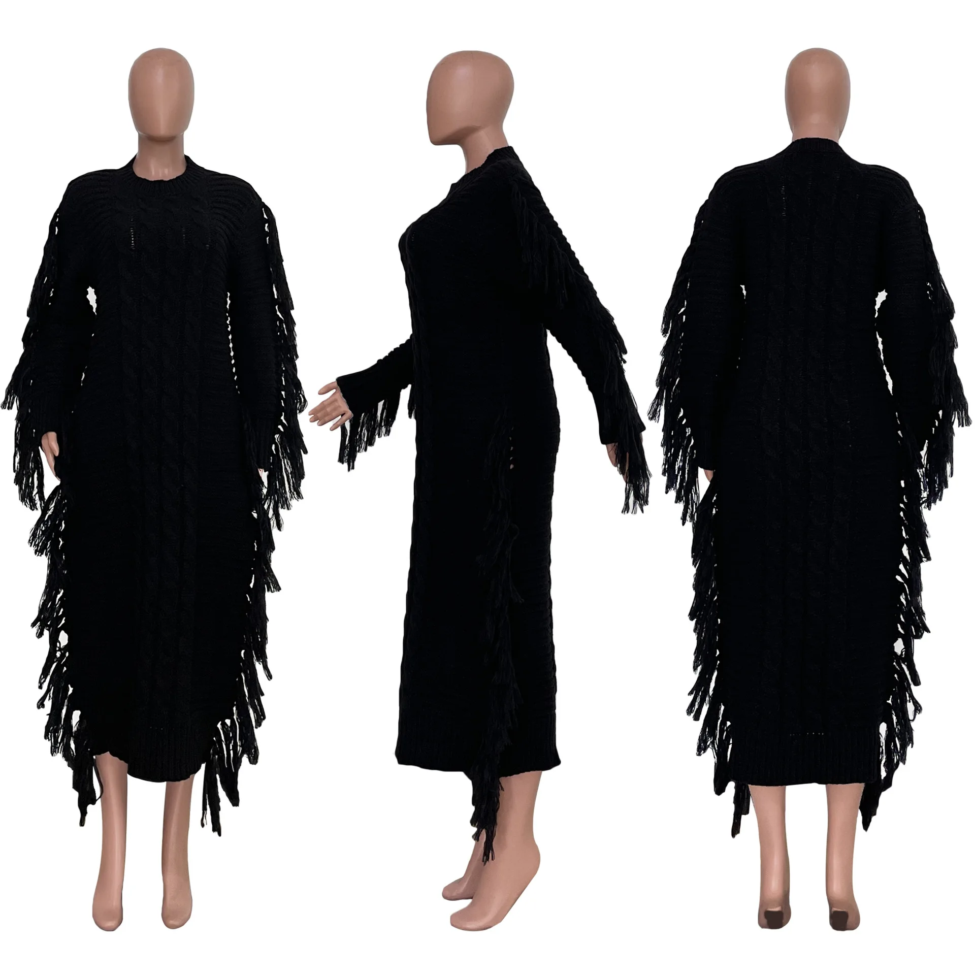 D1211TA04 New Trendy Solid Color Long Sleeve Hollow Out Knitted Tassel Sweater Women Dress Sehe Fashion