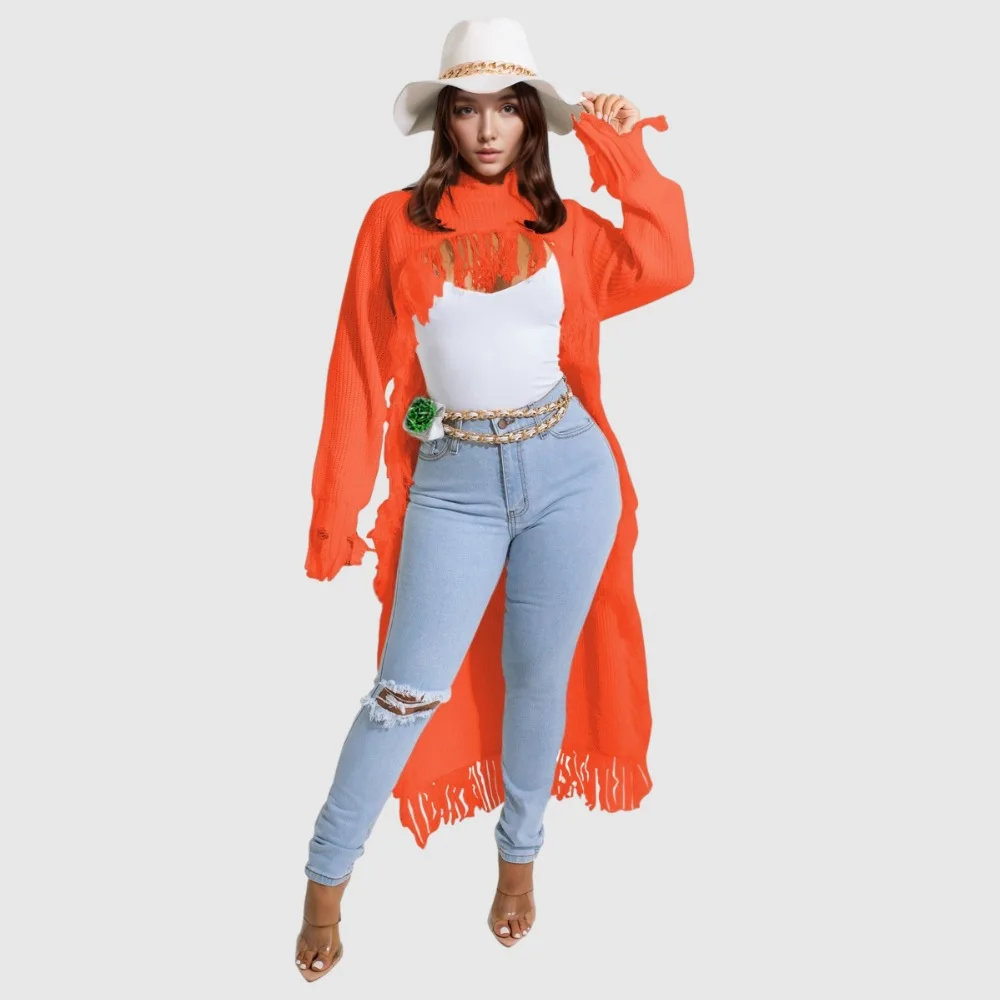 D1211TA07 Solid Color Long Sleeve Casual Hollow Out Tassel Turtleneck Long Sweater Sehe Fashion