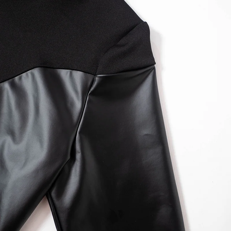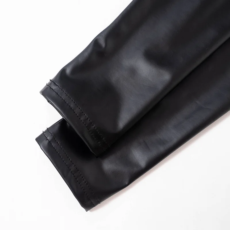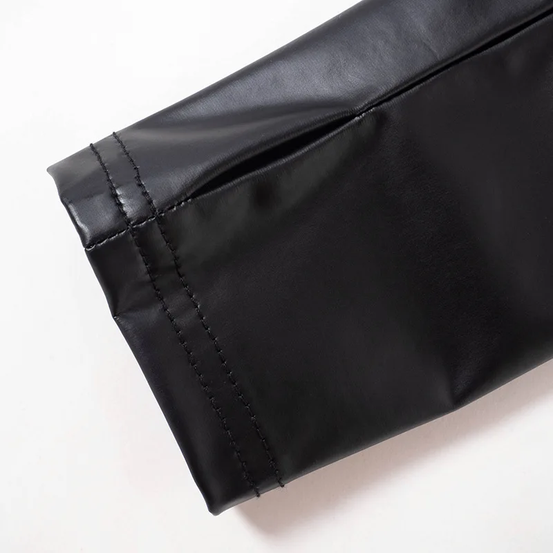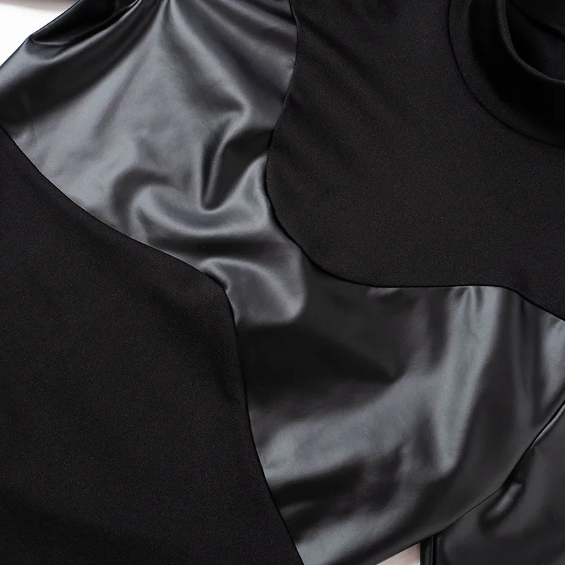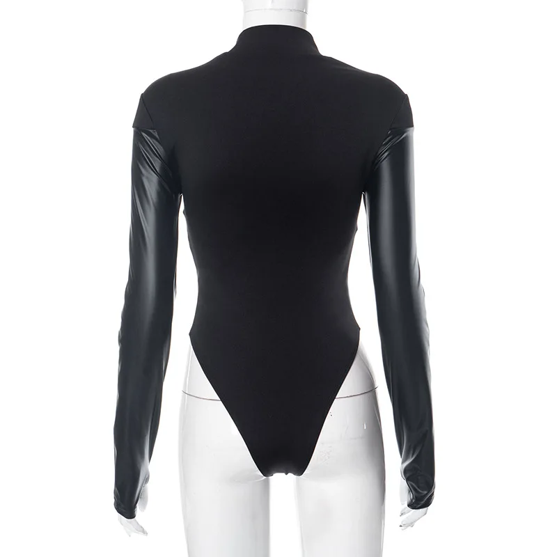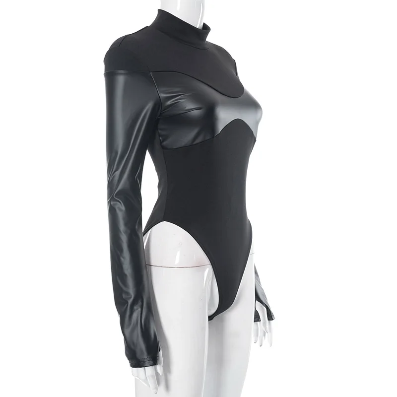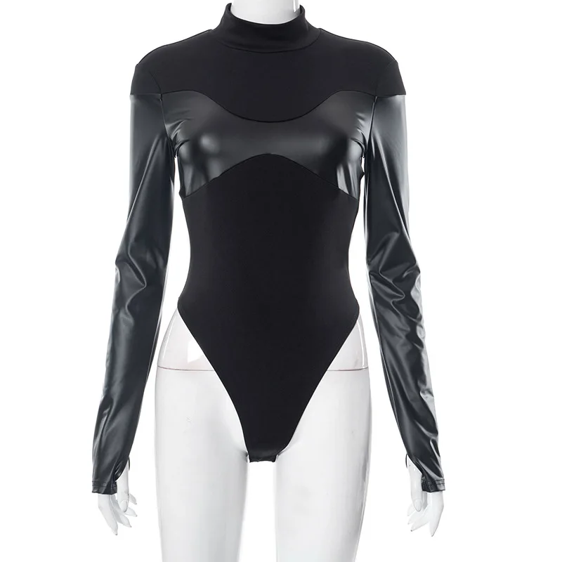 D23BS089 Summer Jumpsuit Pu Leather Crew Neck Long Sleeve Skinny Jumpsuit Solid Color Package Hip Mini Jumpsuit For Lady