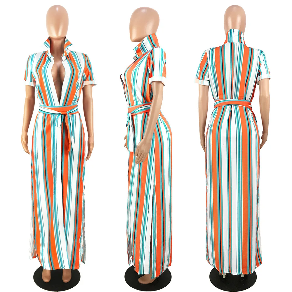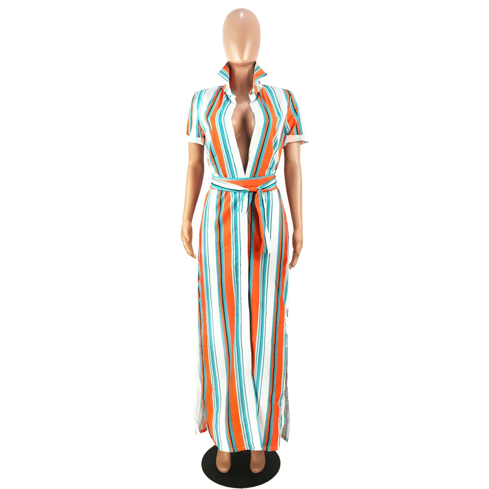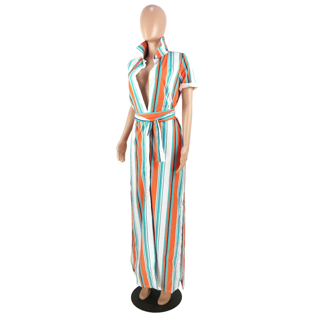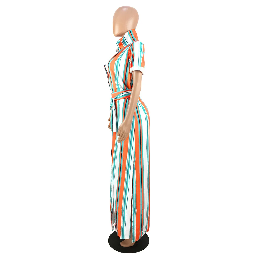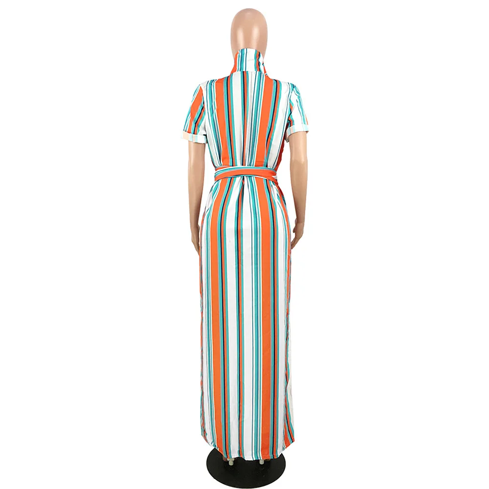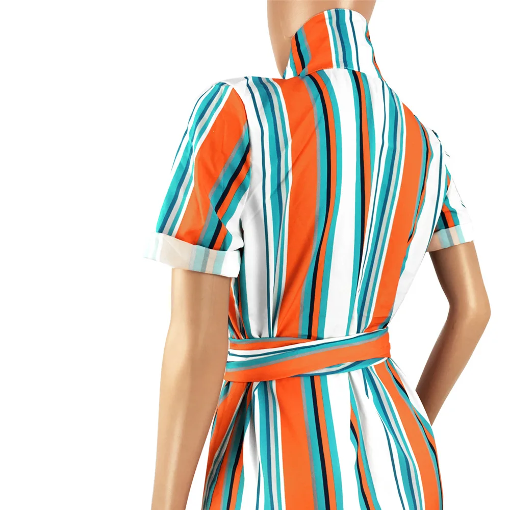 D2415 High Waist Dress Sashes Elegant Shirt Dress Women Casual Short Sleeve Striped Shirt Dress