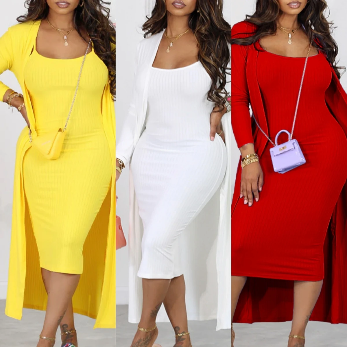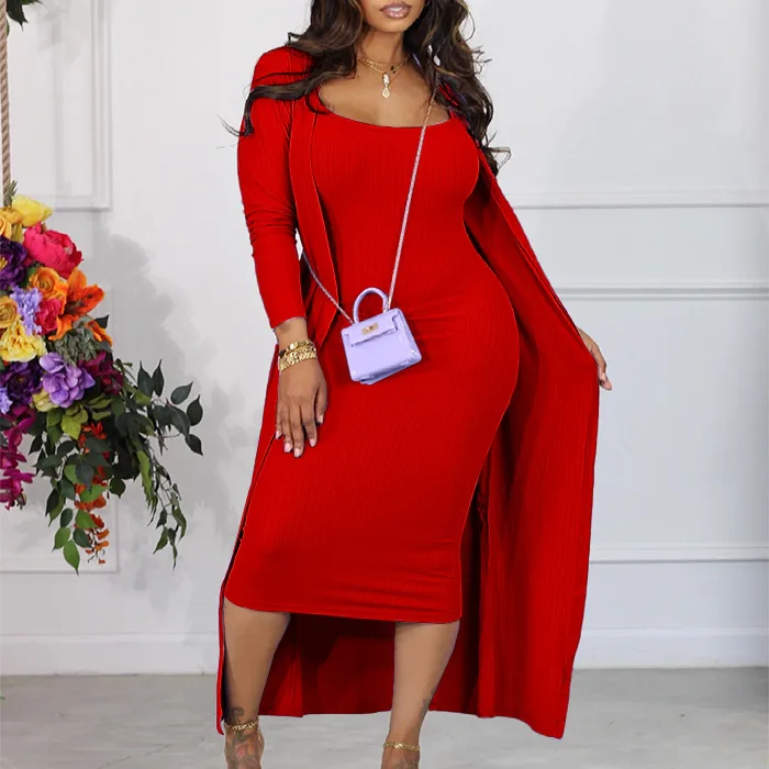 D3232 Trendy Autumn Winter Dress Set Casual Dresses Women Lady Elegant Strap Dress And Long Coat Two Piece Set Women Clothing