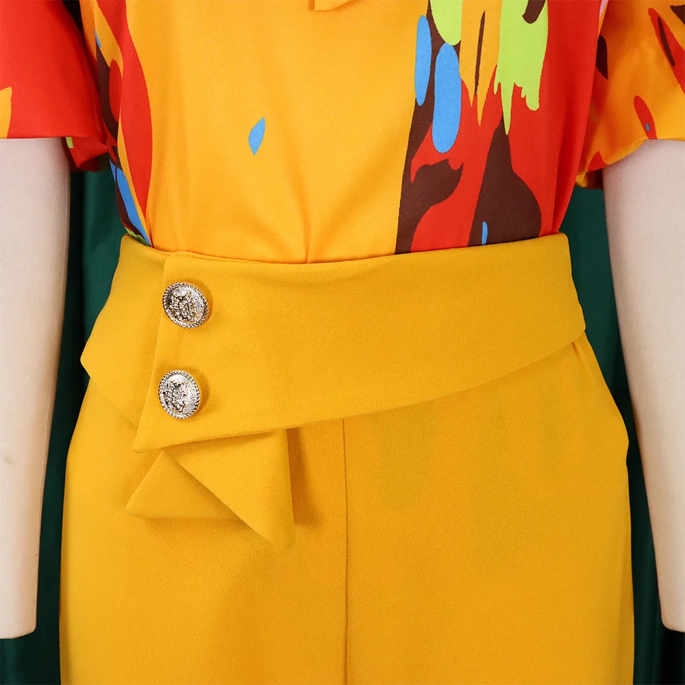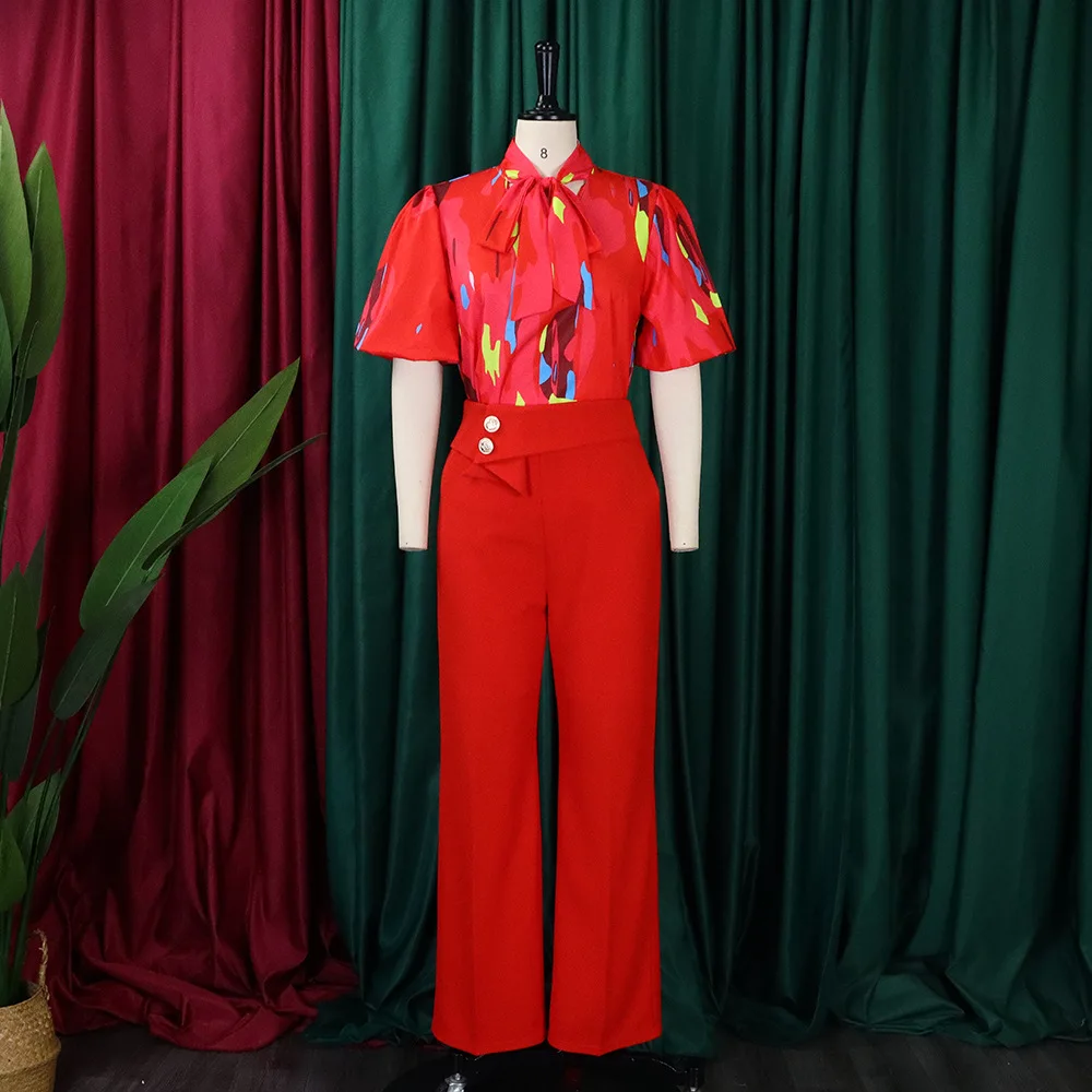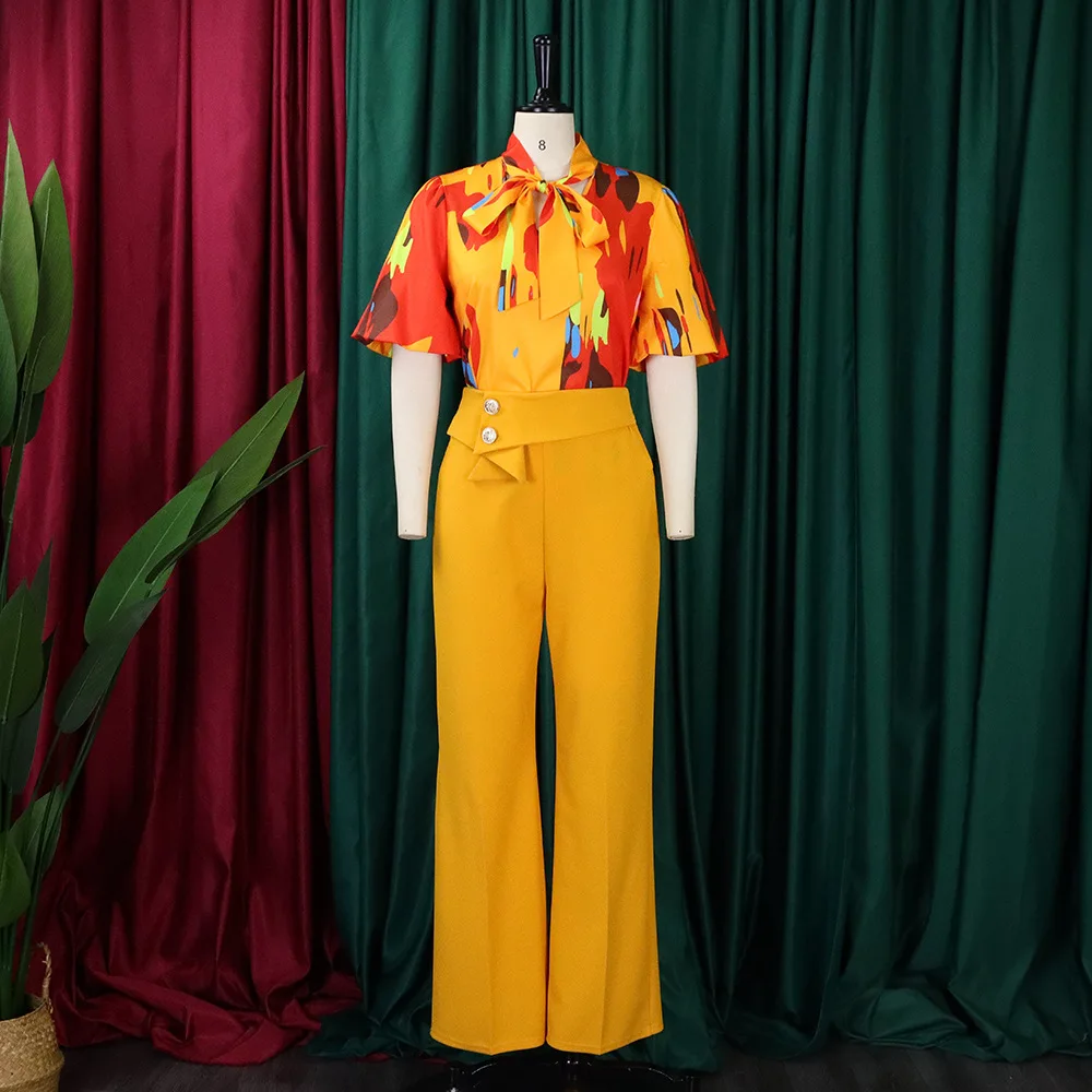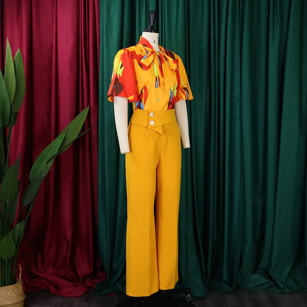 D341 Latest Design Two Piece Set Women Clothing Floral Print Summer Outfits Women Lantern Sleeve Blouse And Wide Leg Pants Set