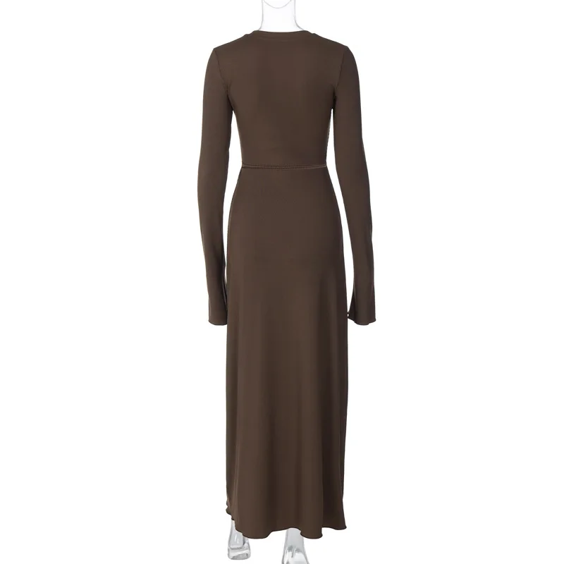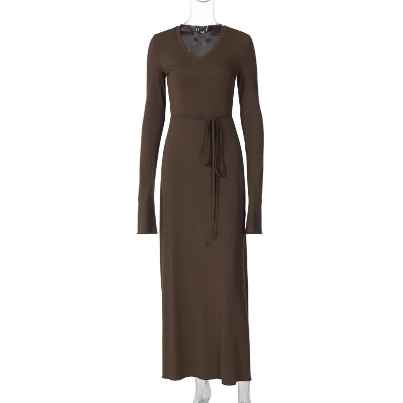 D3914310k Winter New Stylish Women's V-neck Dress Solid Color Lace-up Long-sleeved Maxi Dress Bodycon Party Dress Women