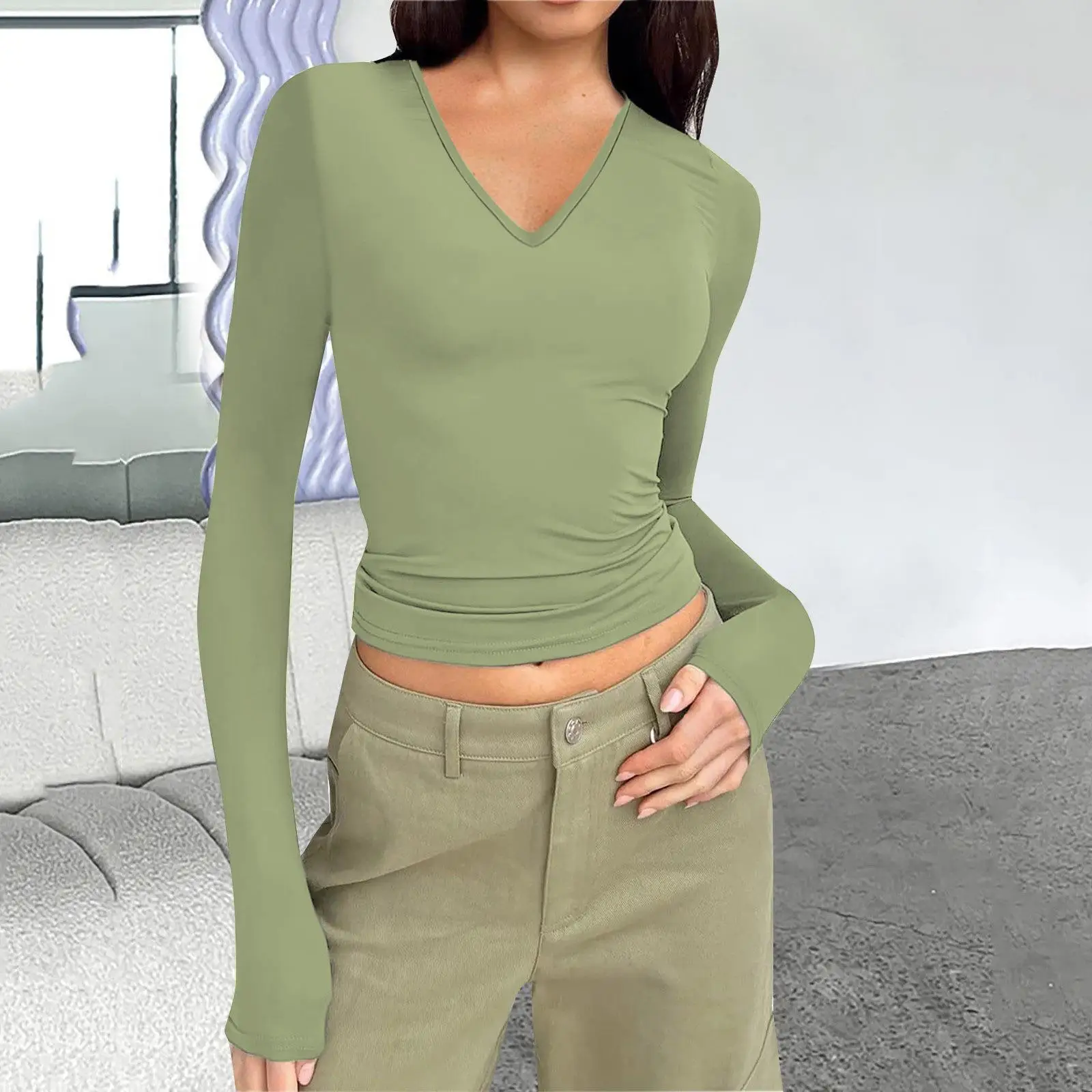 DAMOCHIC Custom Long Sleeve T-Shirt Fall Women Pullover Winter Ladies Tops Solid Color V Neck Slim Fit Basic T-Shirt Women 2023