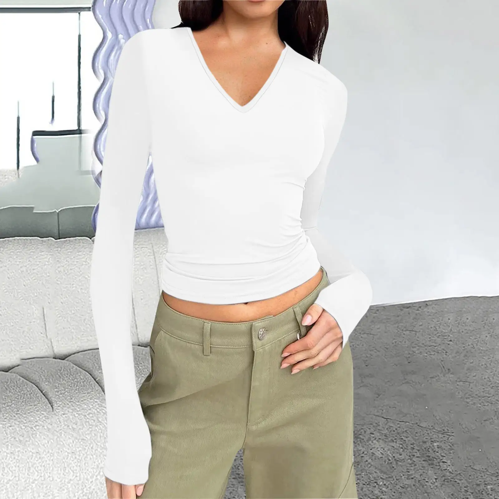 DAMOCHIC Custom Long Sleeve T-Shirt Fall Women Pullover Winter Ladies Tops Solid Color V Neck Slim Fit Basic T-Shirt Women 2023 Wholesale Supplier