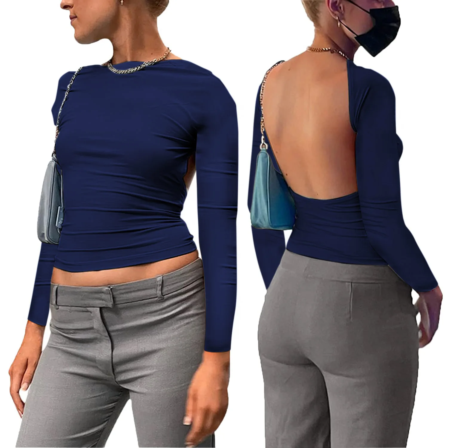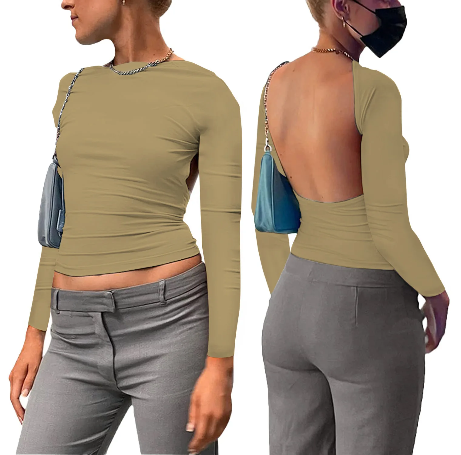 DAMOCHIC Trending T Shirt 2023 New Design Solid Color Backless Tee Fall Skinny Basic Crop Tops Long Sleeve T Shirt Custom Logo
