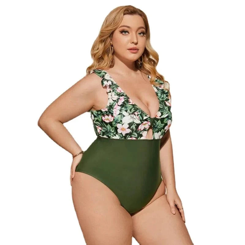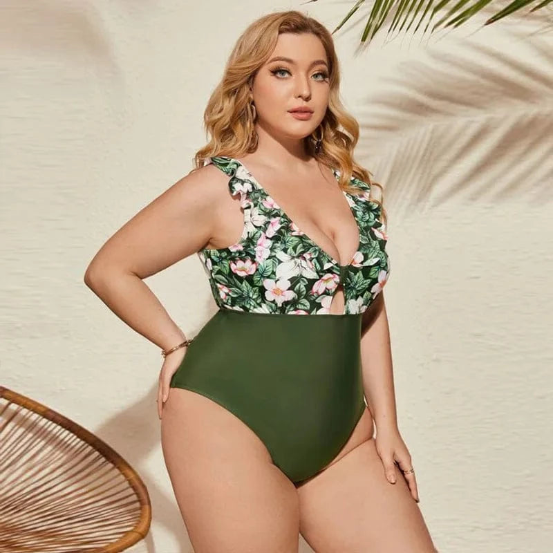 DAMOCHIC Wholesale Printed Women Large Bikini One Piece Swimsuit Big Bust Ruffled Shoulder Plunge Neck Floral Plus Size Swimwear