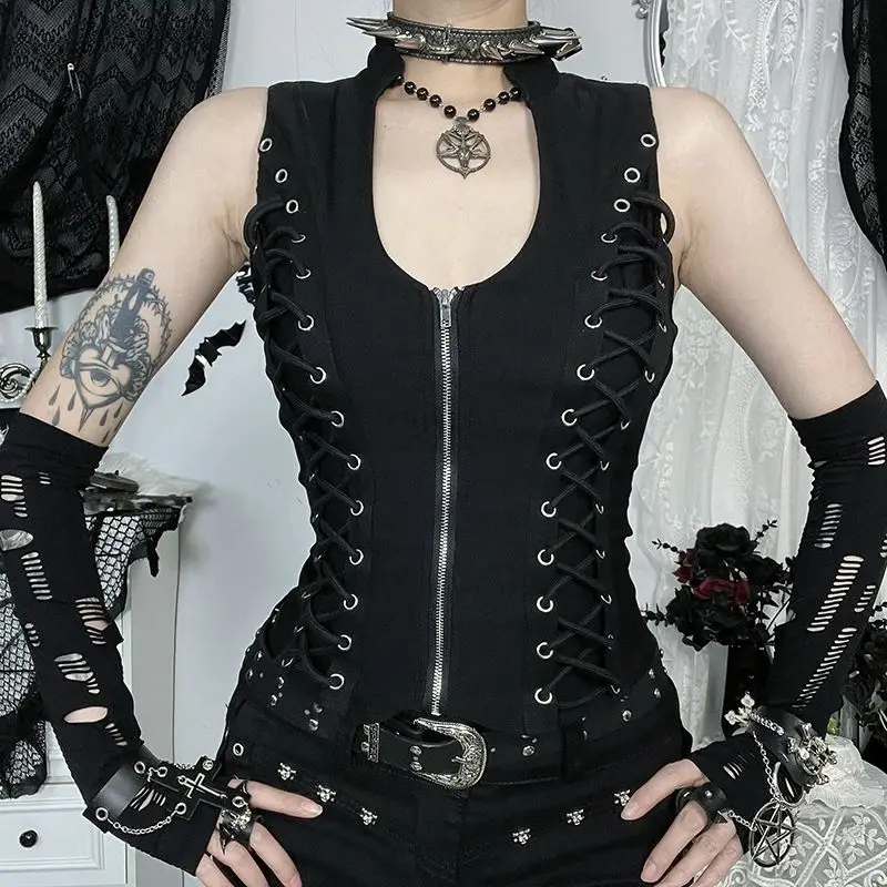Dark Goth Straps Decorative Waist Zipper Vest Hip-hop Metal Rock Style Black Popular Suspender Feminine Outfit Tight Street Top