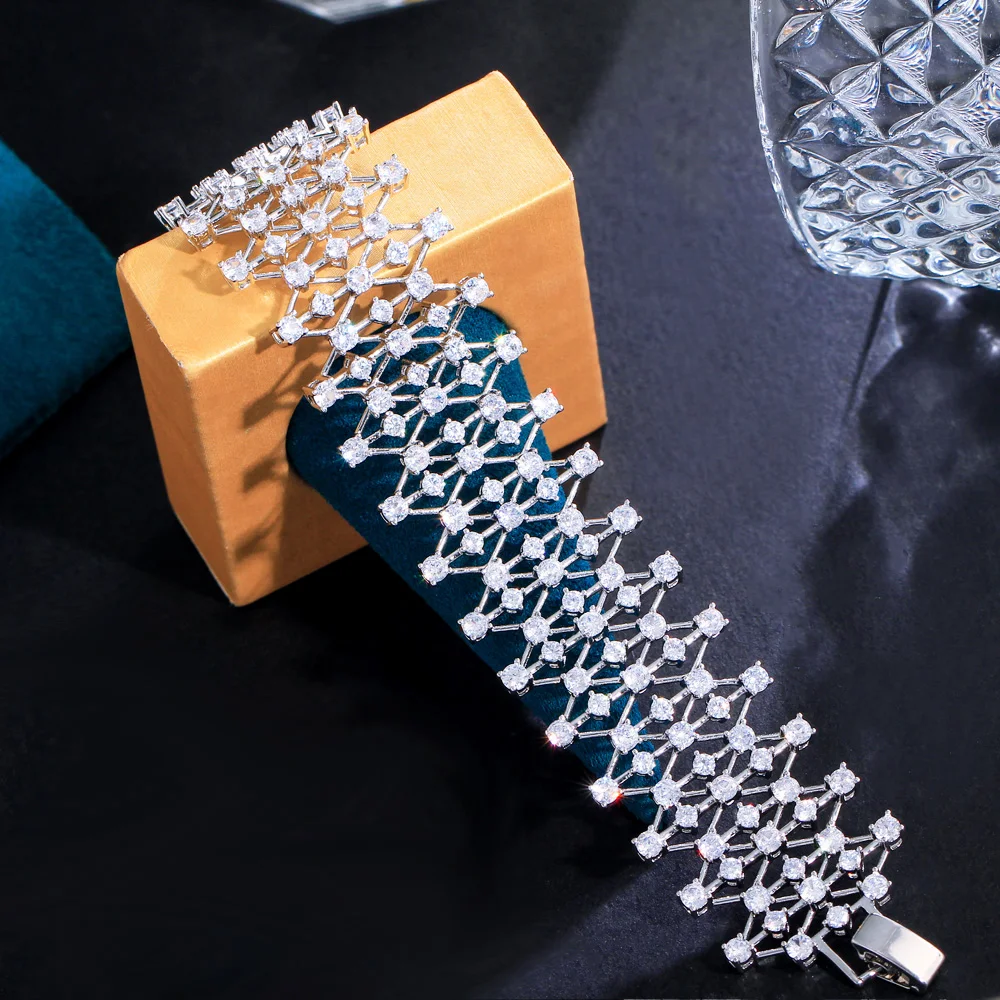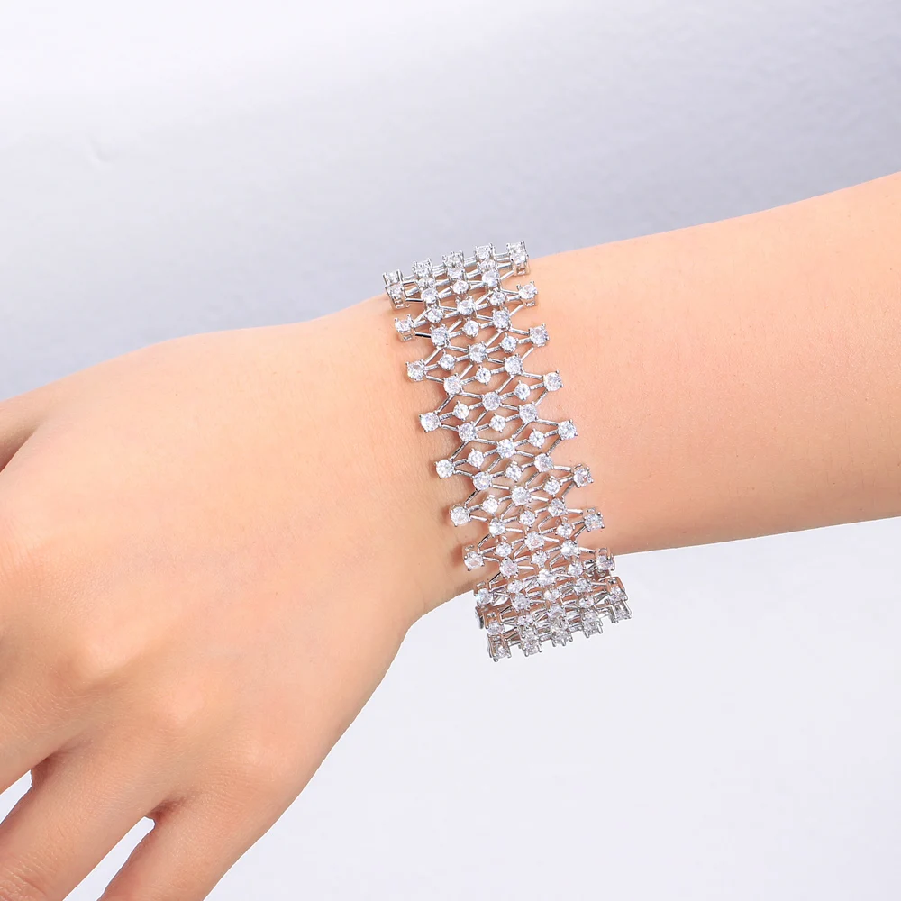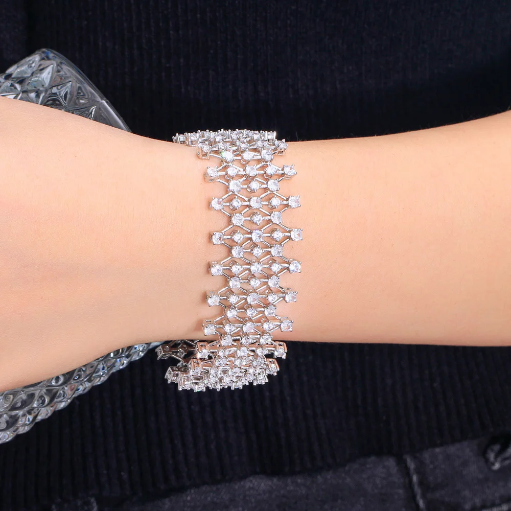 Dazzling Cubic Zirconia Stone Hollow Jewelry Chunky Bling Fancy Big Wedding Dress Bracelet for Women Bridesmaid Accessories