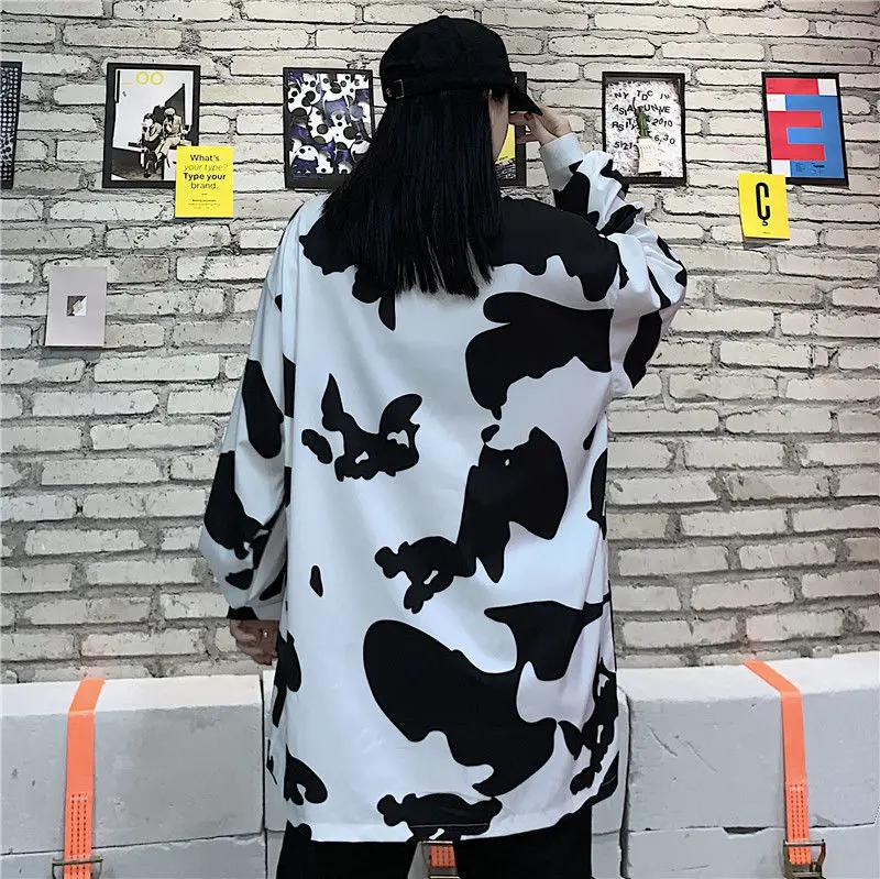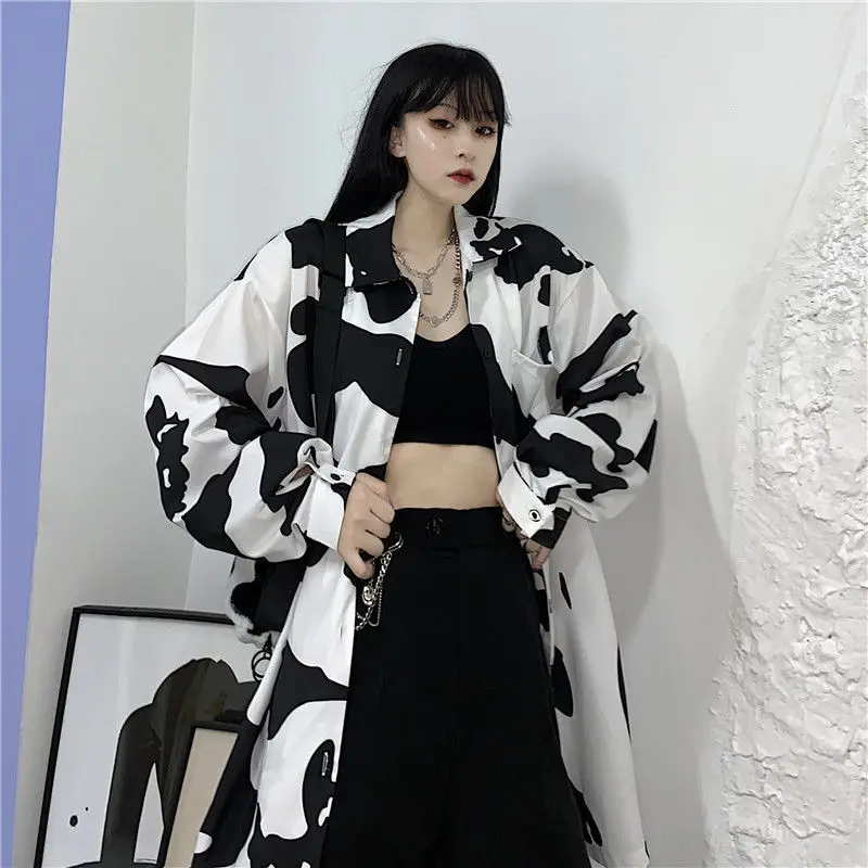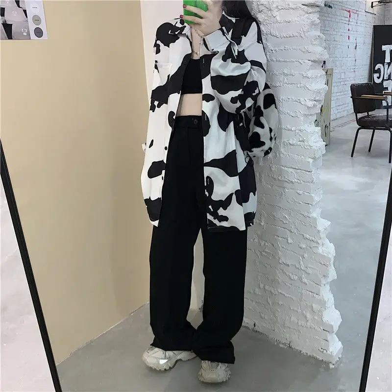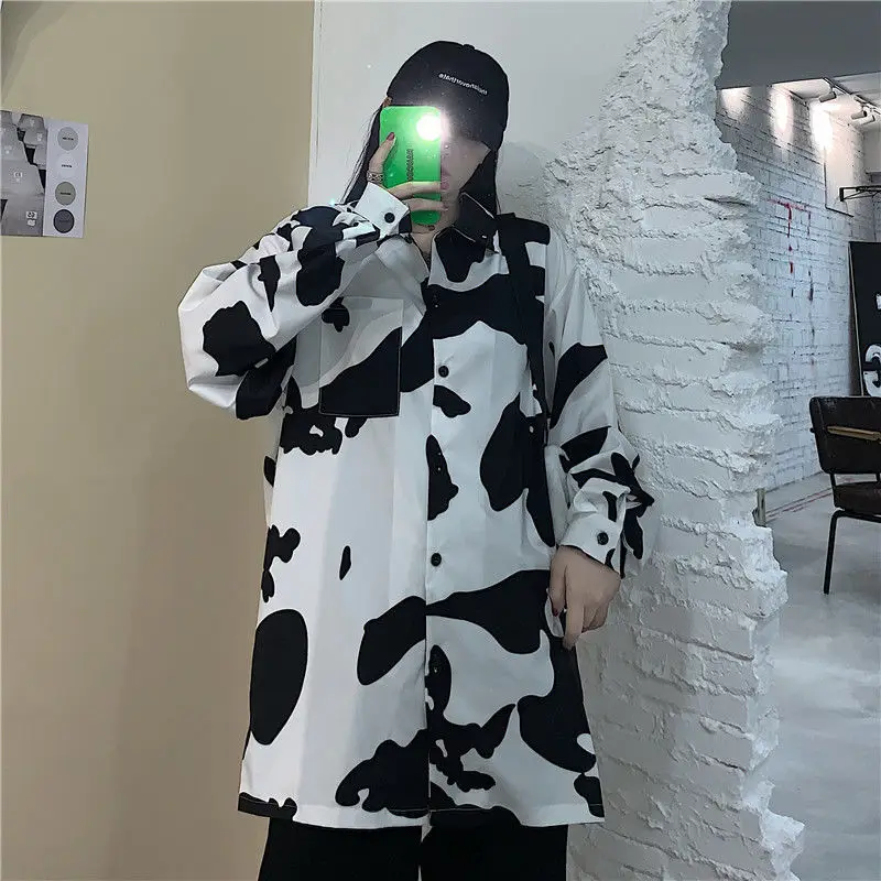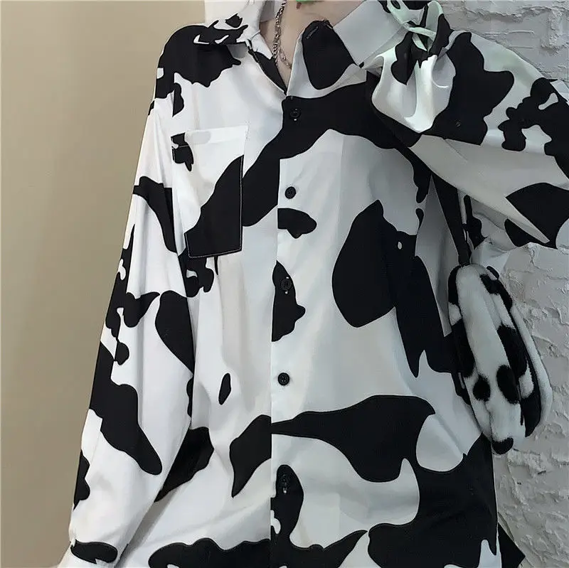 Deeptown Cow Print Women Blouses Korean Style Fashion Spring 2022 Button Up Shirt Loose Long Sleeve Women Shirt Leisure Tops
