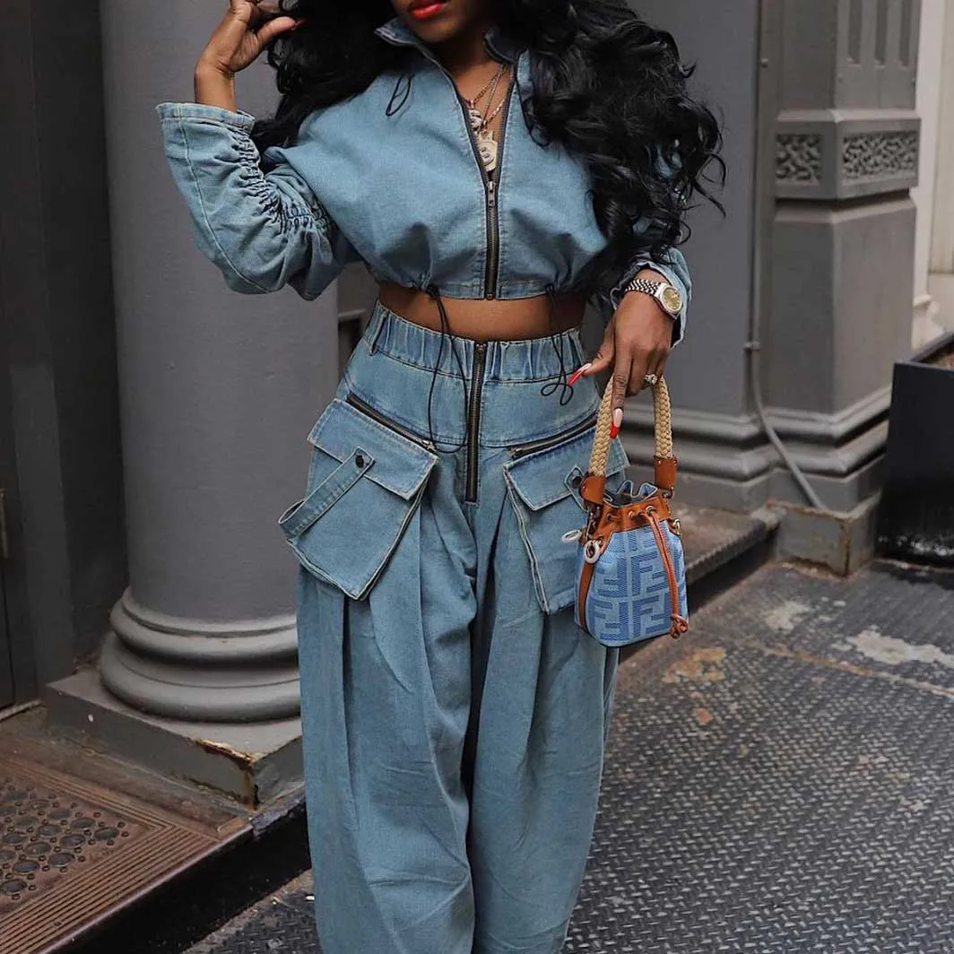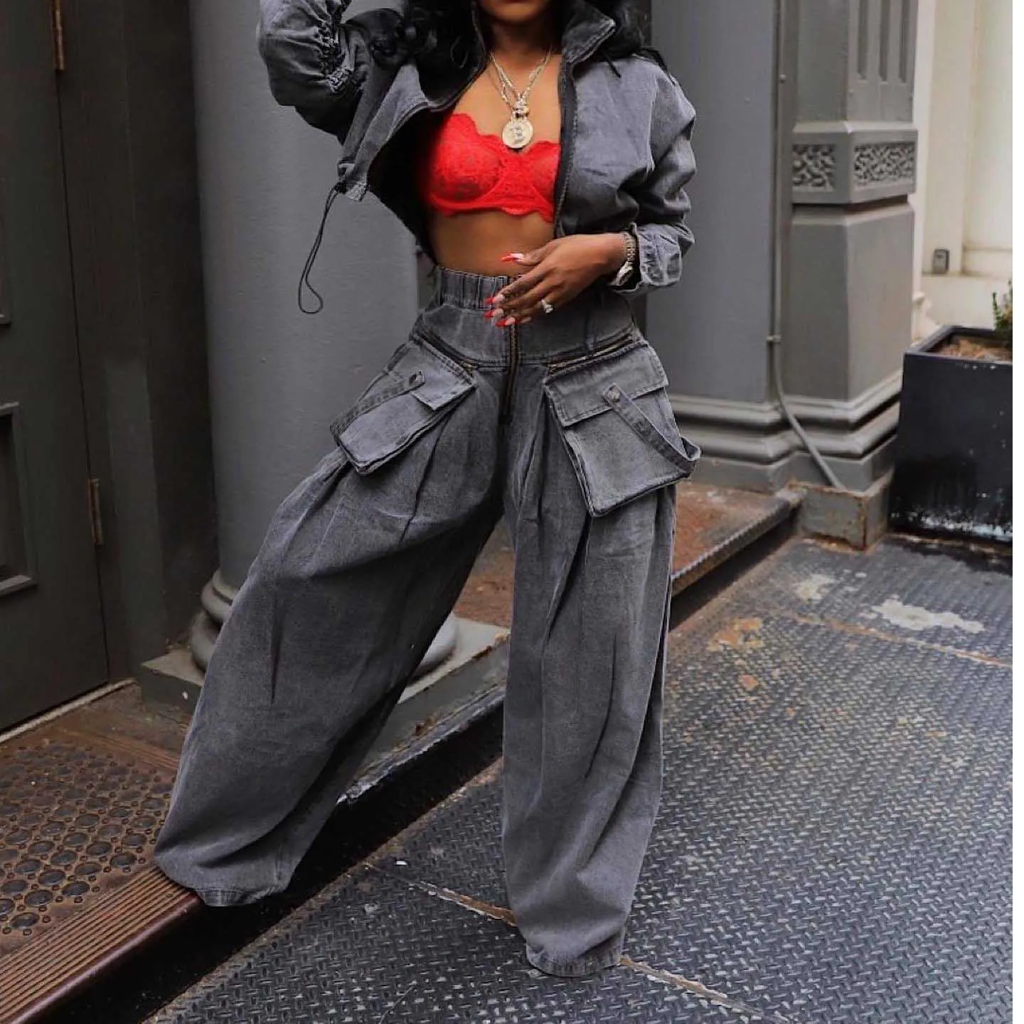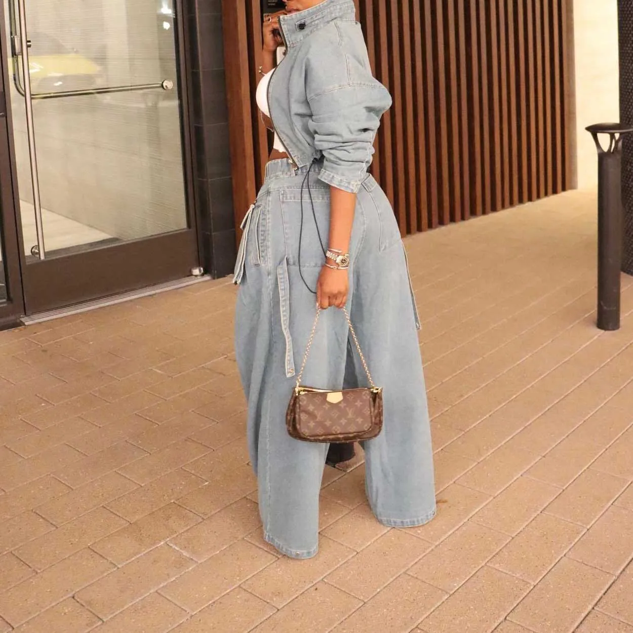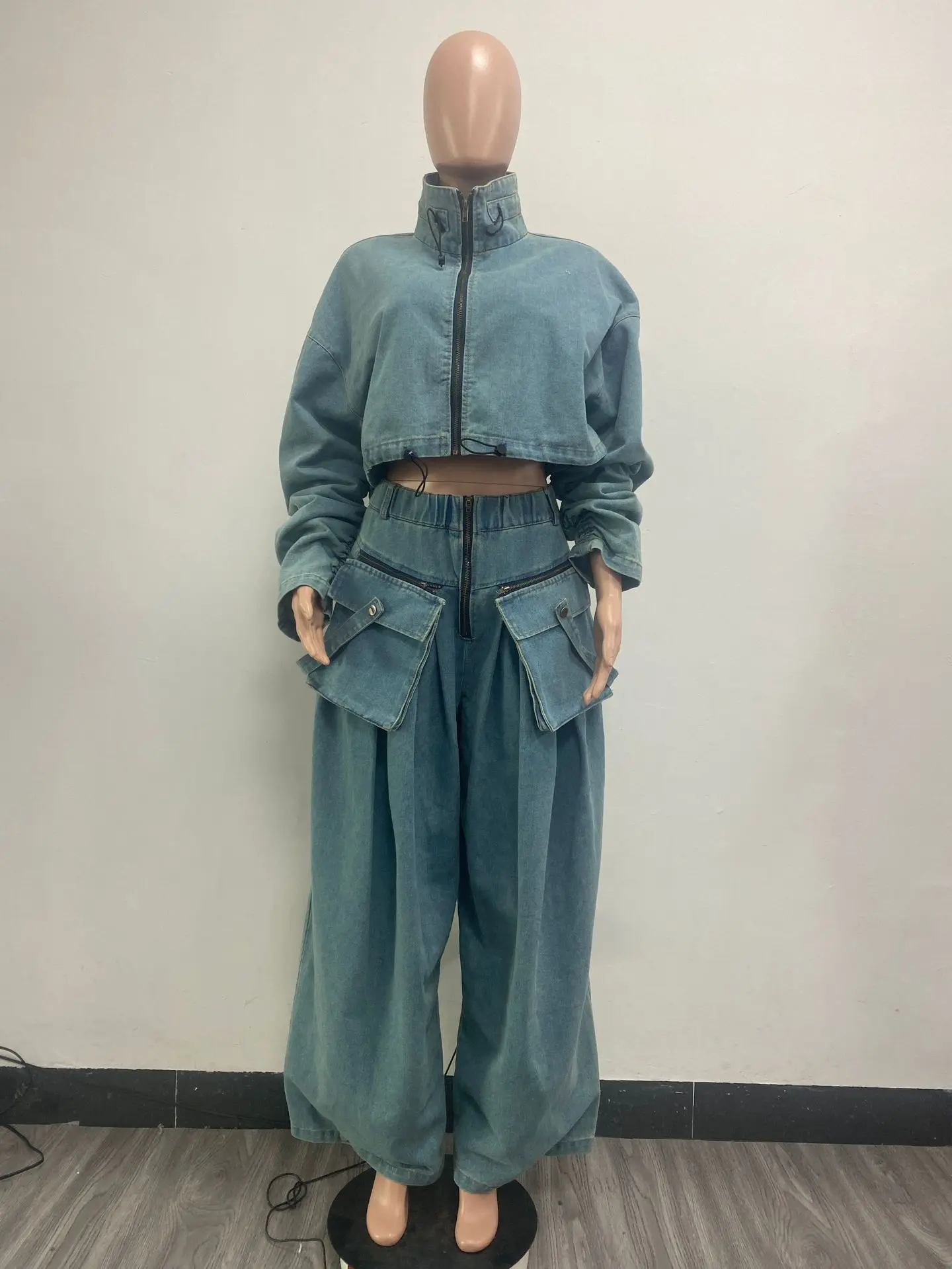 Denim Cargo 2 Piece Set Women Stand Collar Long Sleeve Zip Jeans Jackets Crop Top Pockets High Waist Wide Leg Pants Suits