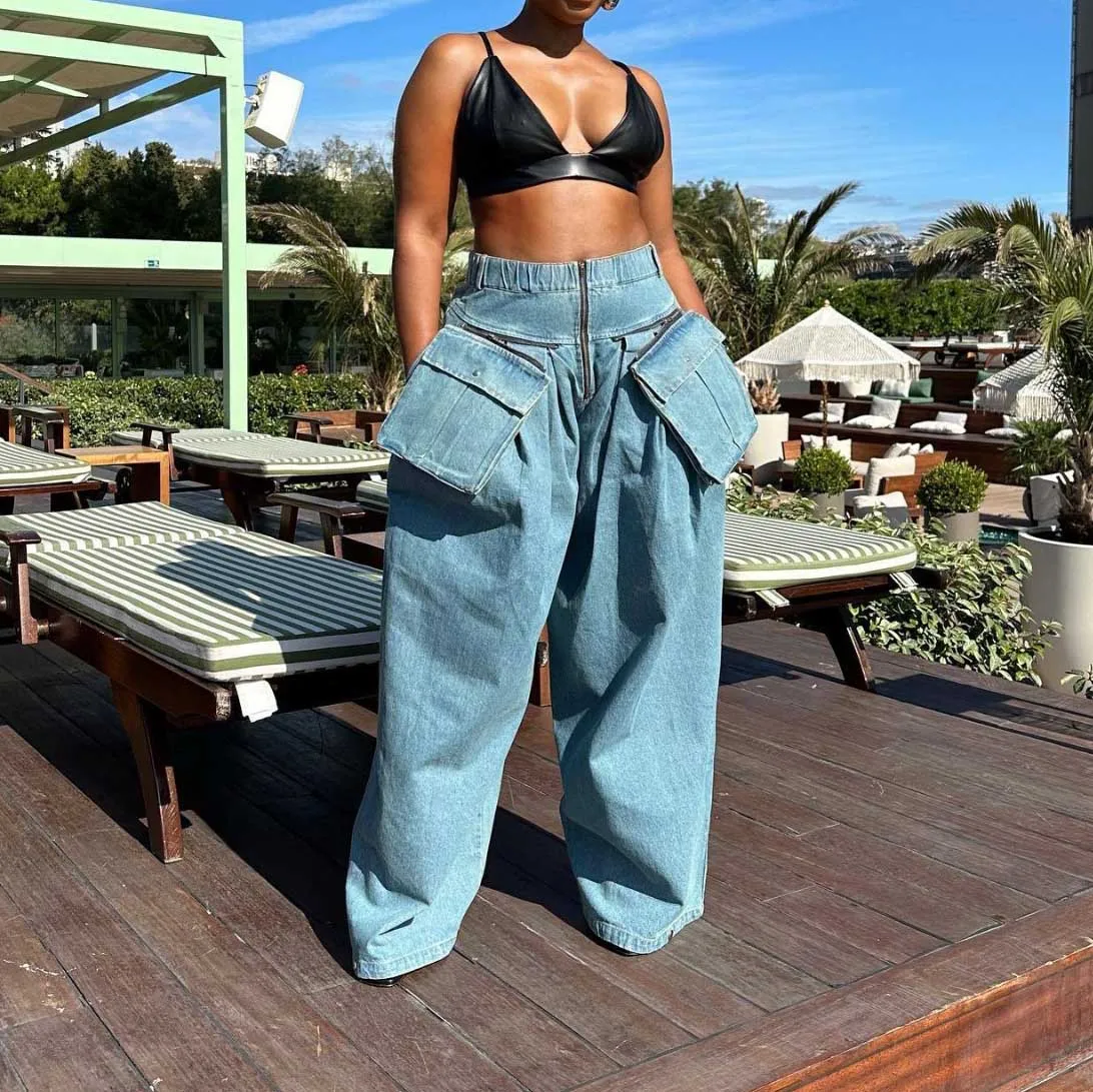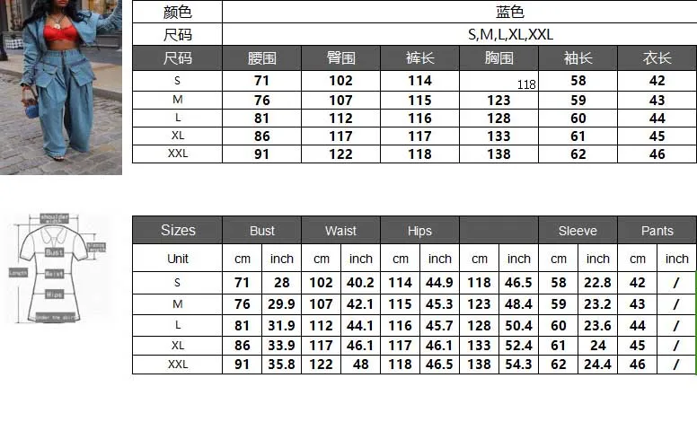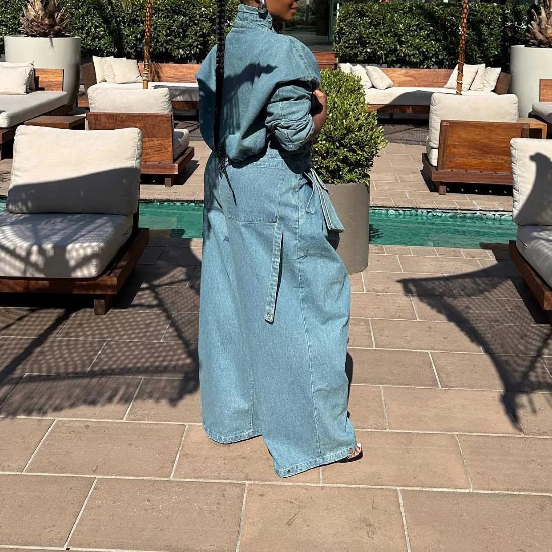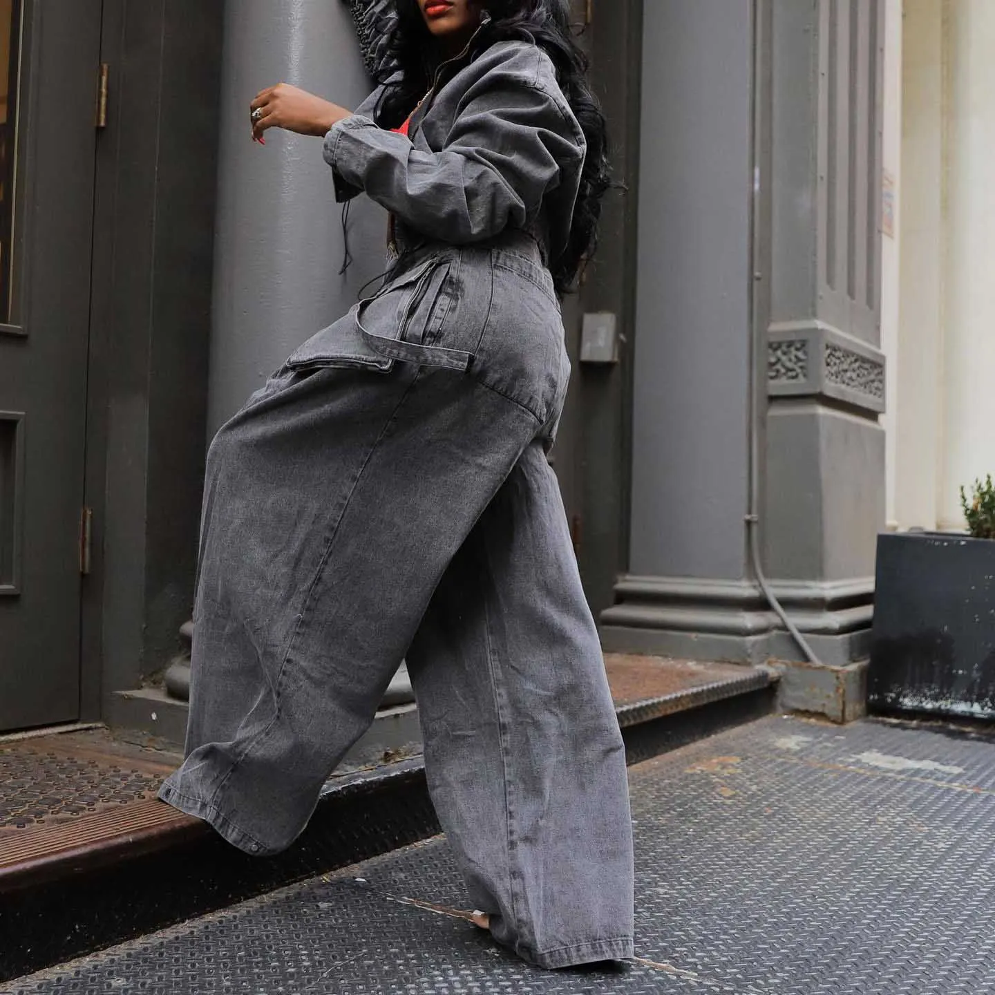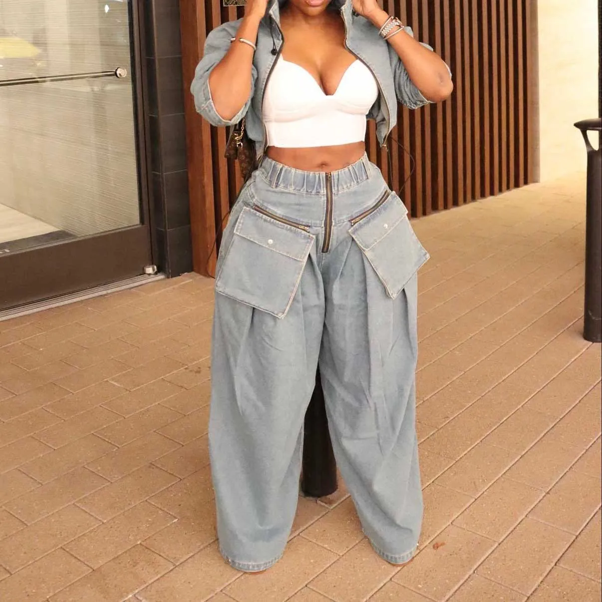 Denim Cargo 2 Piece Set Women Stand Collar Long Sleeve Zip Jeans Jackets Crop Top Pockets High Waist Wide Leg Pants Suits