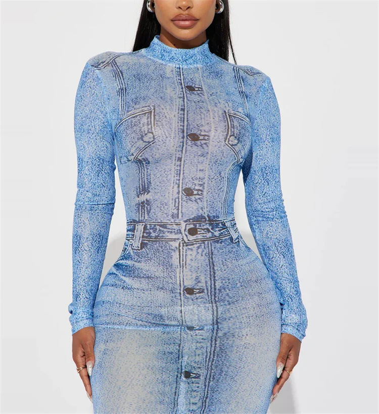 Denim Print Long Sleeve Maxi Dresses Vacation Outfits For Women 2023 O Neck Bodycon Long Dress