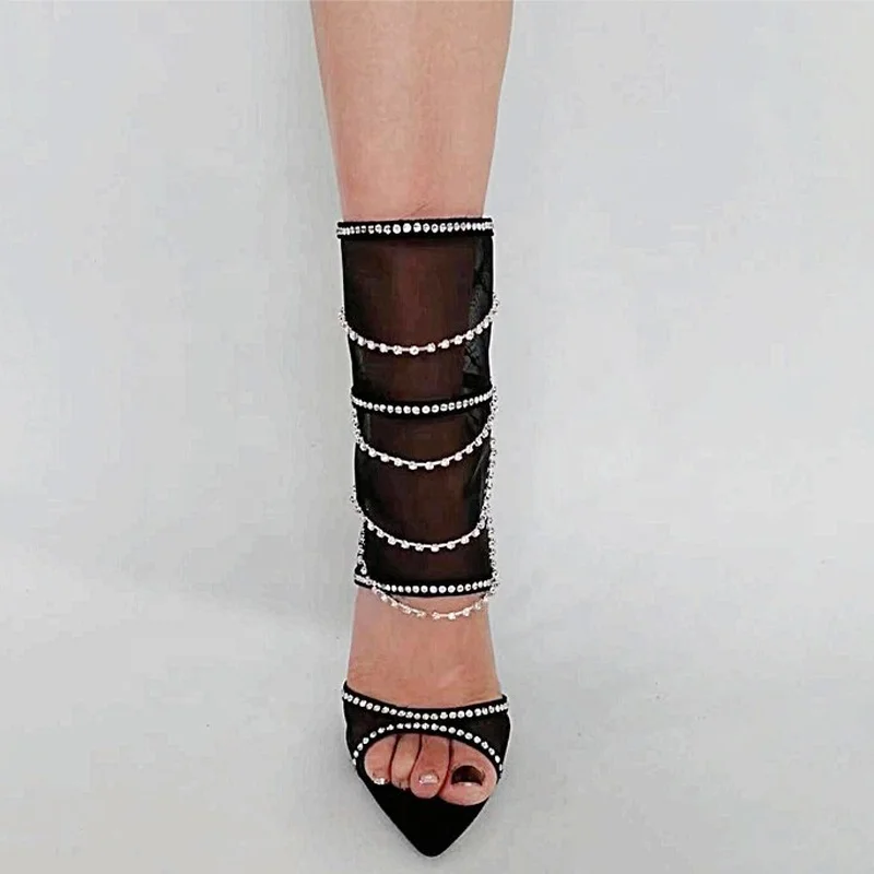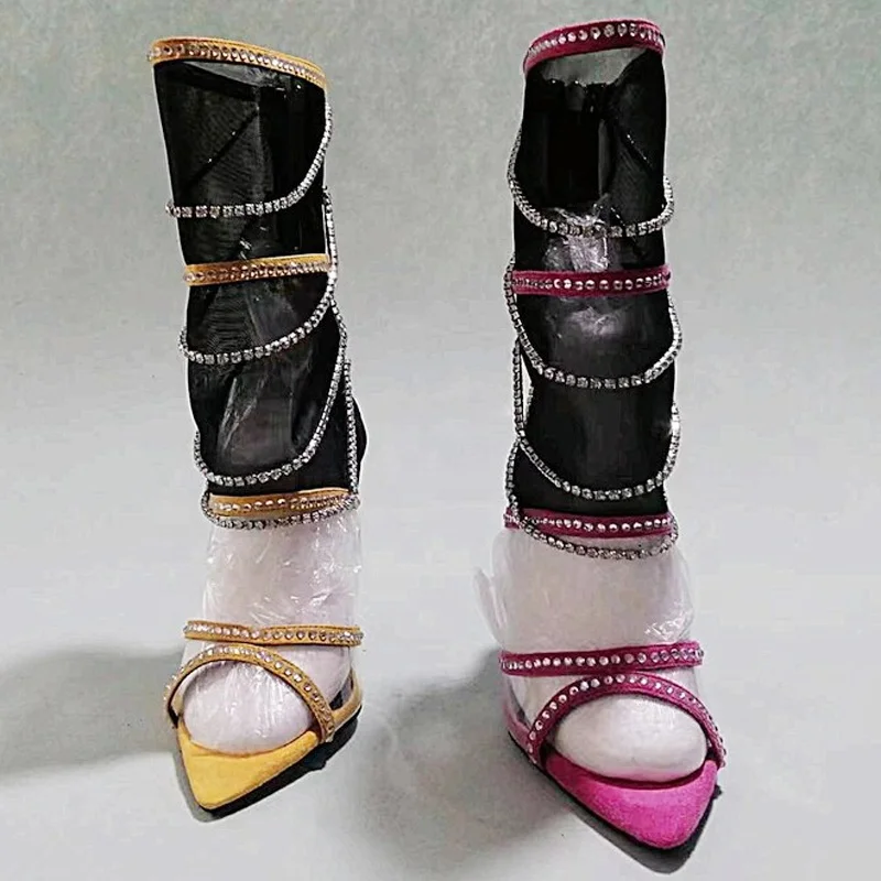 Designed Summer Mesh Upper High Heels Women Cut Out Sandals Shiny Diamonds Short Ankle Boots Soft Suede Pumps