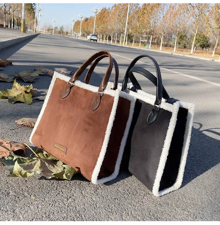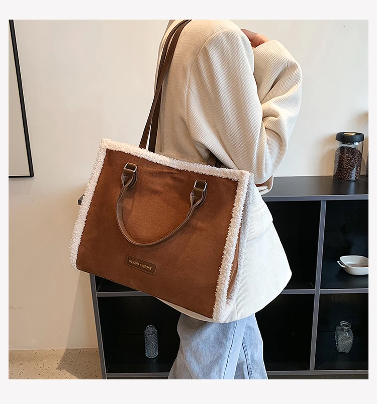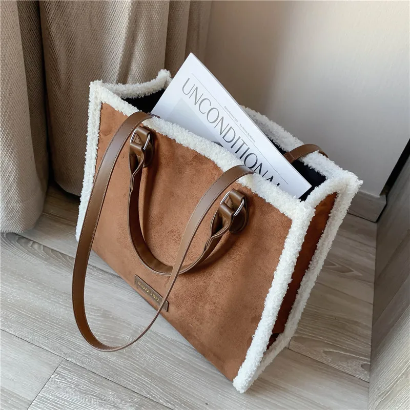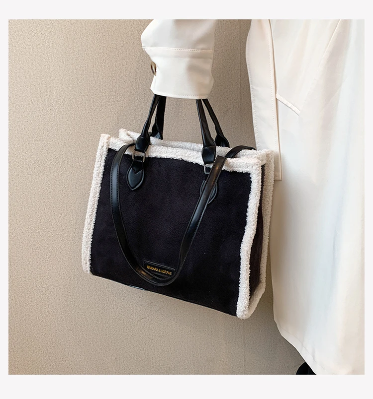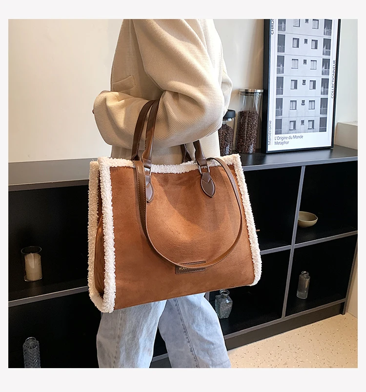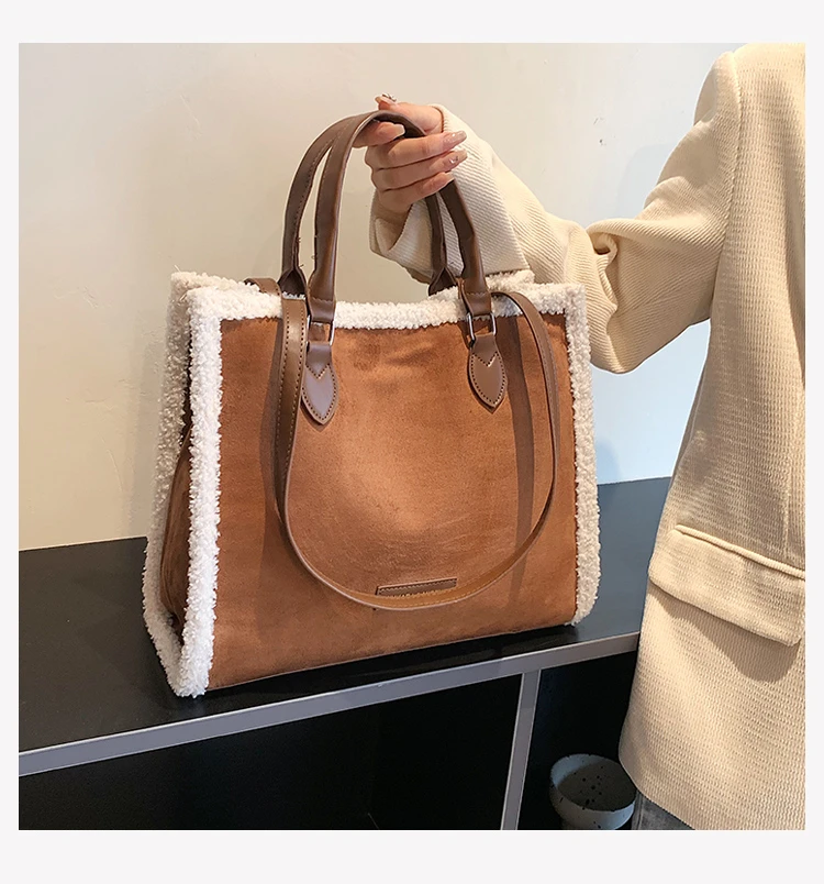 Designer Vegan Leather Tote Bag Big Faux Shearling Trim Inclined Shoulder Bag Lady Suede Handbags for Women Luxury Custom Logo