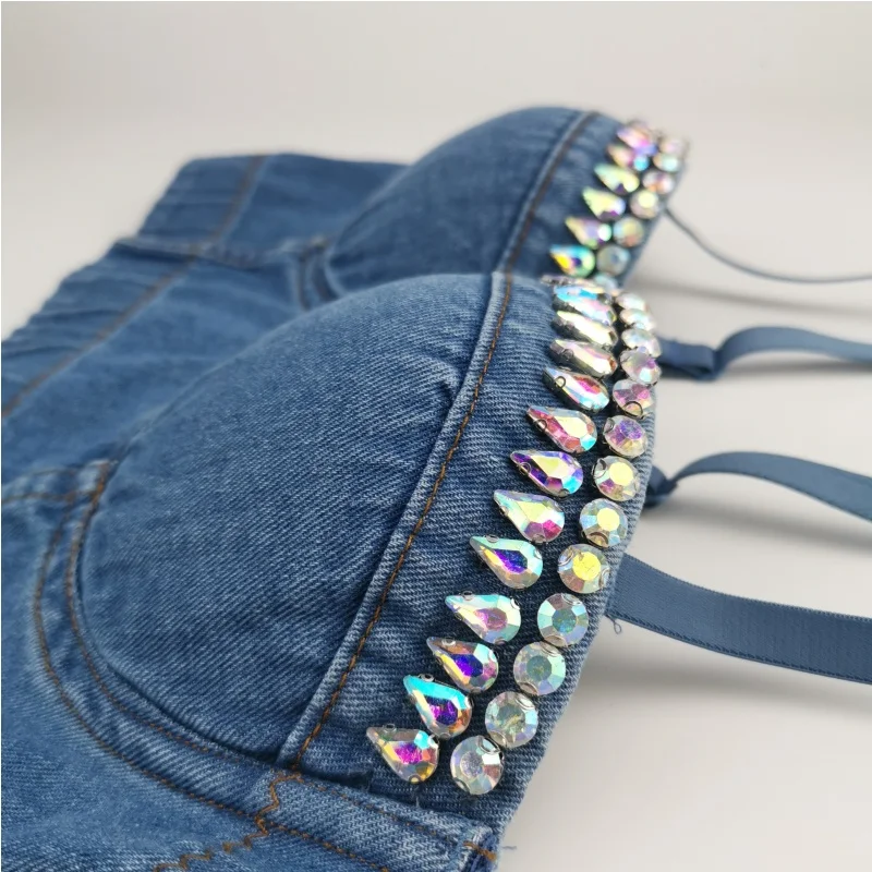 Diamond Denim Sling Vest Sexy Deep V Open Back Women Beach Bra Summer Top