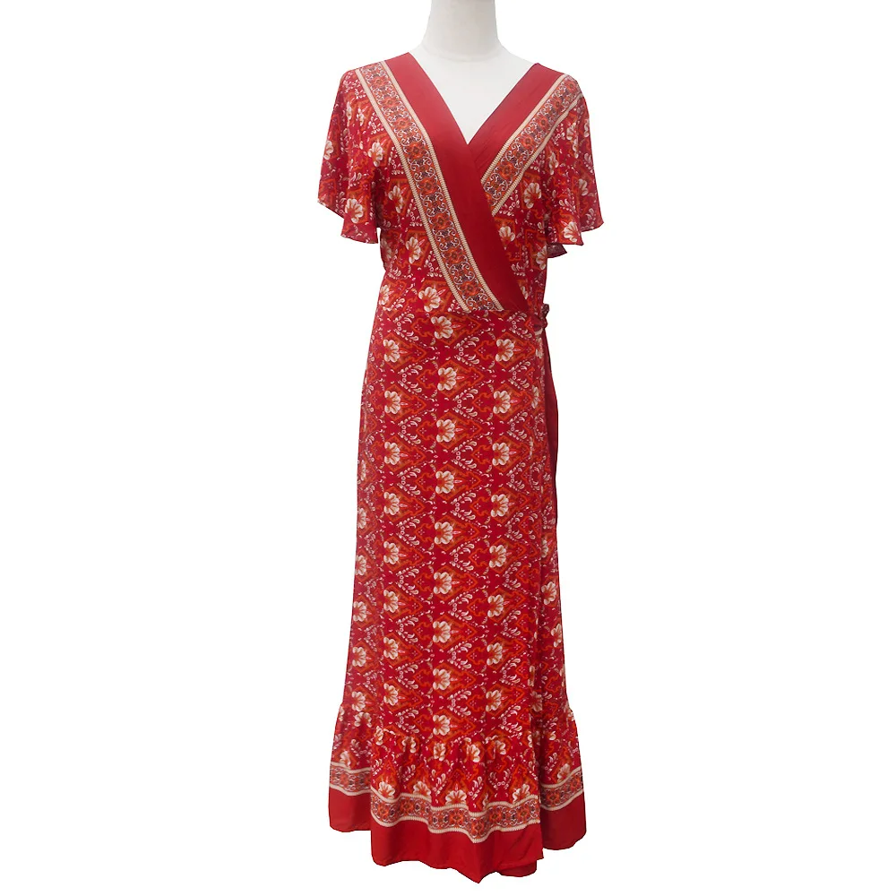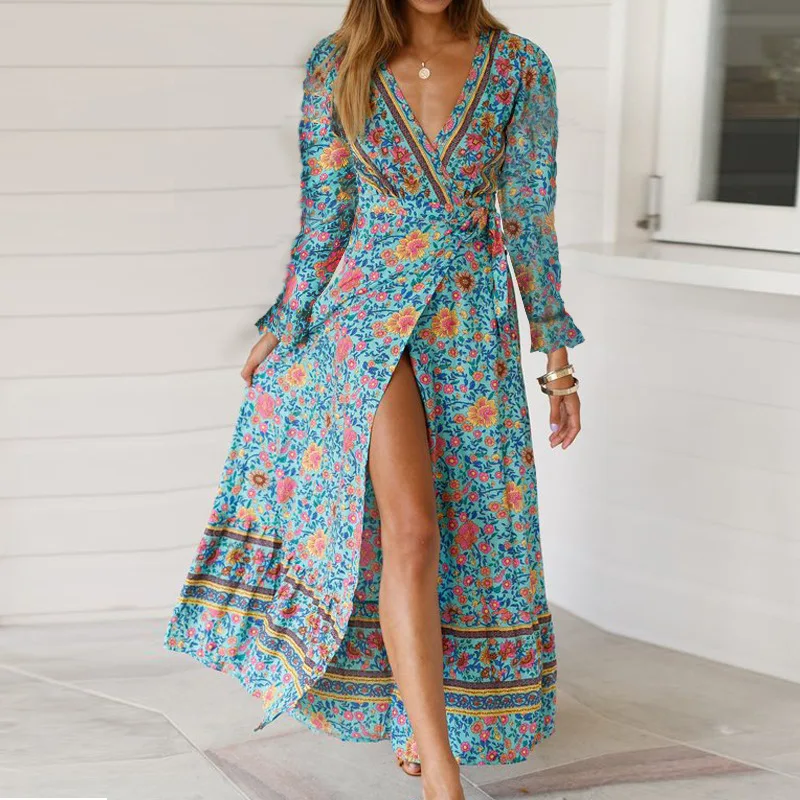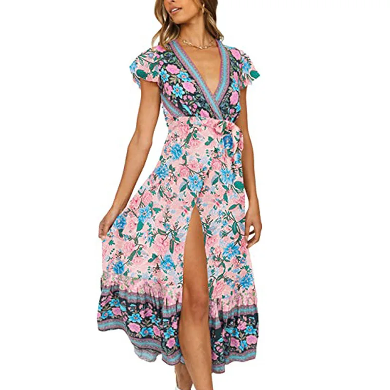 Dress Summer Beach Bohemian Vestidos Rayon Boho Casual Wrap Maxi Flower Floral Dress