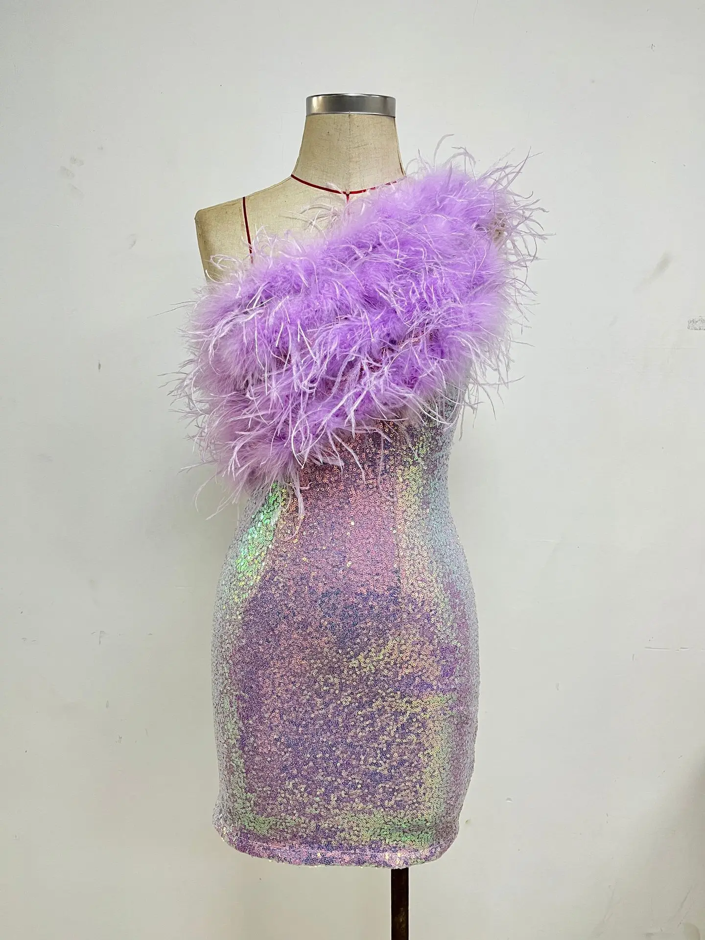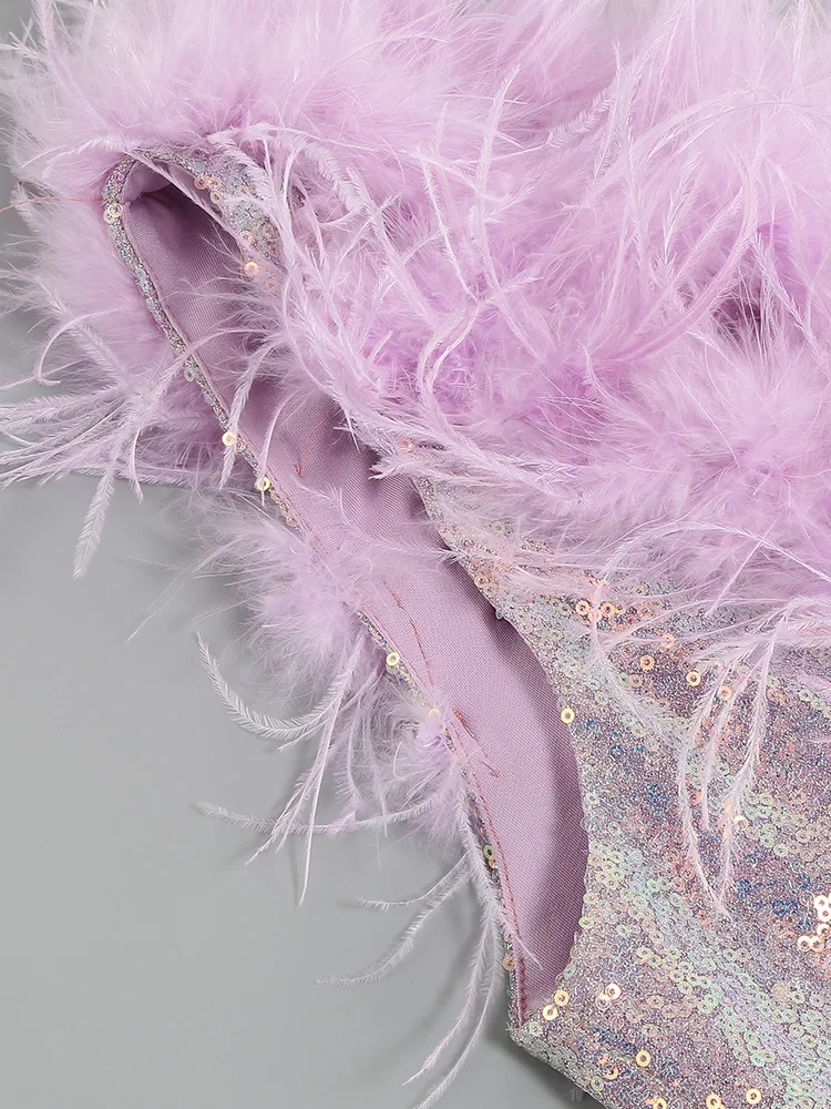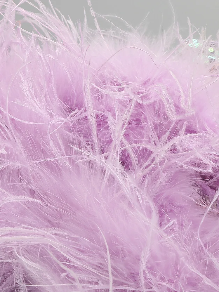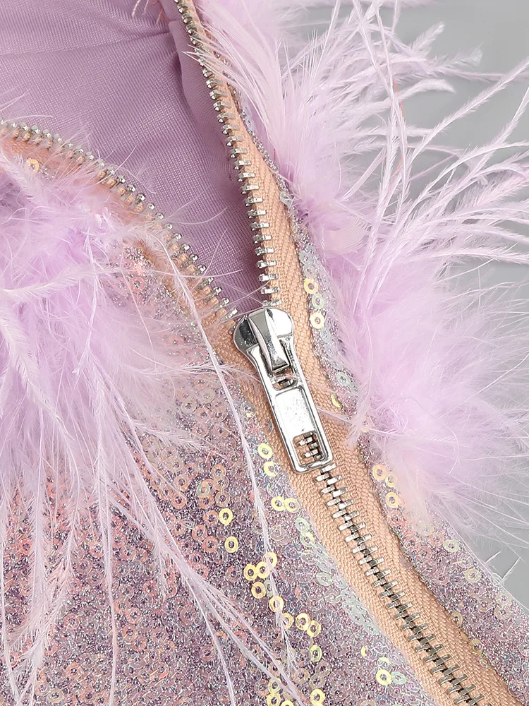Elegant Sequin Lavender Strapless Feather Evening Party Dress Women
