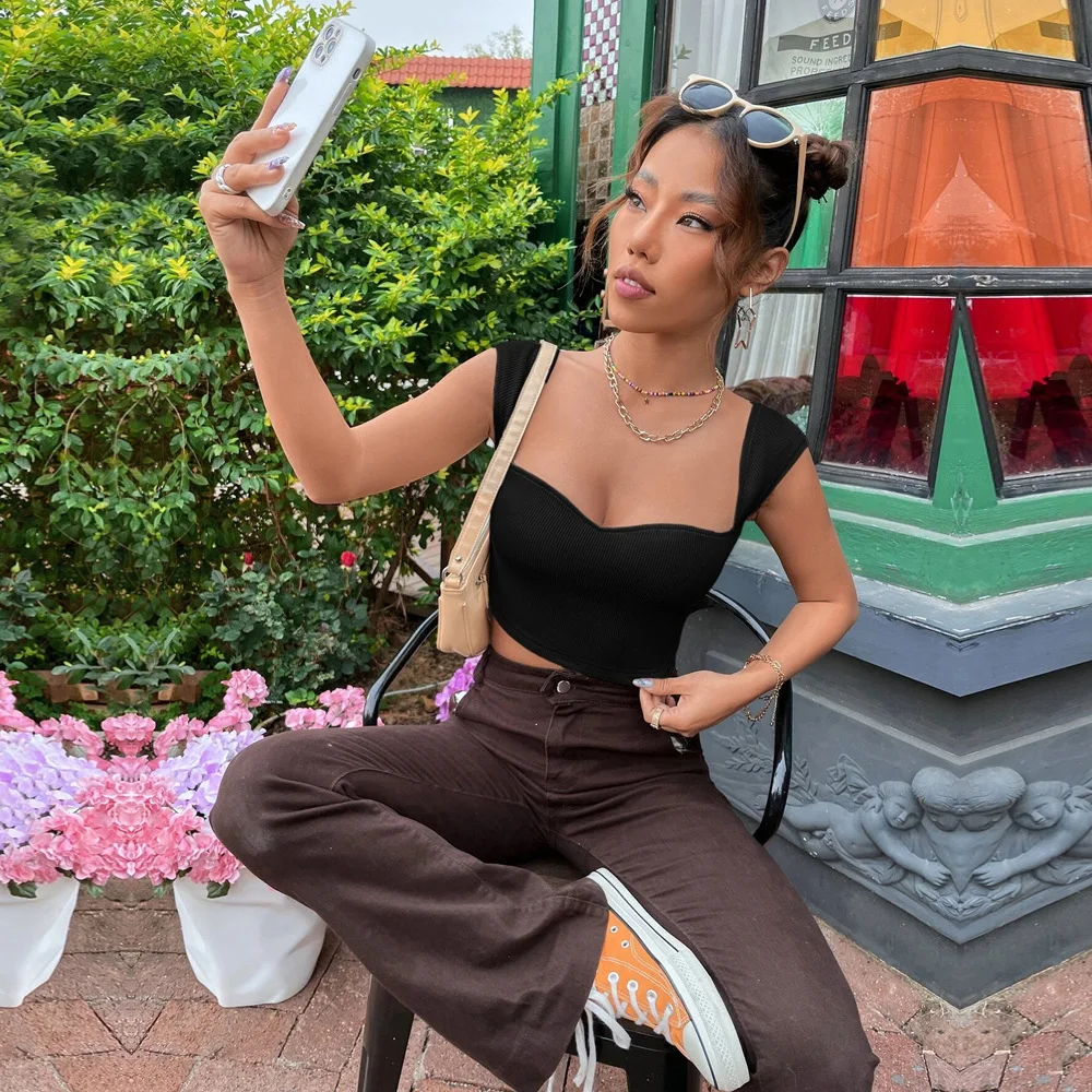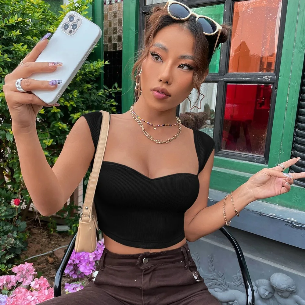 Drop Ship 2023 Women Crop Blouse Hem Square Neck Solid Color Bust Top
