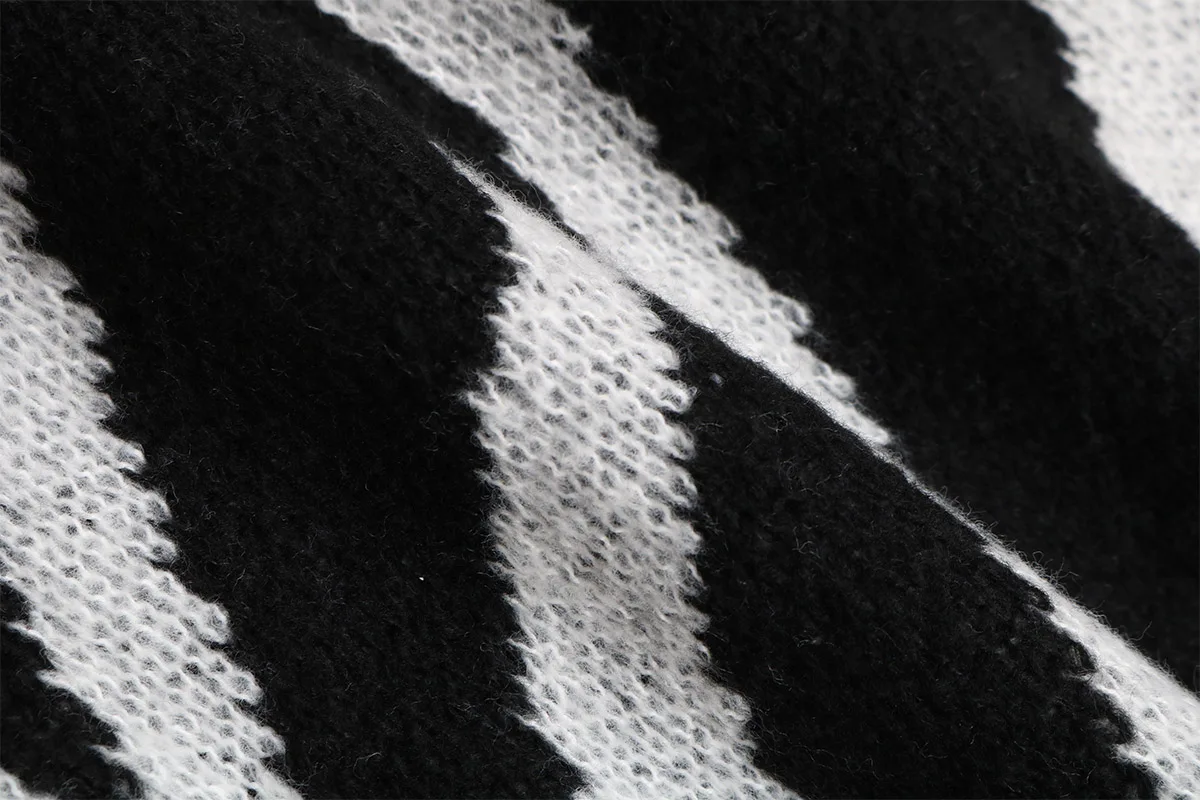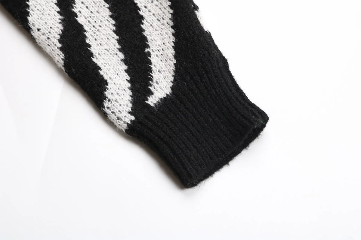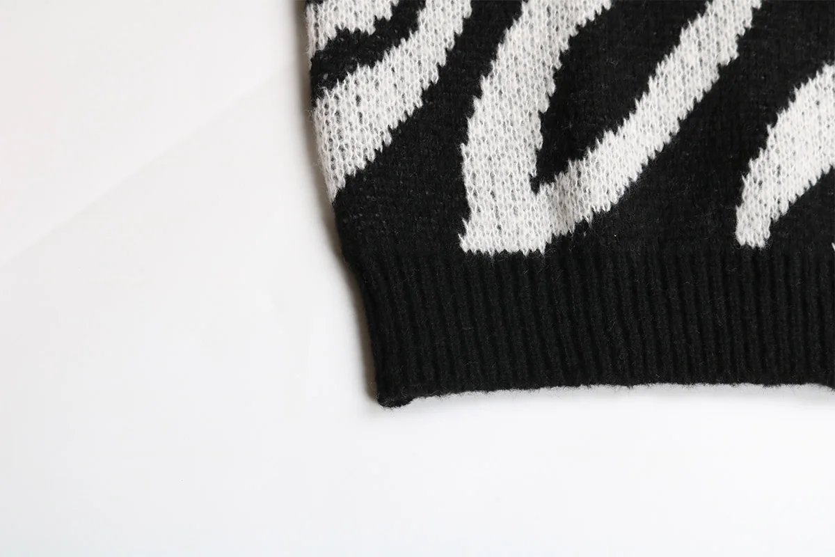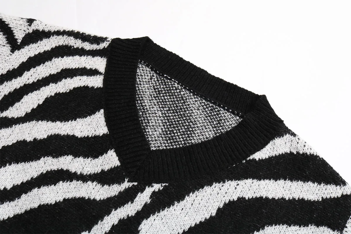 Drop Shoulder V Neck Zebra Striped Knit Women Casual Sweater