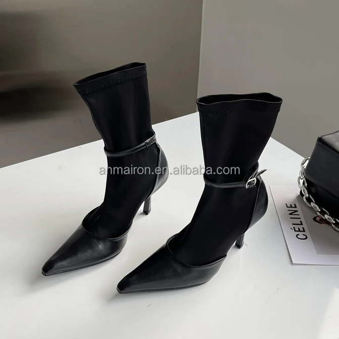 Dropshipping black leather sock and sandals boots ANMAIRON wholesale price stain boots pointed toe womens pumps