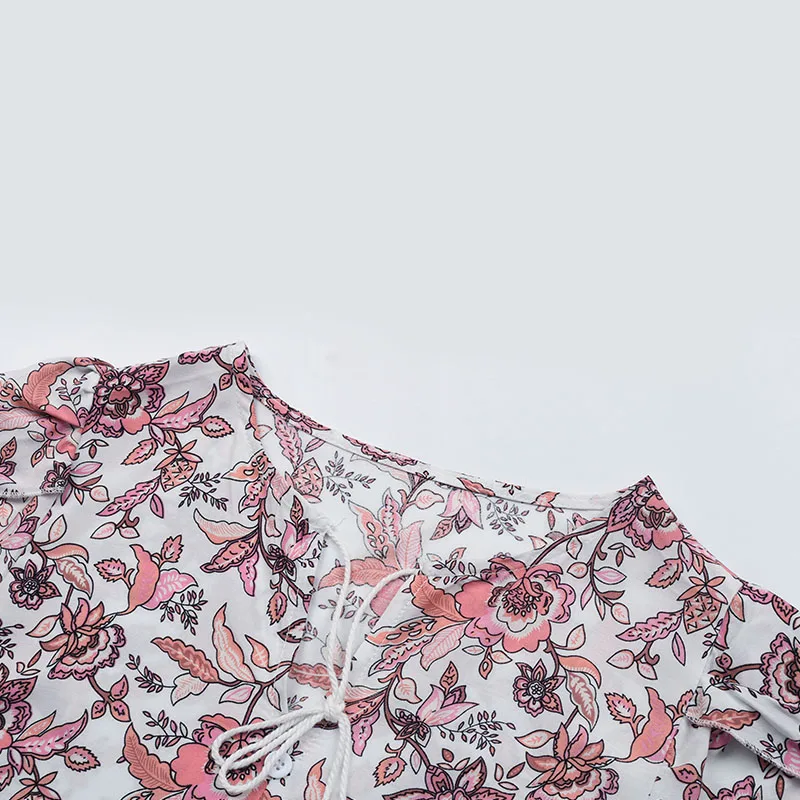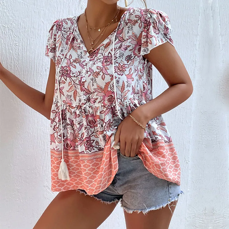 Dropshipping Blouse Vintage Designs Clothes Short Sleeve V Neck Floral Print Bohemian Summer Women Printed Blouses