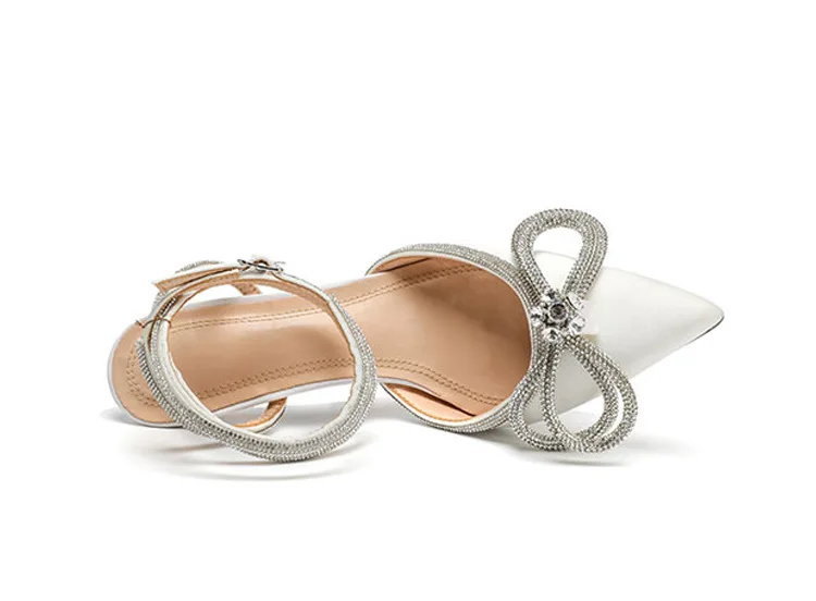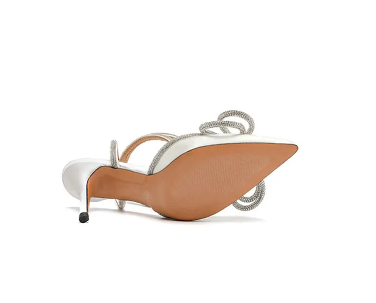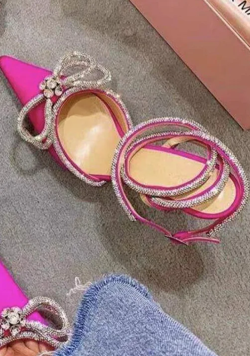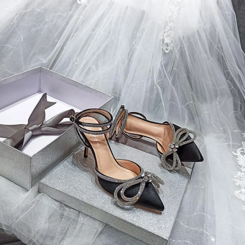 Dropshipping Custom Logo Women Rhinestone Bow Pointed Toe Satin Heeled Sandals Ladies Lace Up Stiletto Heels Dress Shoes