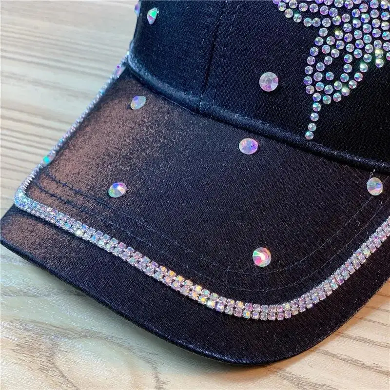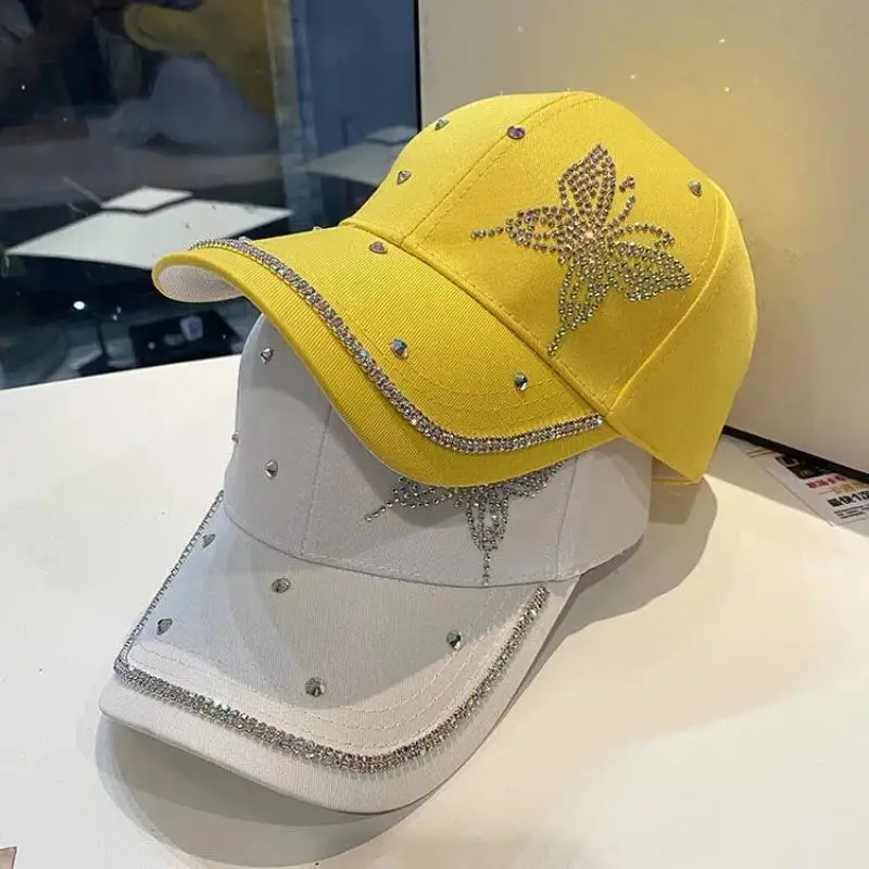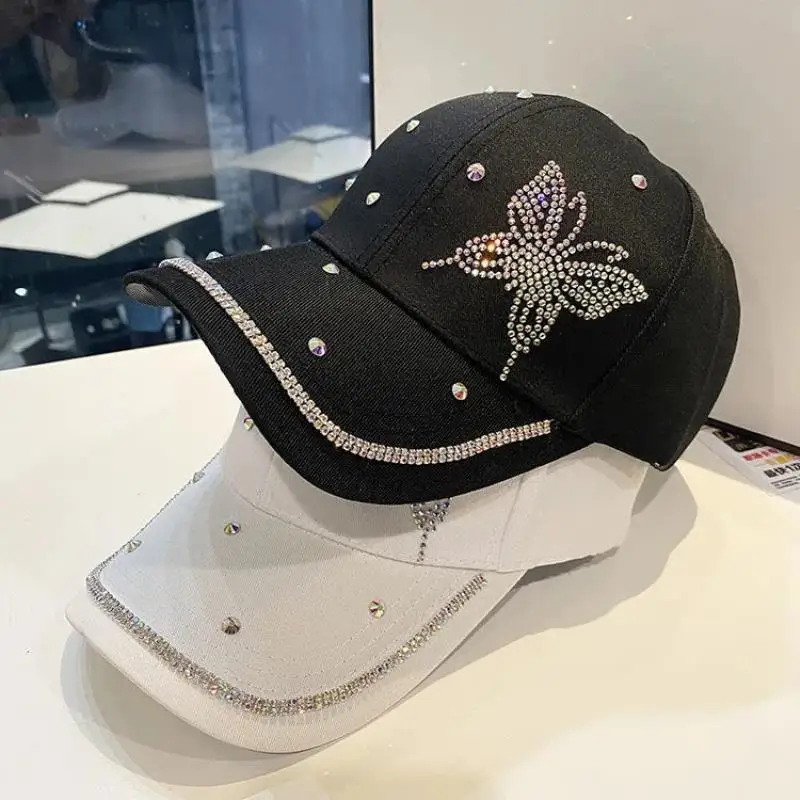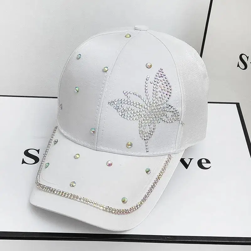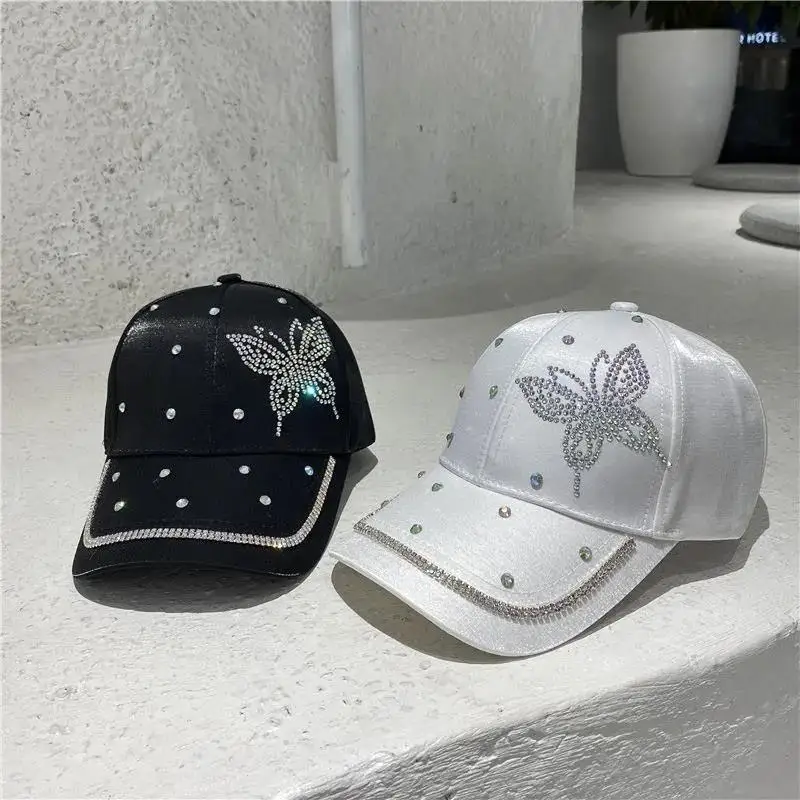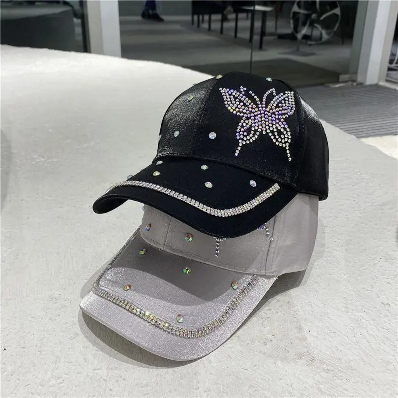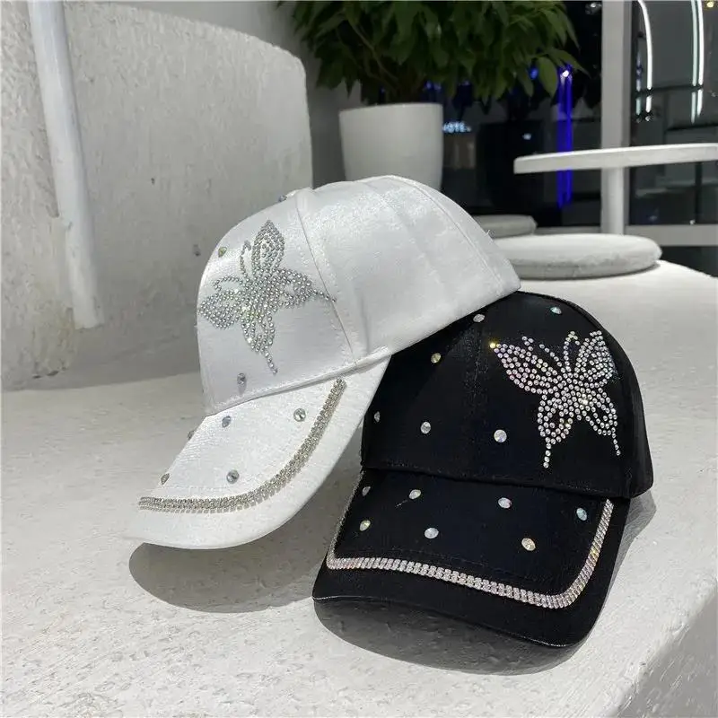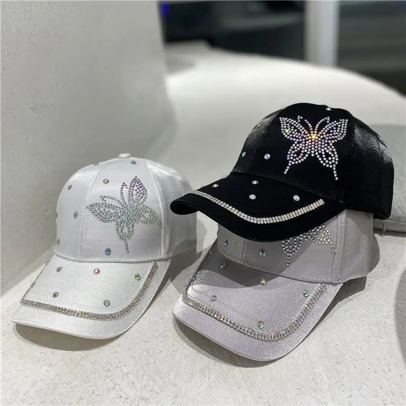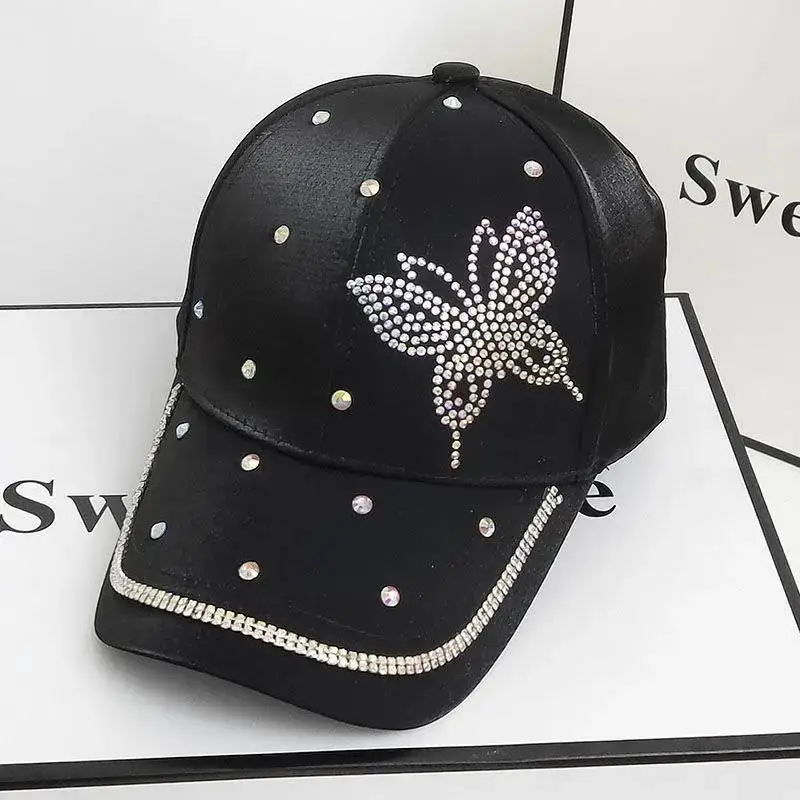 Dropshipping Jeans Crystal Shiny Travel Sunshade Rhinestone Butterfly Baseball Cap Fashion Satin Sunscreen Visor Cap