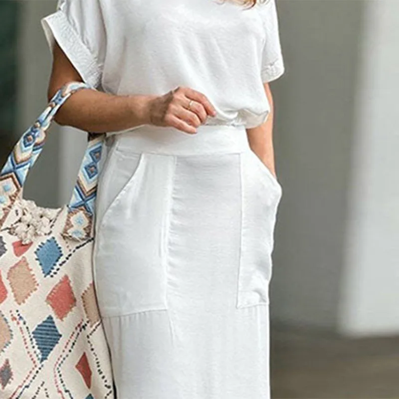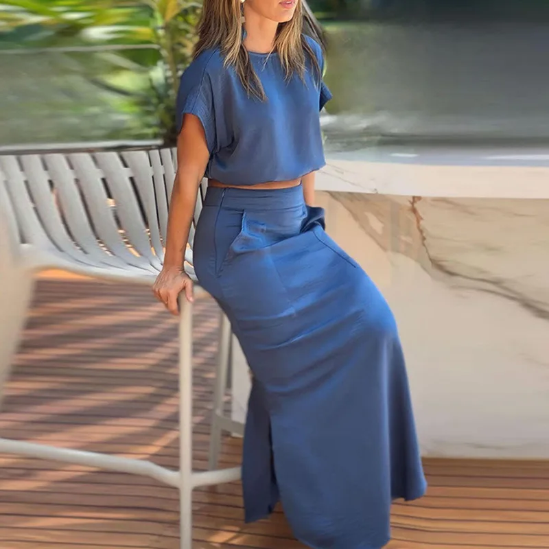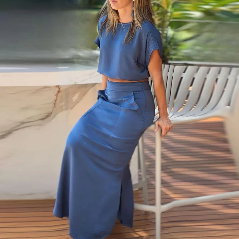 dropshipping lady elegant dress women clothes O neck crop top high waisted pockets split skirt two piece women's sets skirts