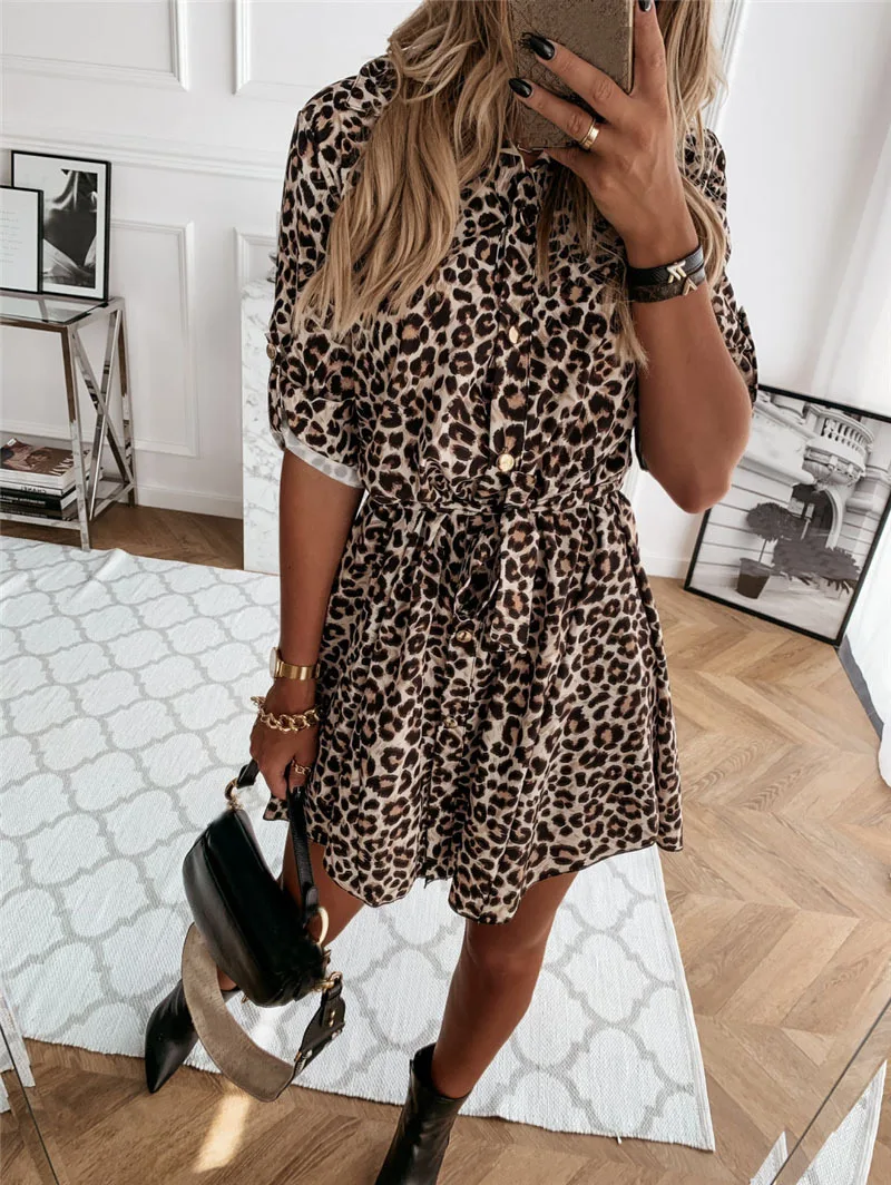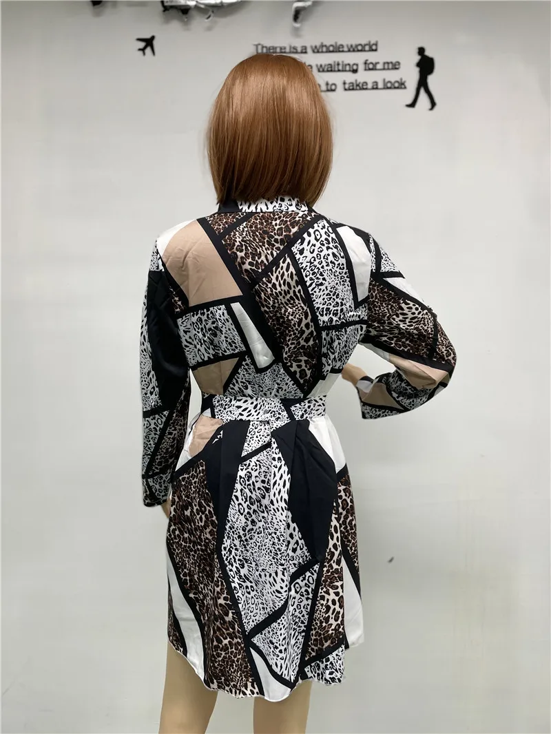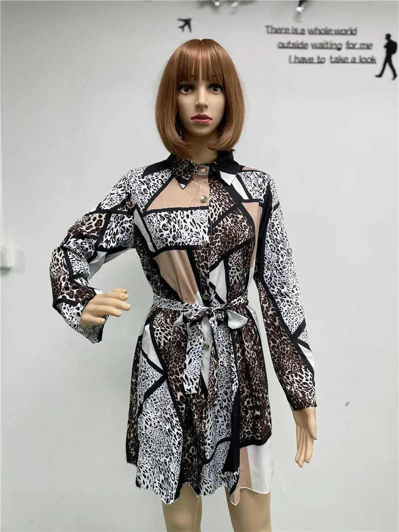 Dropshipping Leopard Casual Shirt Dress Women Turn Down Neck Shirt Dress Midi
