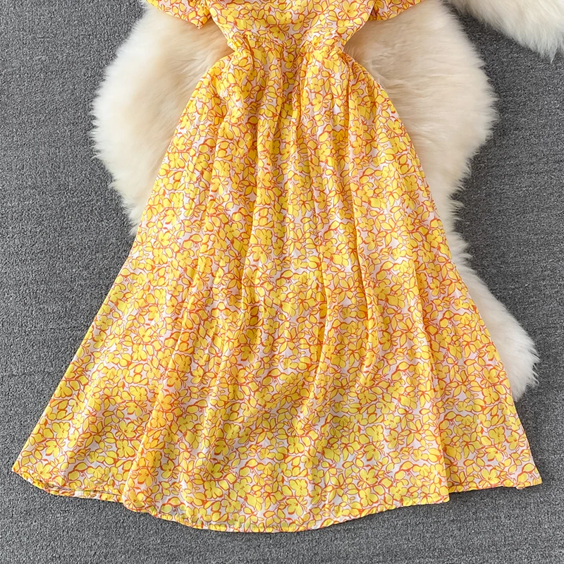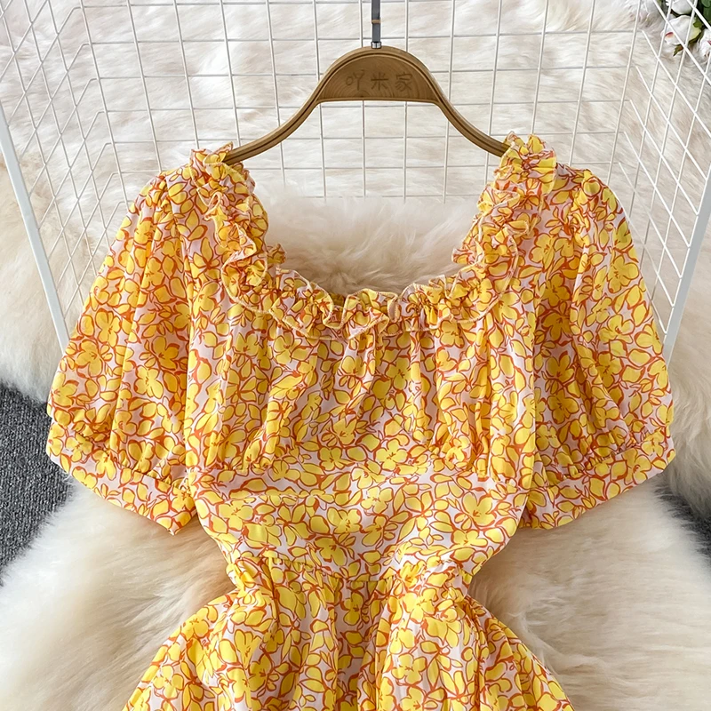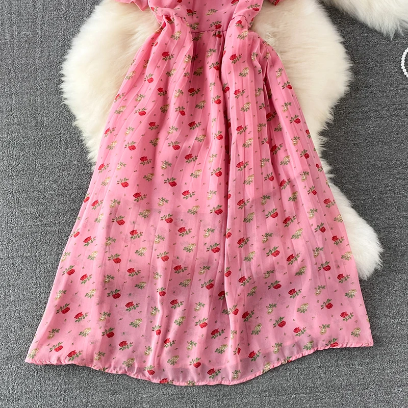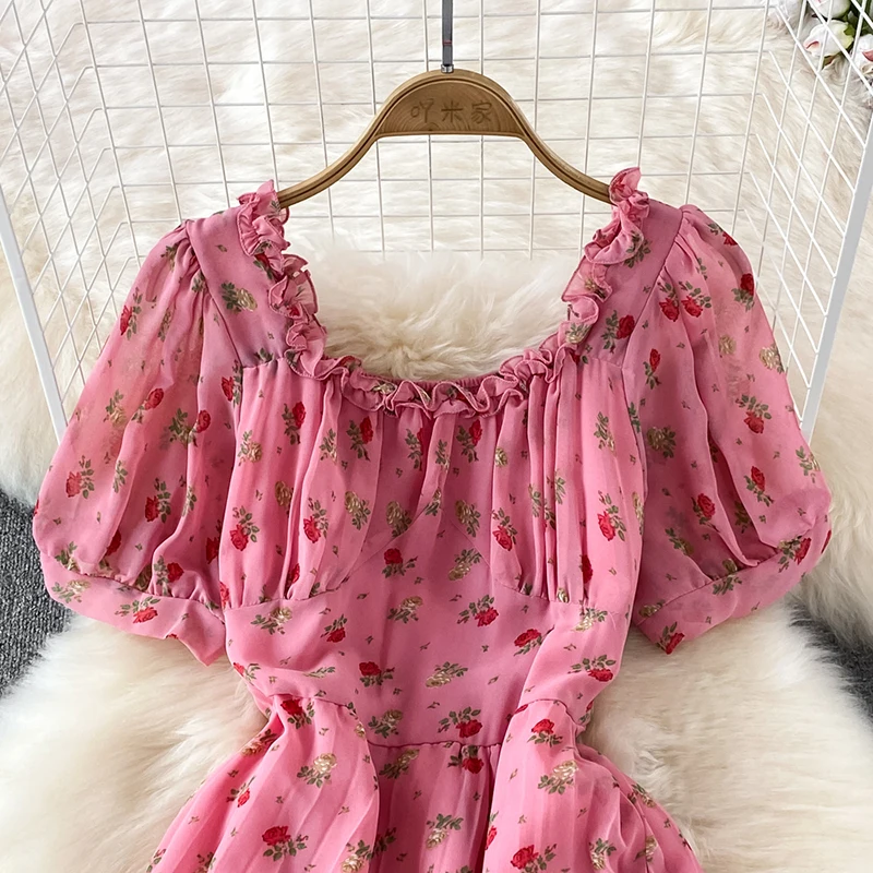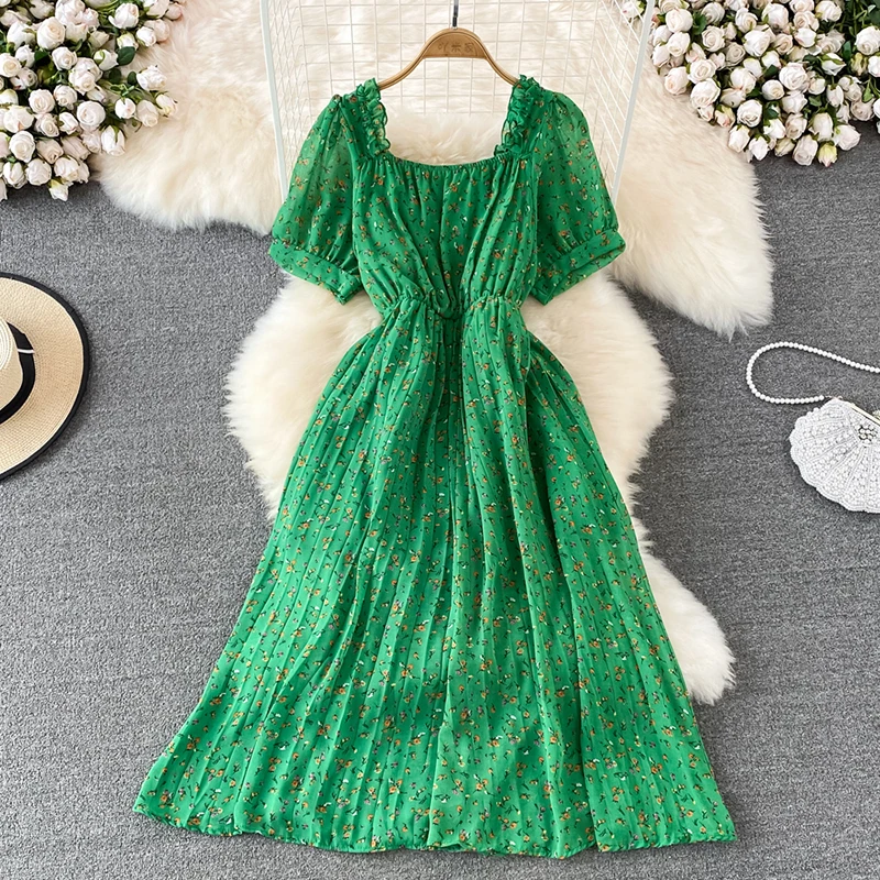 Dropshipping Products 2023 Casual Dresses for Woman Sexy Elegant Square Collar Short Sleeve Chiffon Pleated Dress Floral Printed