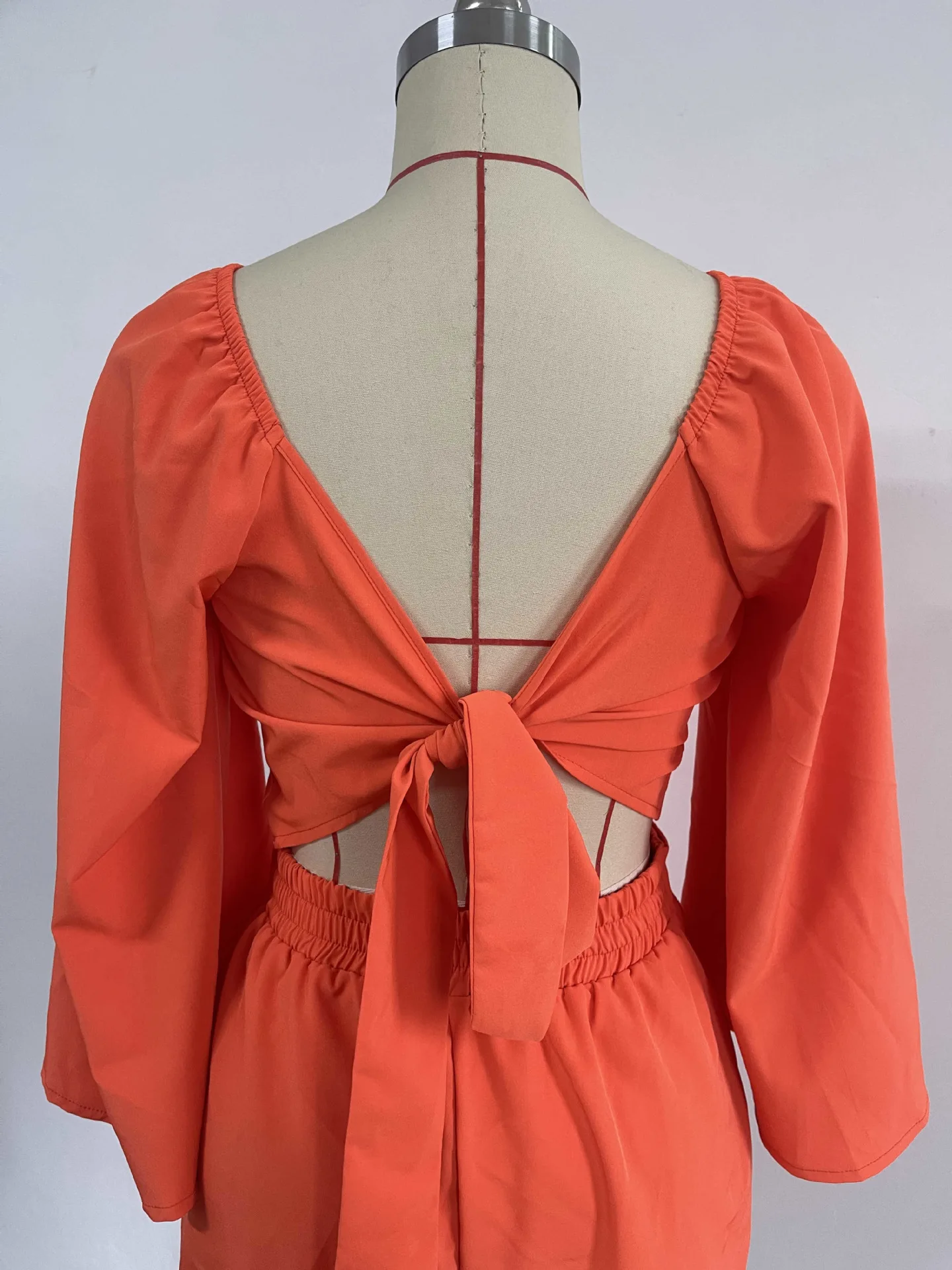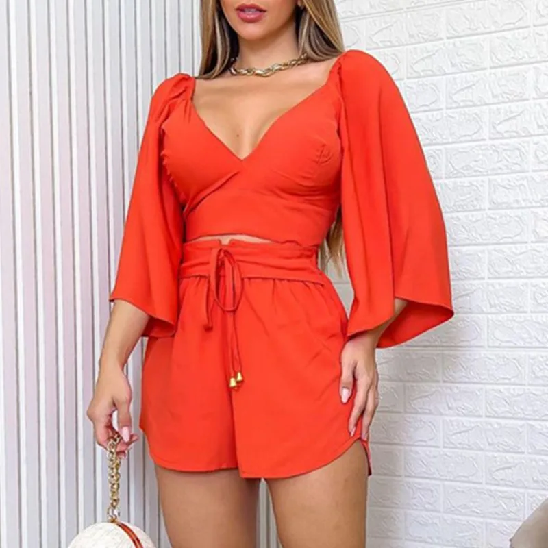 dropshipping summer clothes set women open back flared sleeve shirt Cutout High Waist Shorts two piece women's casual sets