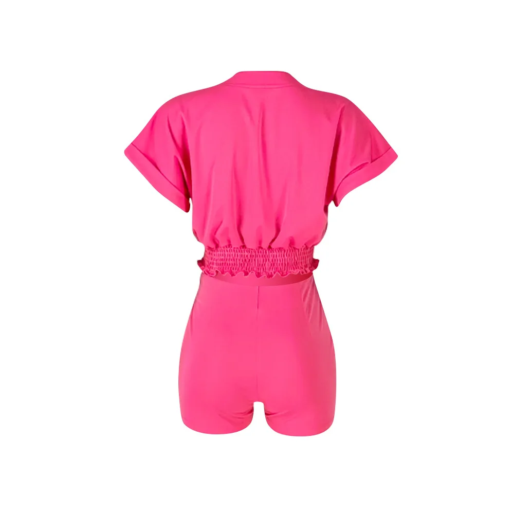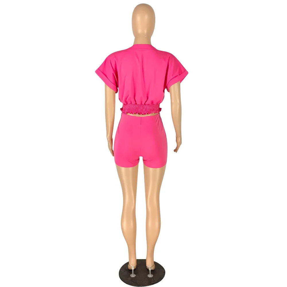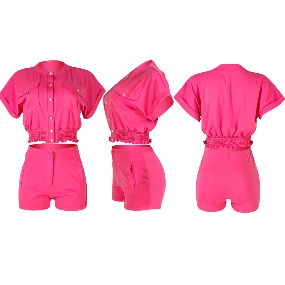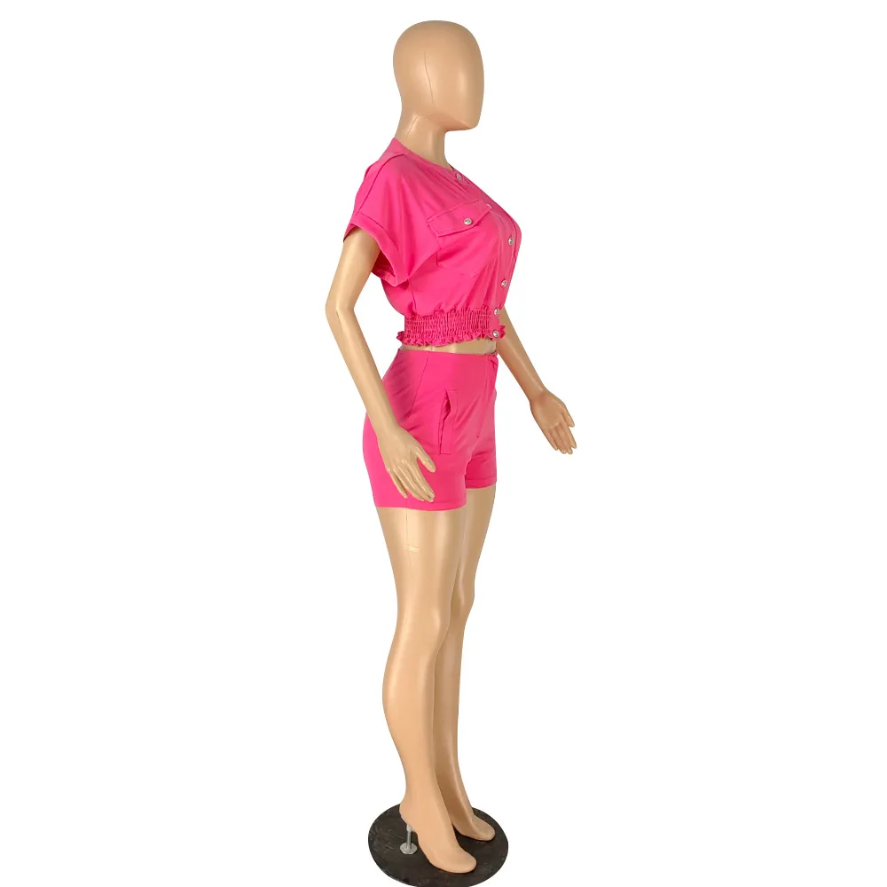 dropshipping summer ladies clothes set women casual solid color short top High-elastic waist shorts two piece women's sets