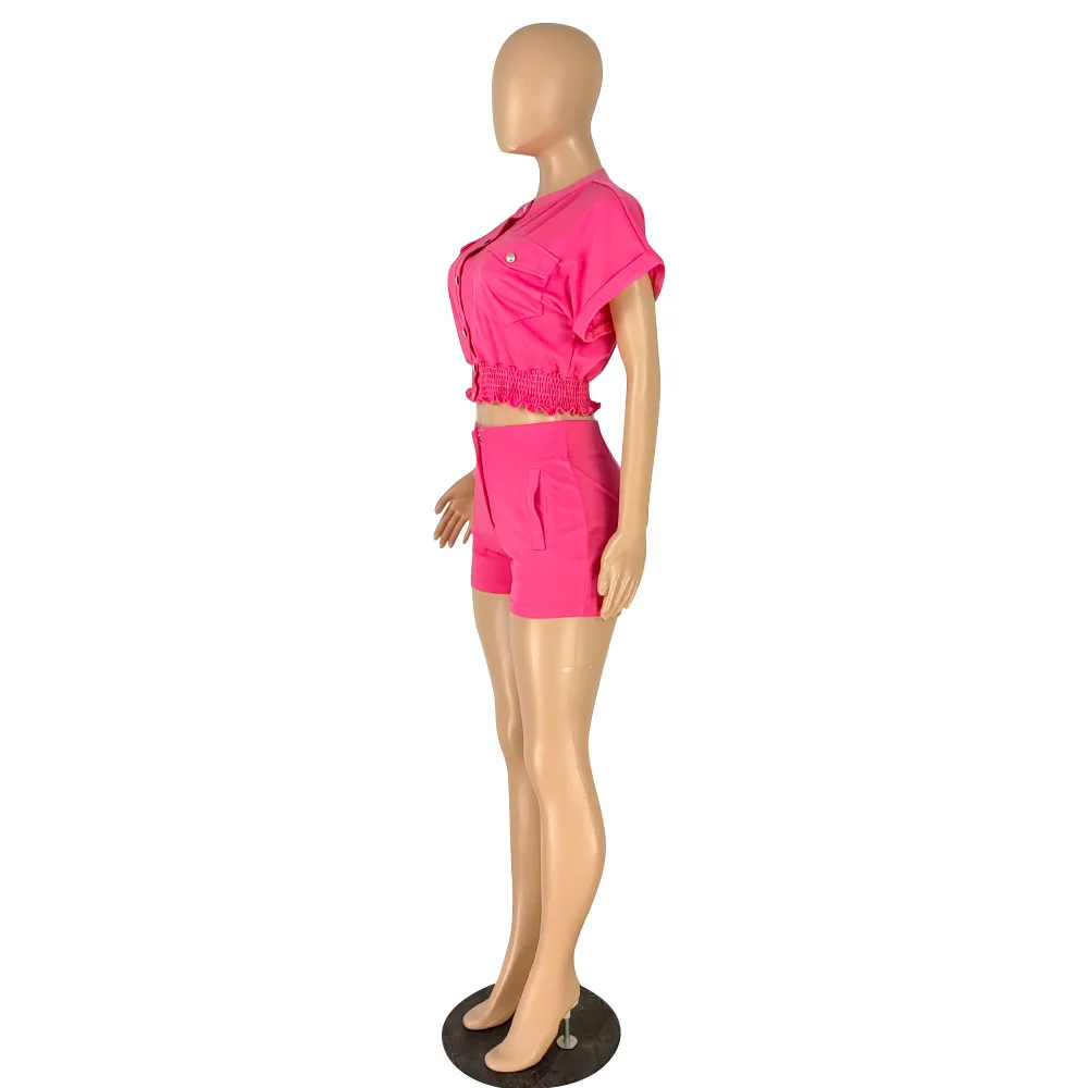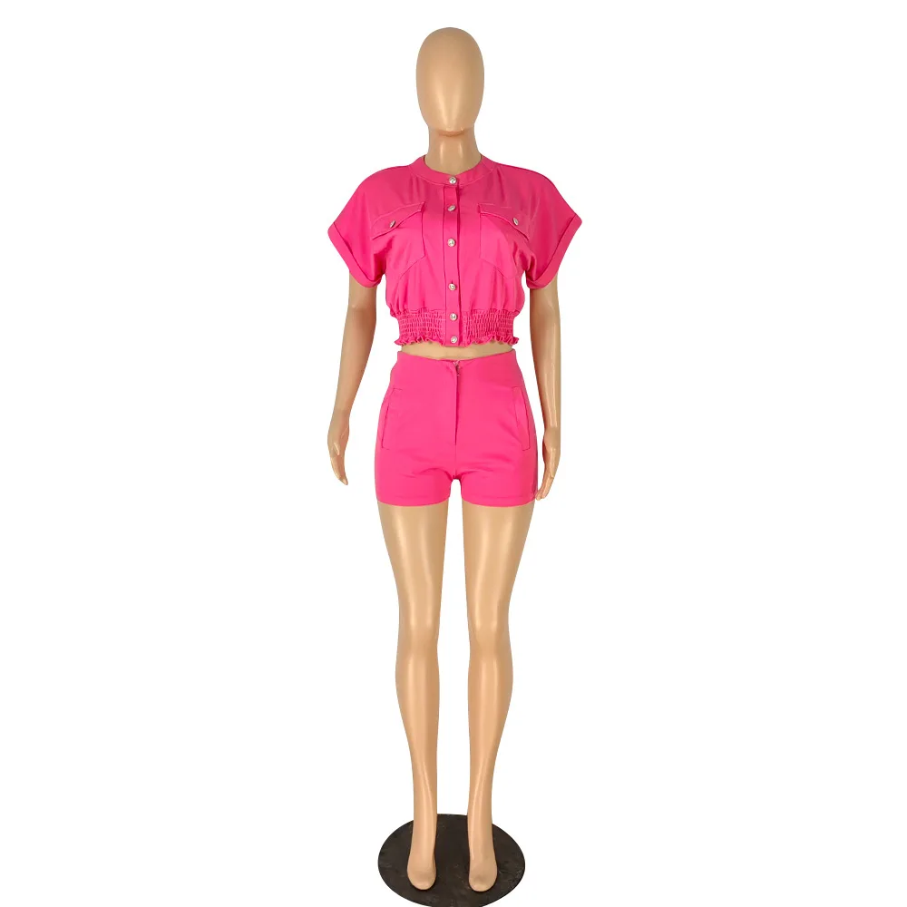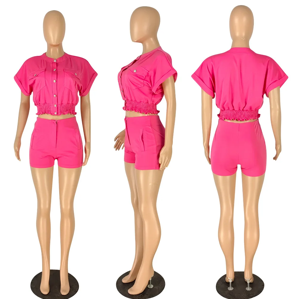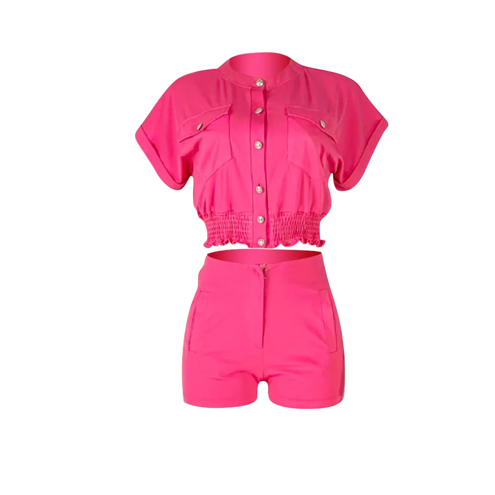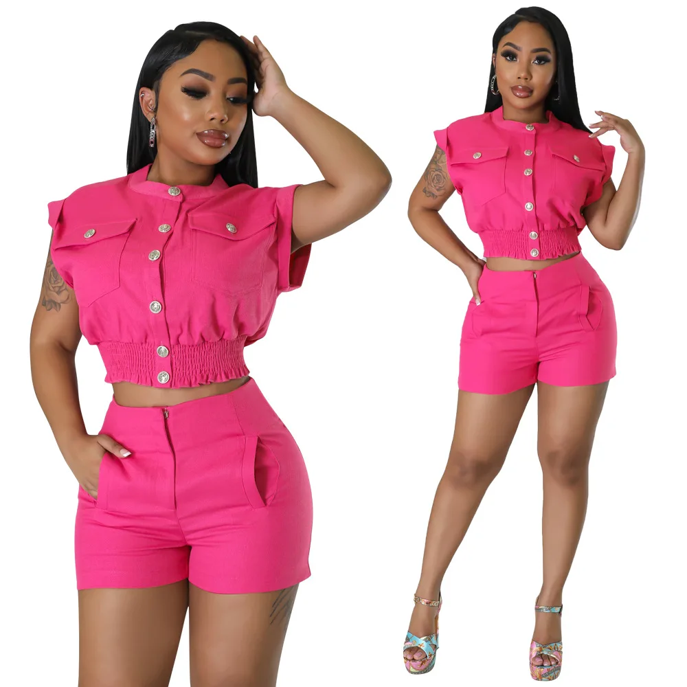 dropshipping summer ladies clothes set women casual solid color short top High-elastic waist shorts two piece women's sets