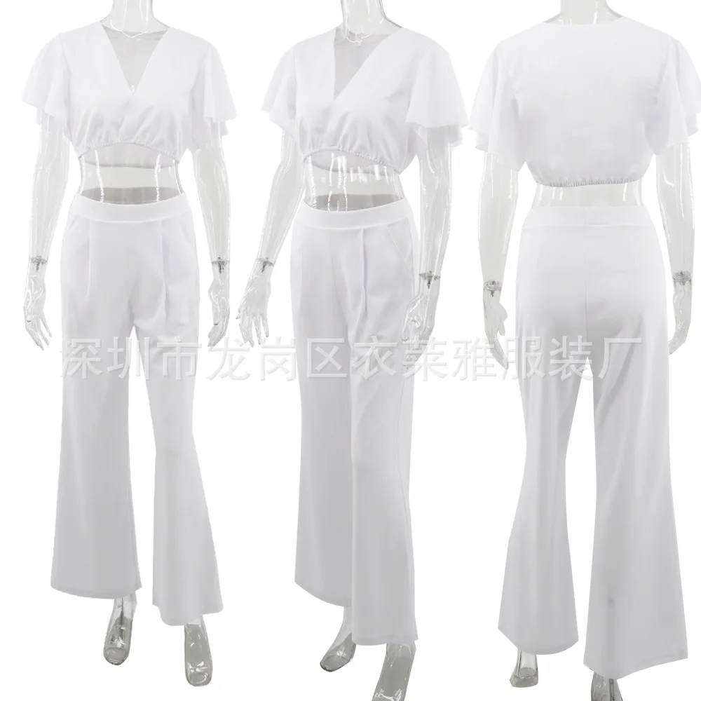 dropshipping summer women clothing ladies Deep V crop top slim straight leg trousers loose pants casual two piece women's sets