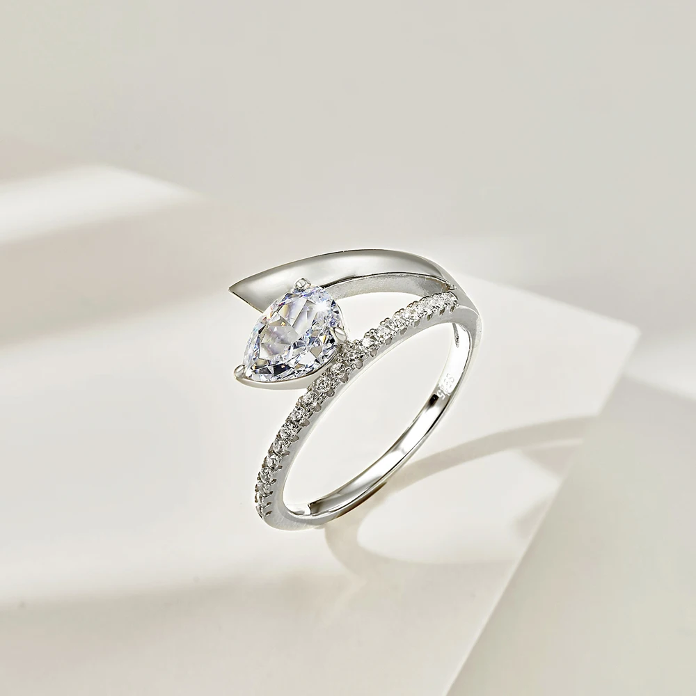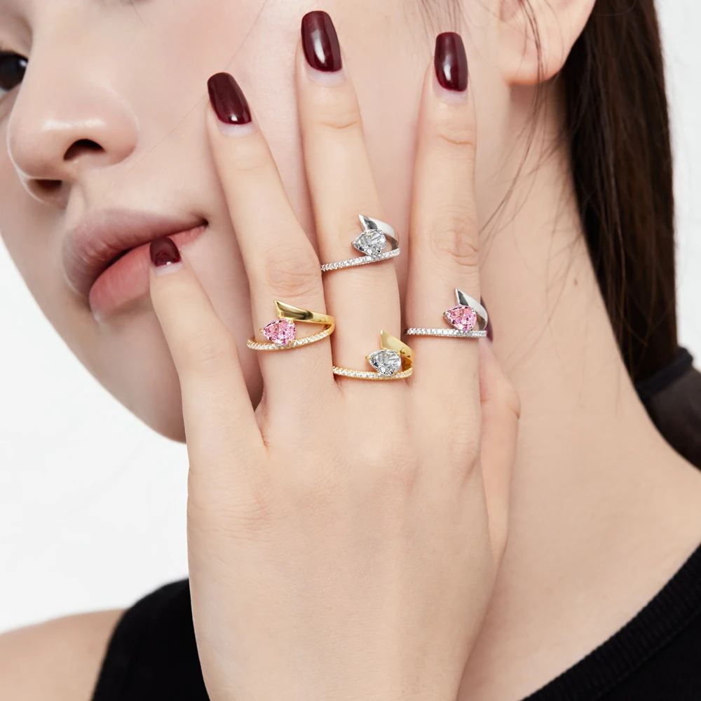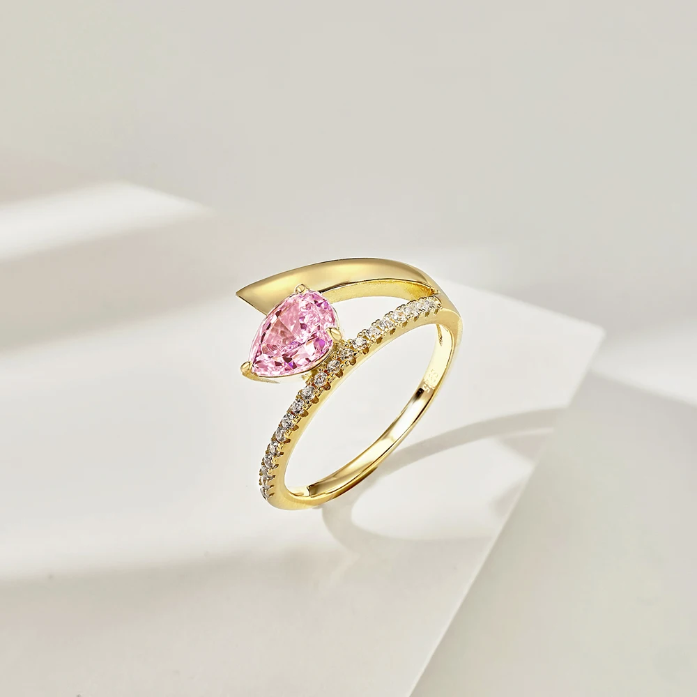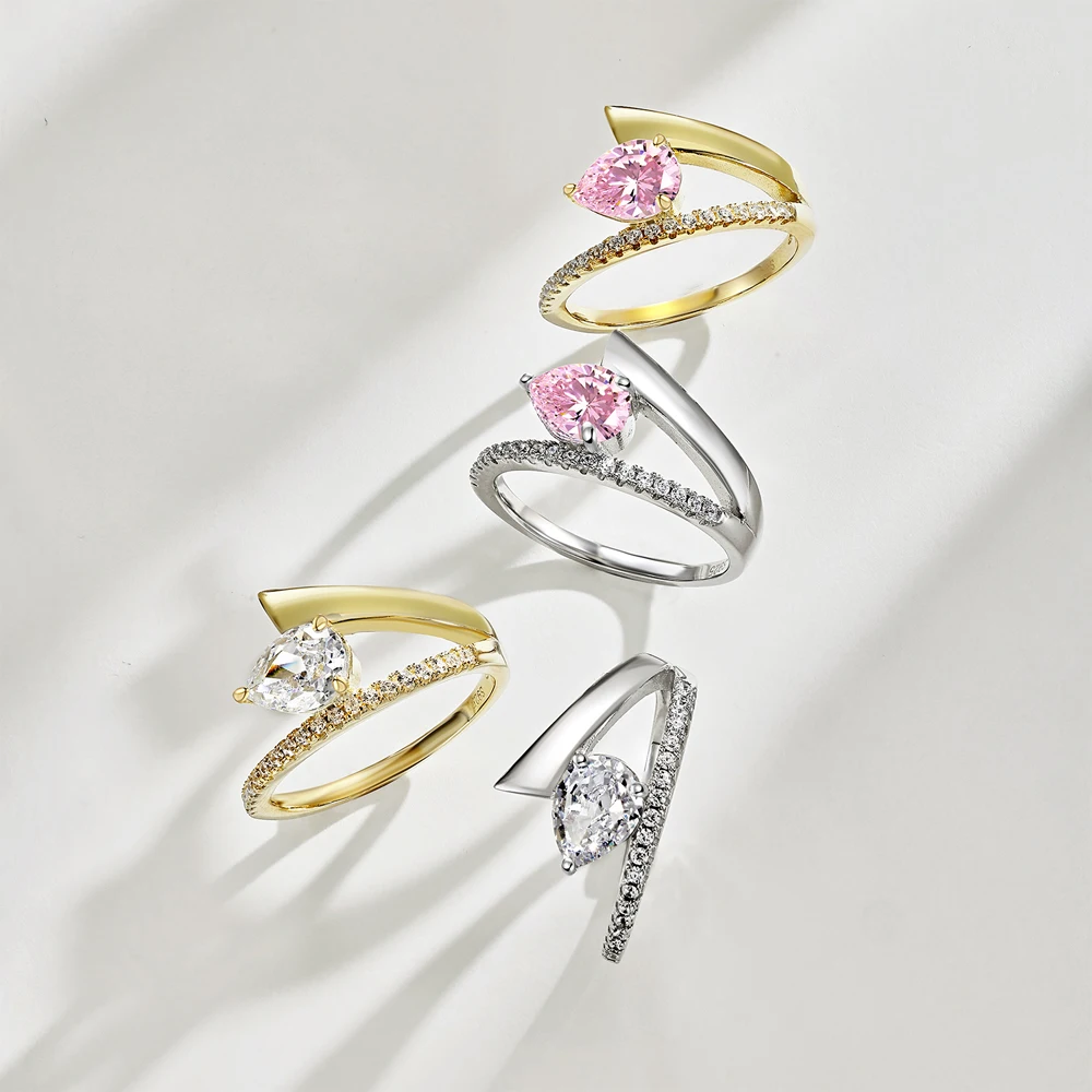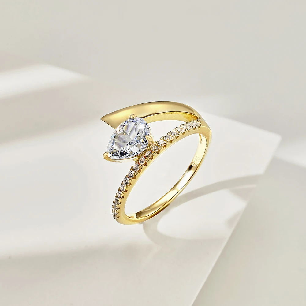 Dylam Stylish S925 Silver Rhodium 18K Gold Plated Pear Shape 8A Crushed Iced Out Cut Zirconia Geometric Wedding Promise Ring