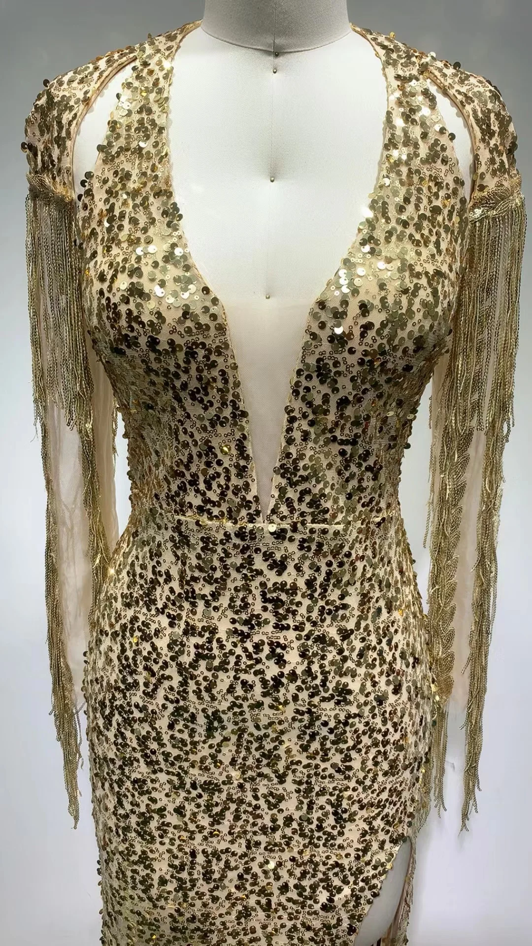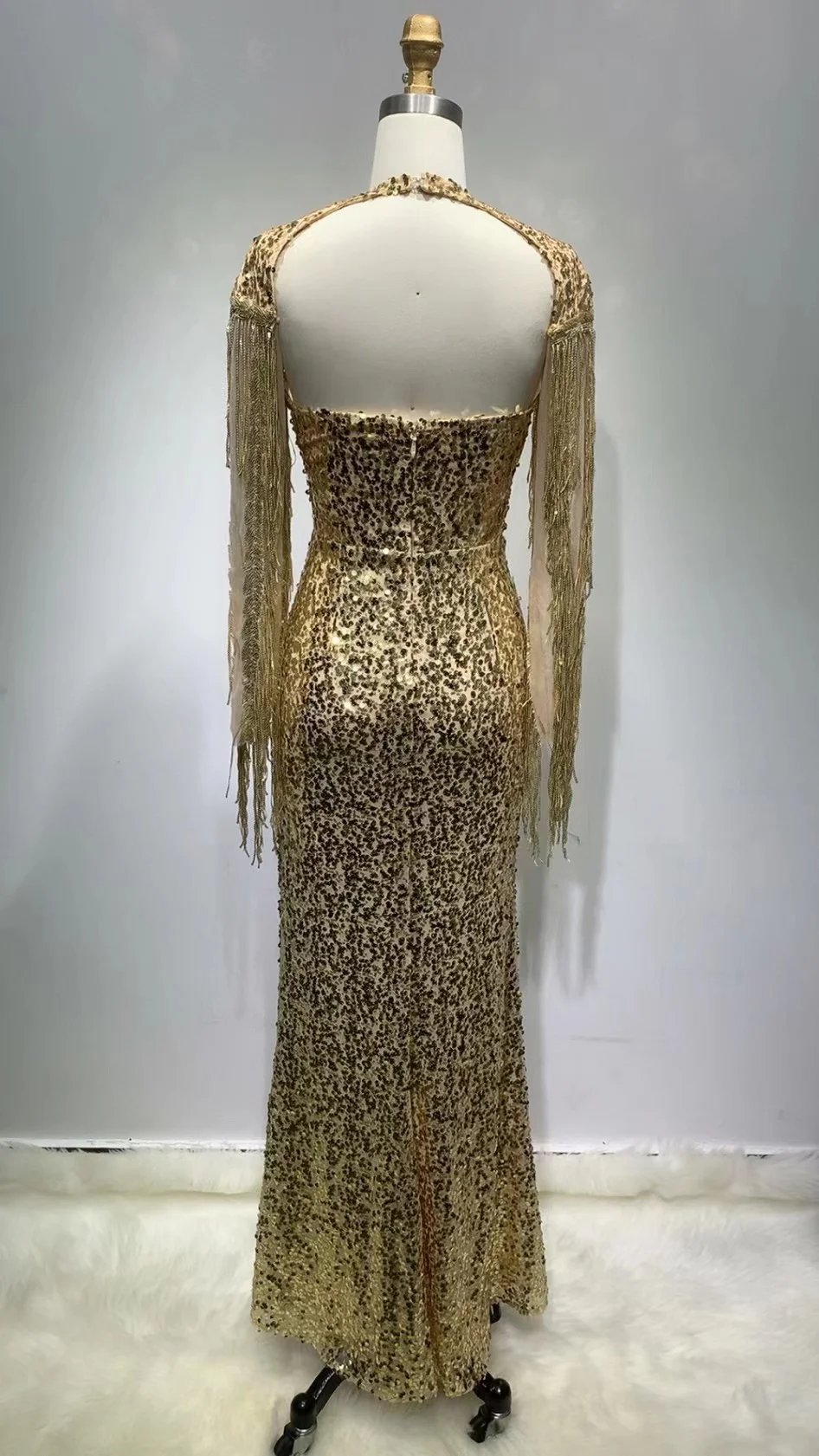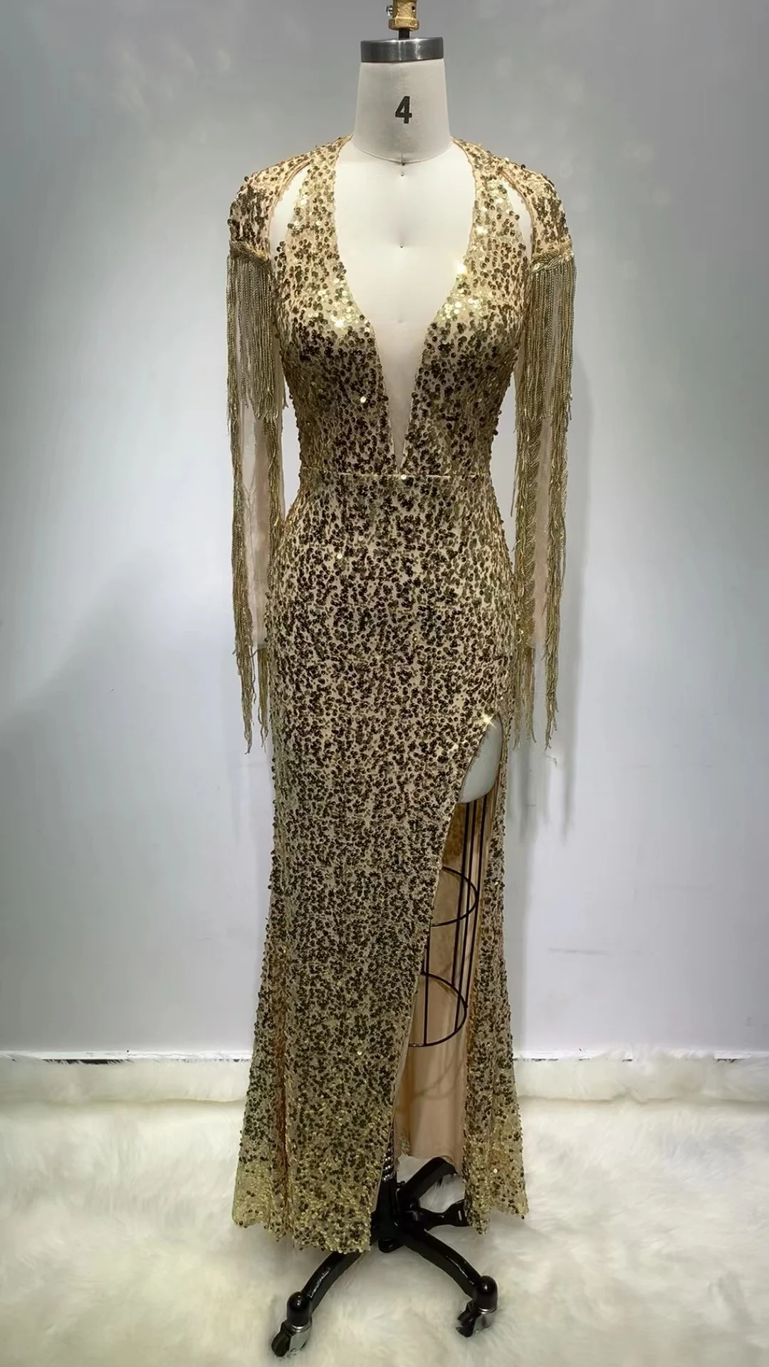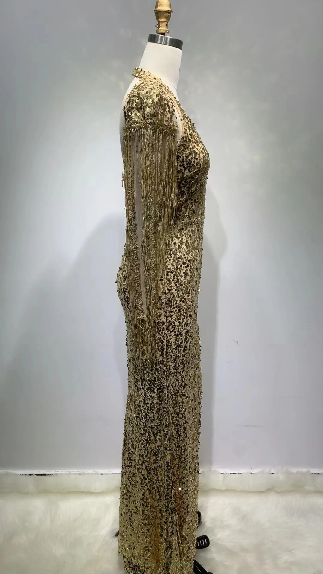 ED2242 Kimshein Luxury Women Clothing New Halter Backless Long Sleeve With Tassel Mesh Fabric Hole Sequin Wedding Dress Evening