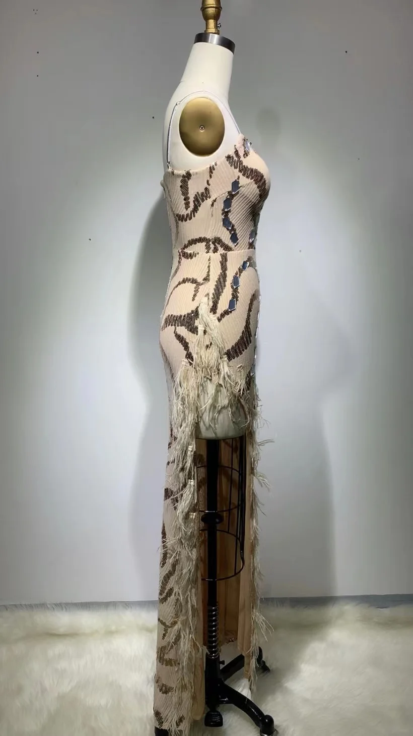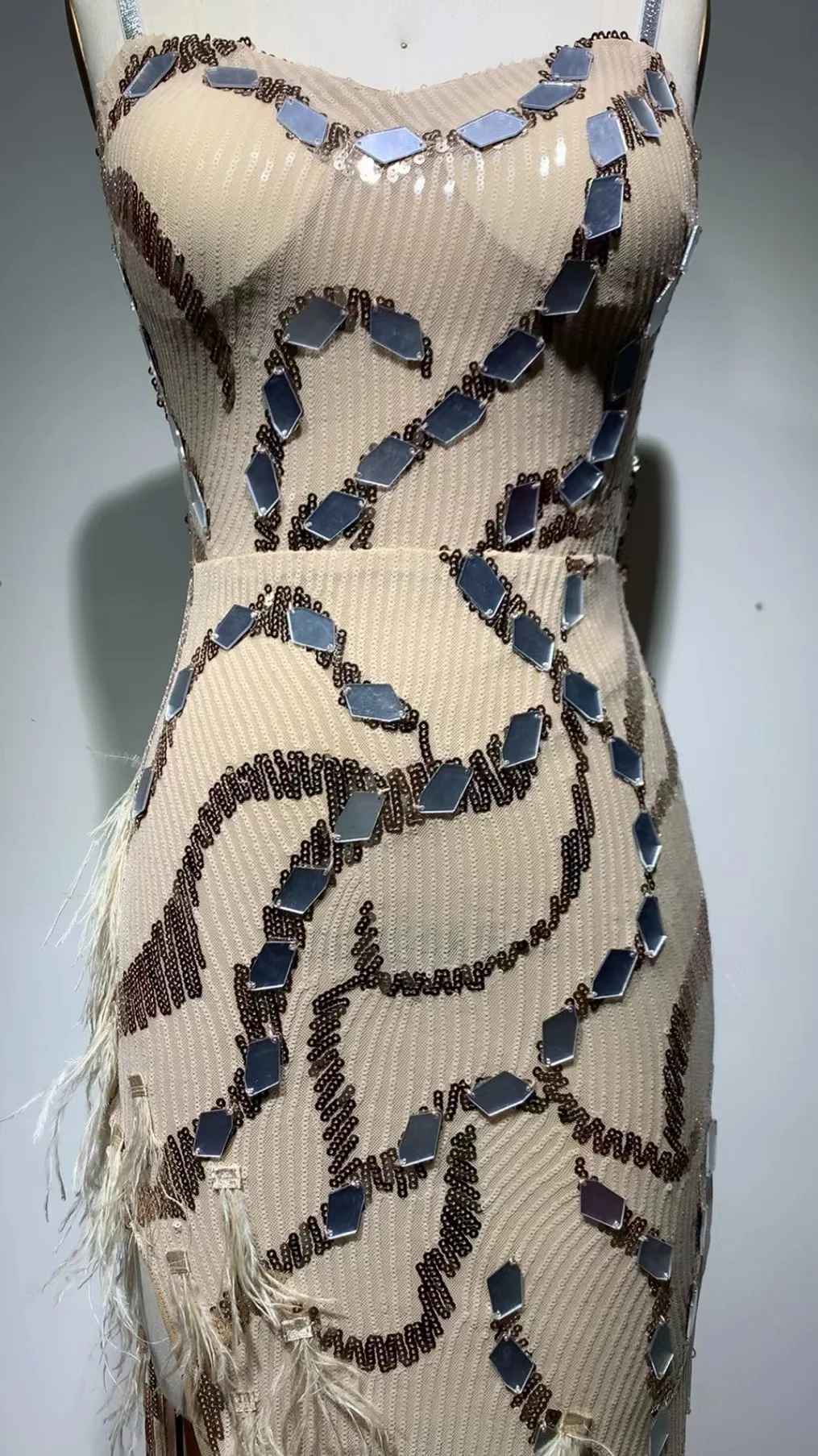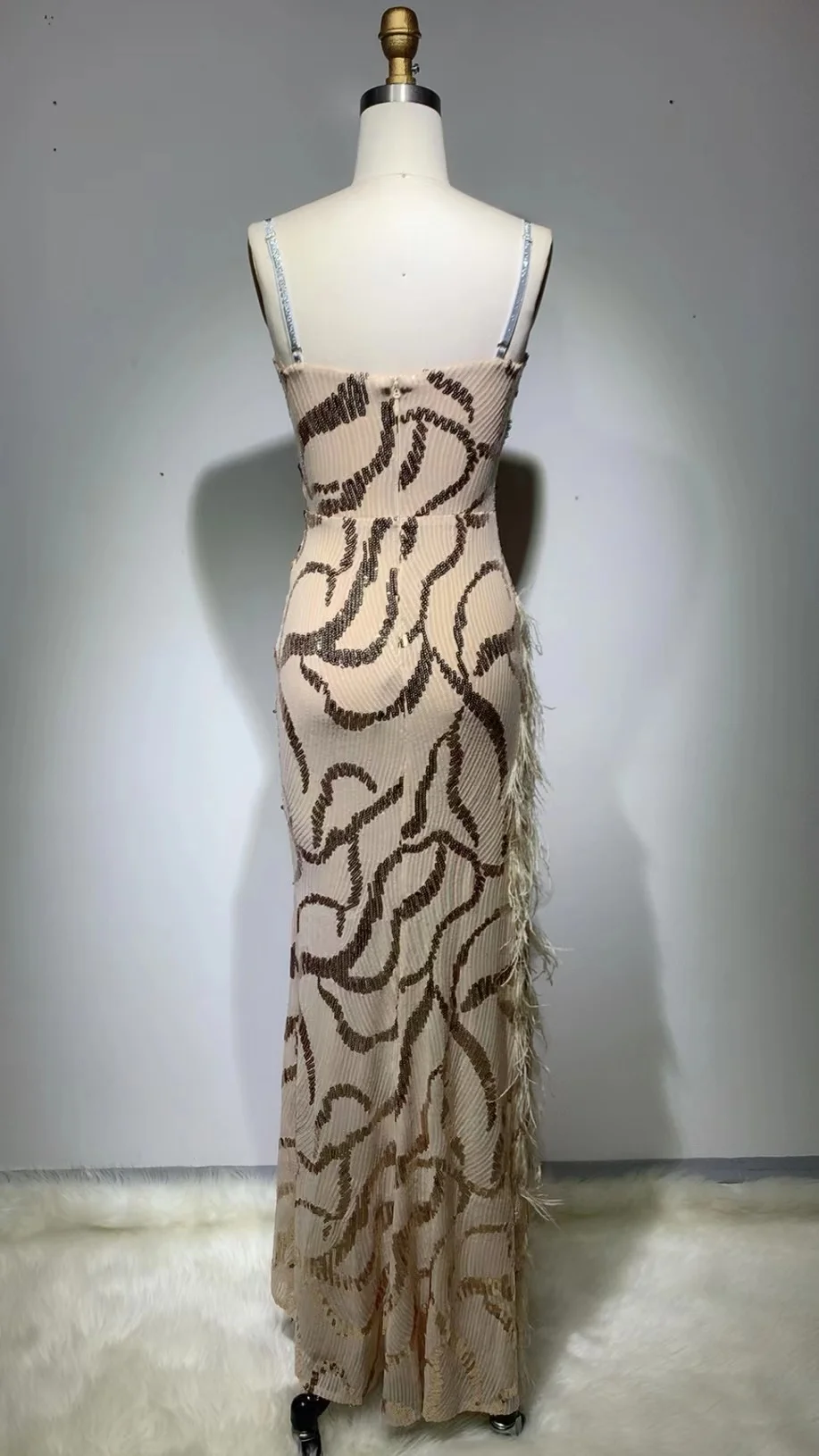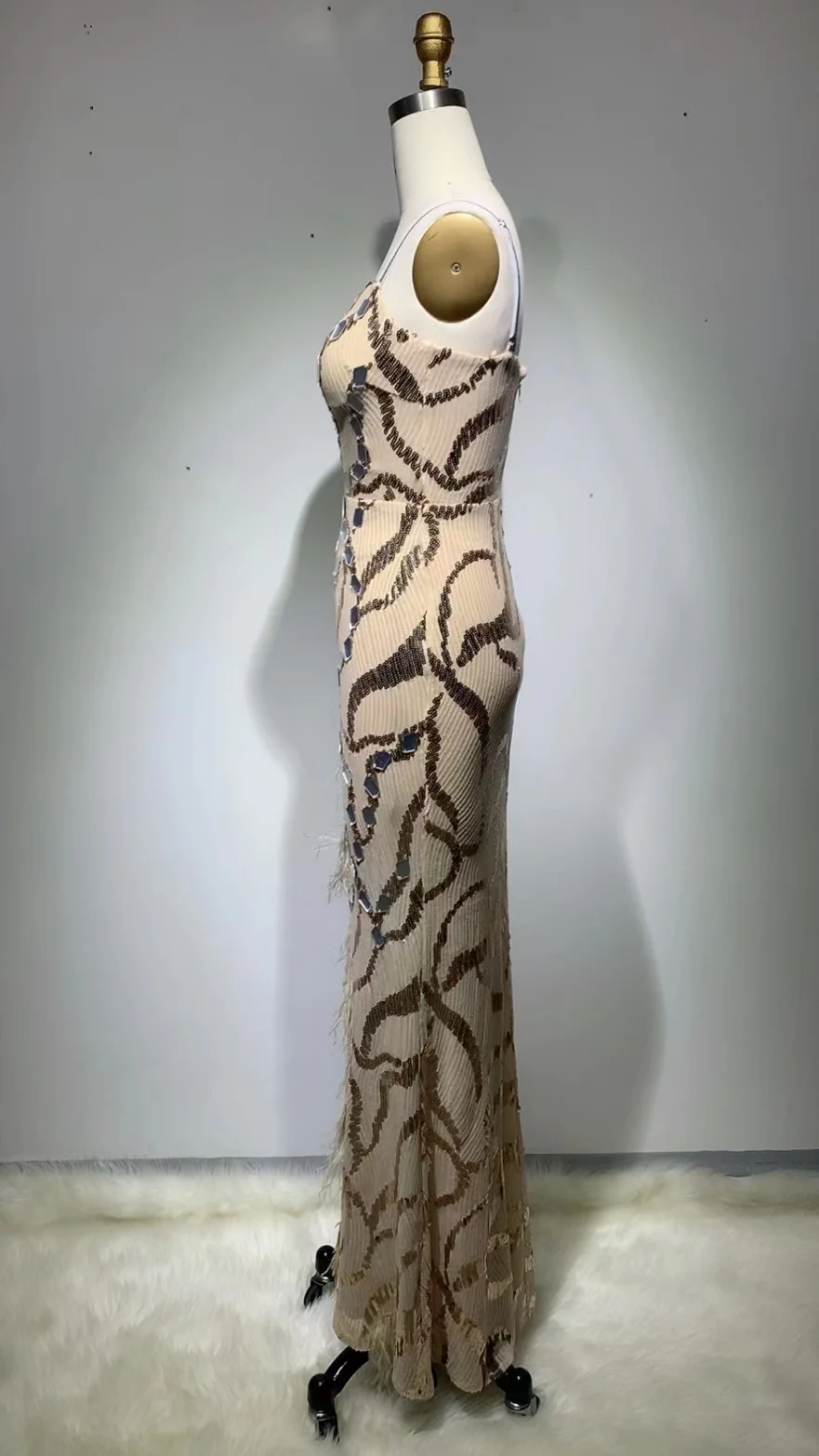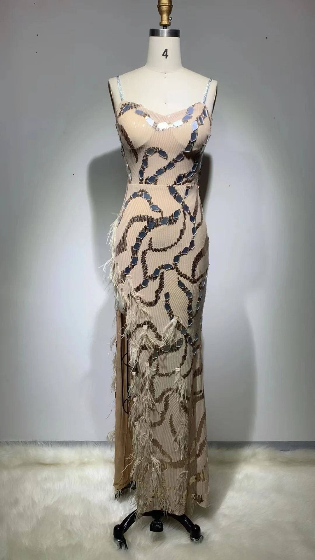 ED2393 Gowns For Women Evening Dresses High Slit Sequin Dress Sexy Party Spaghetti Strap Long Feather Dress