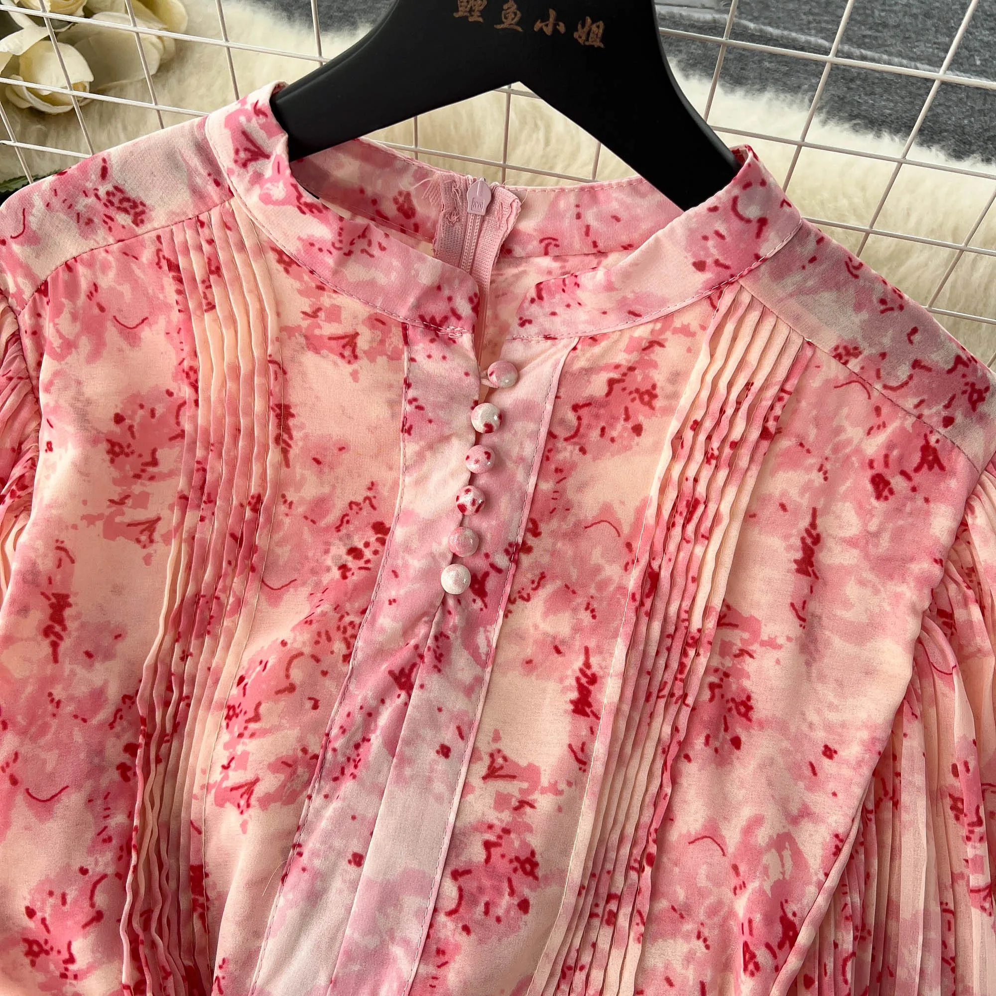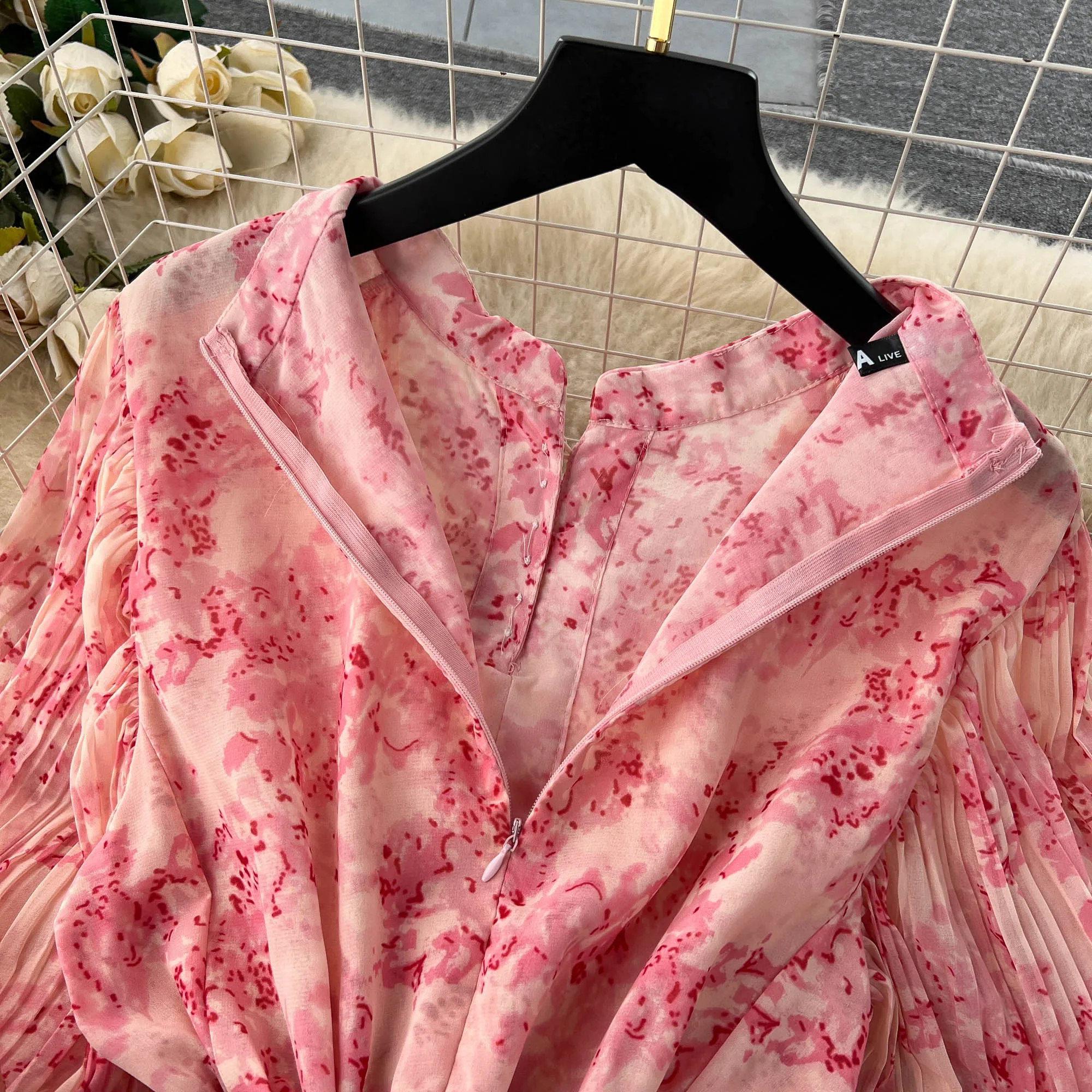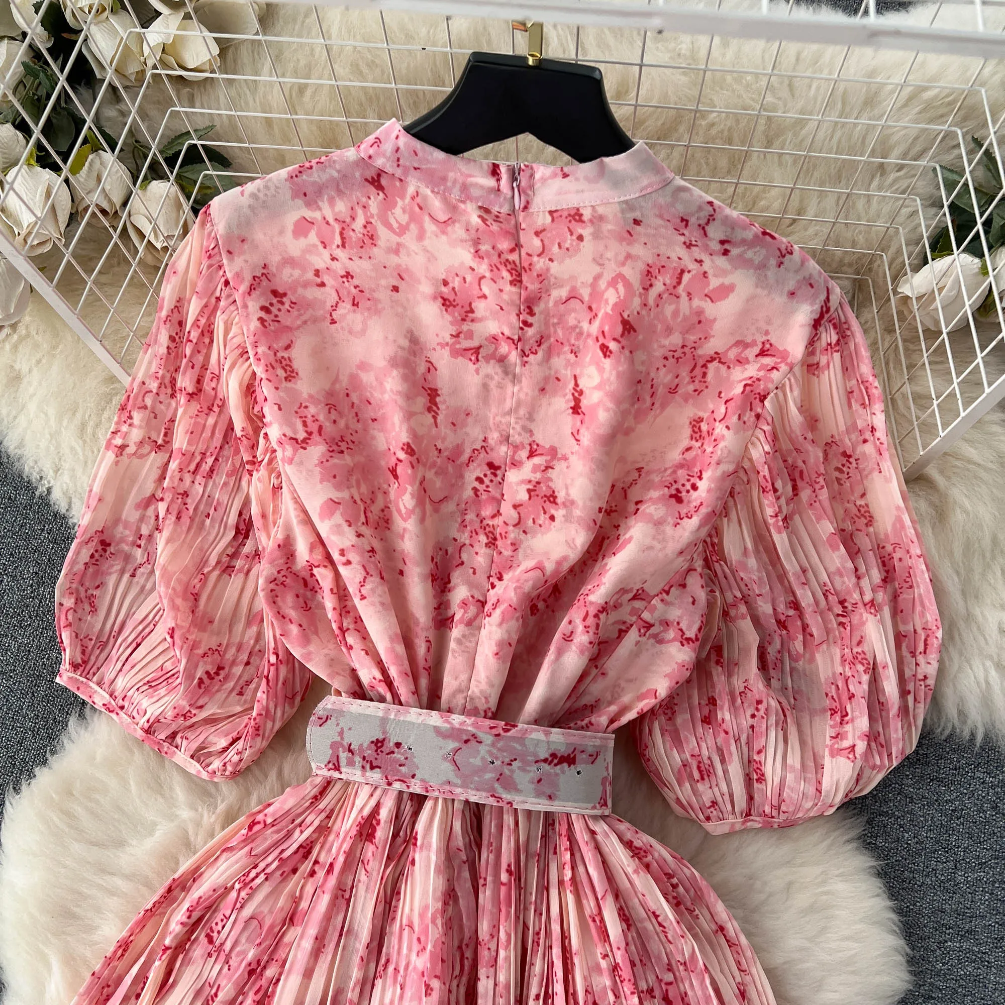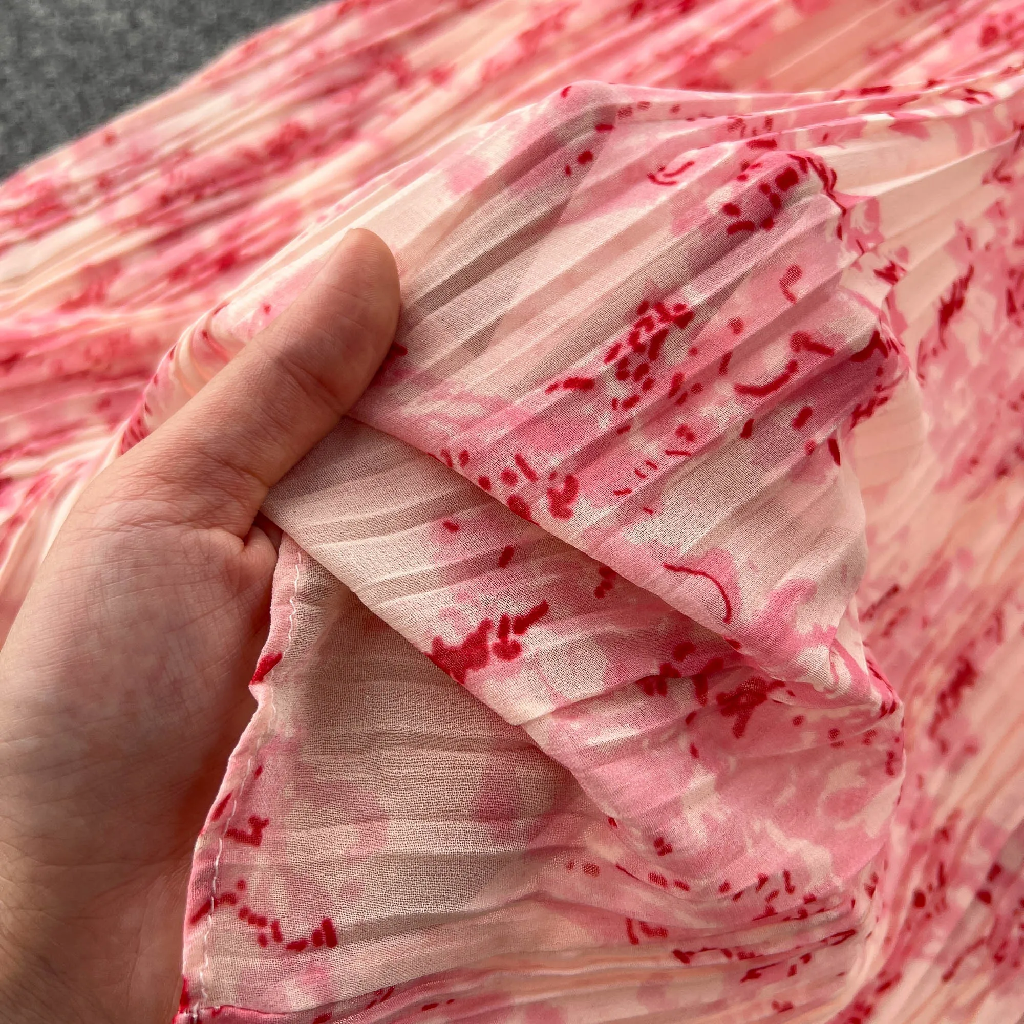 Elegant A-line chiffon pleated skirt with a cut out round neck and bow print dress with a waistband