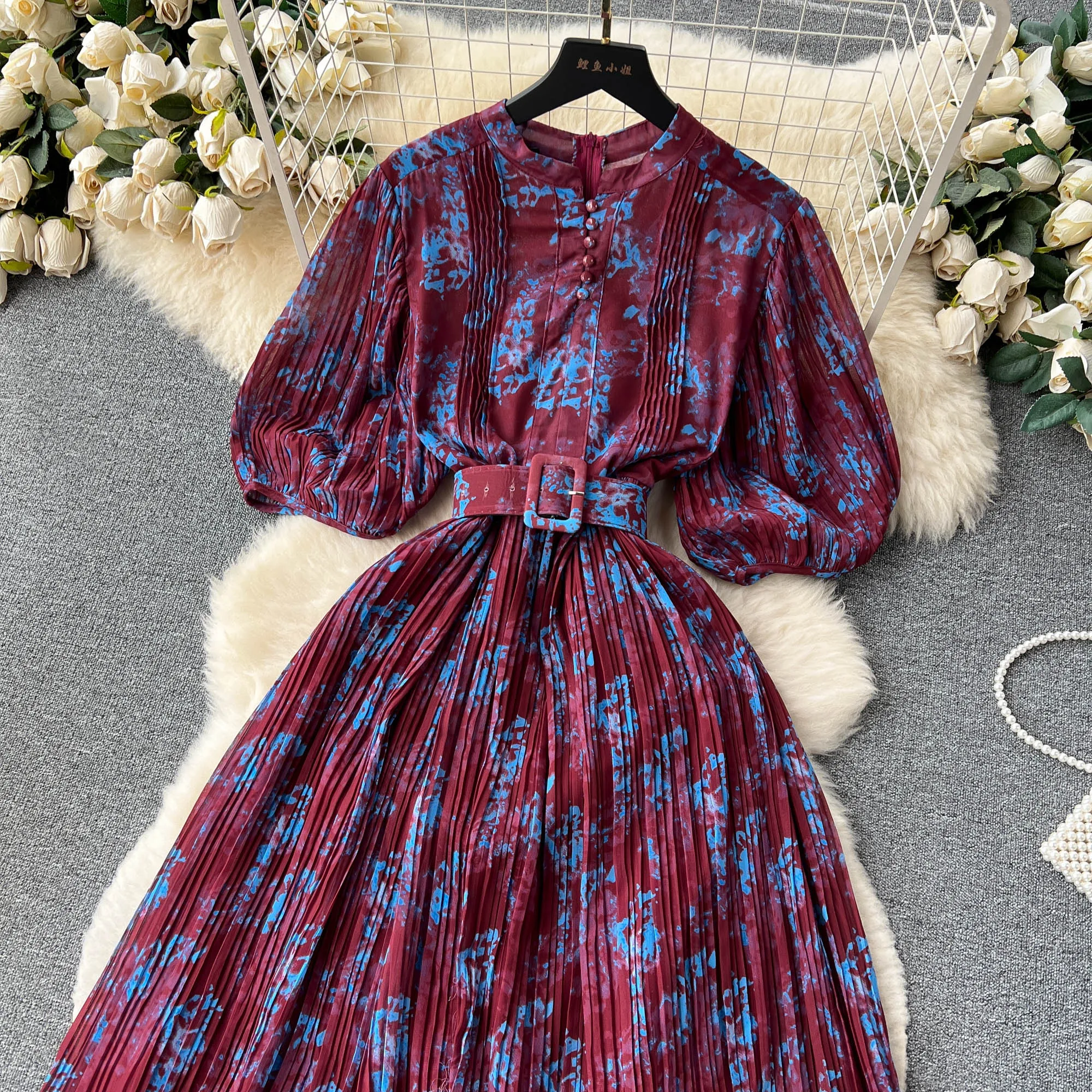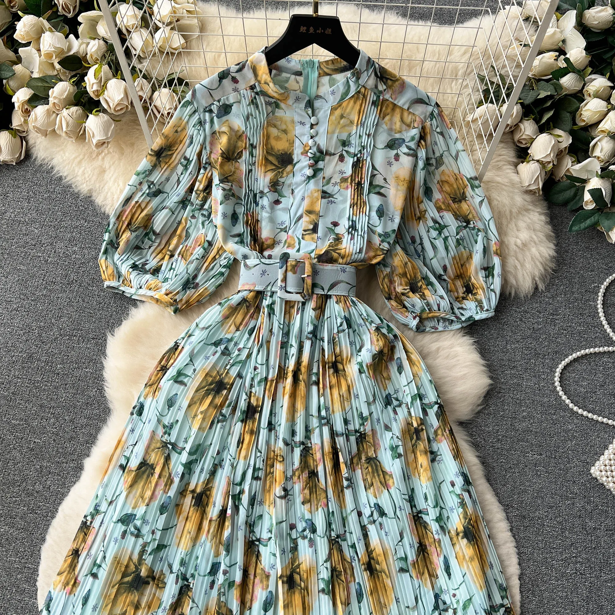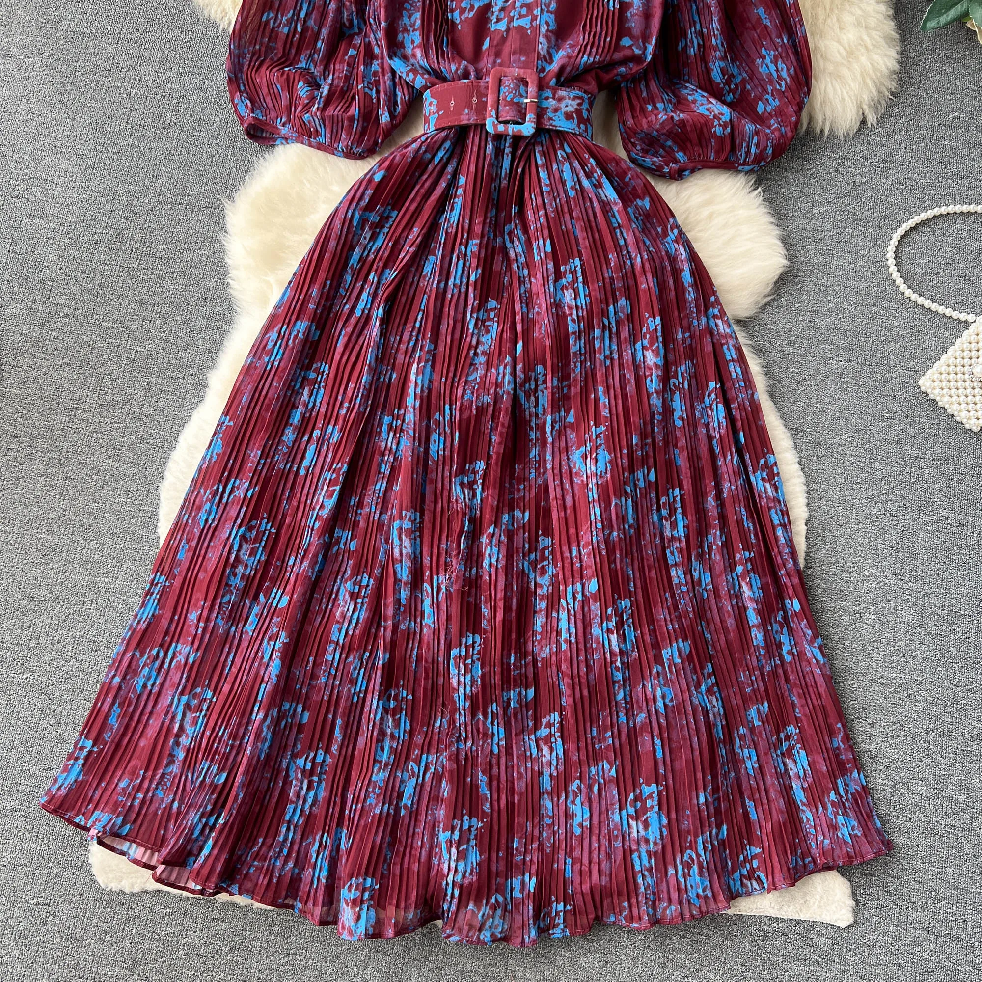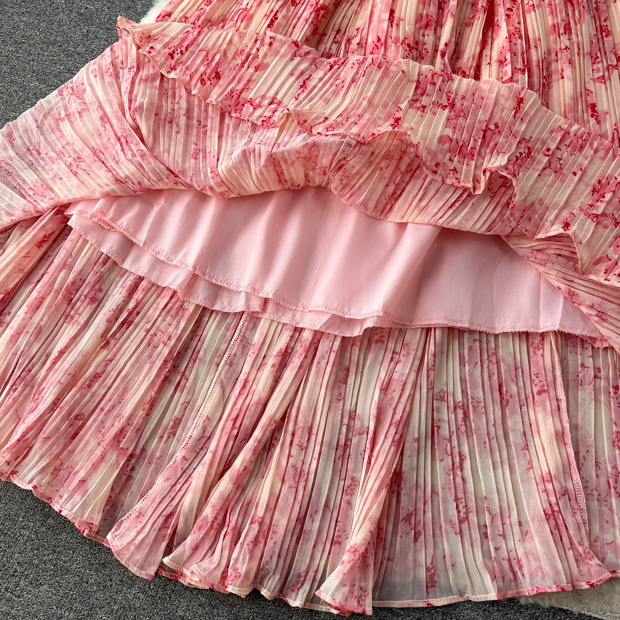 Elegant A-line chiffon pleated skirt with a cut out round neck and bow print dress with a waistband