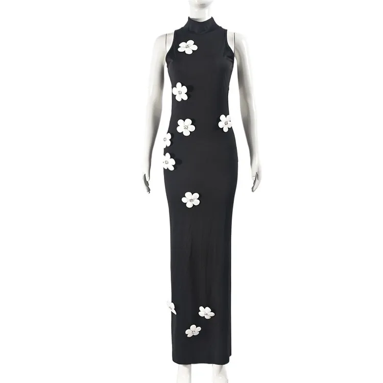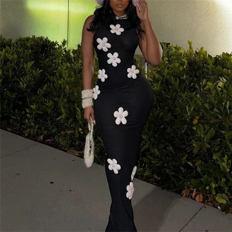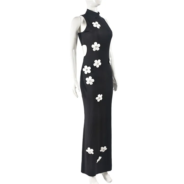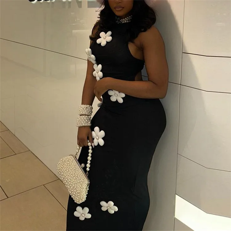 Elegant Black Flower Applique Bodycon Long Dresses Party Outfits For Women 2024 Sexy Hollow Out Bodycon Maxi Dress