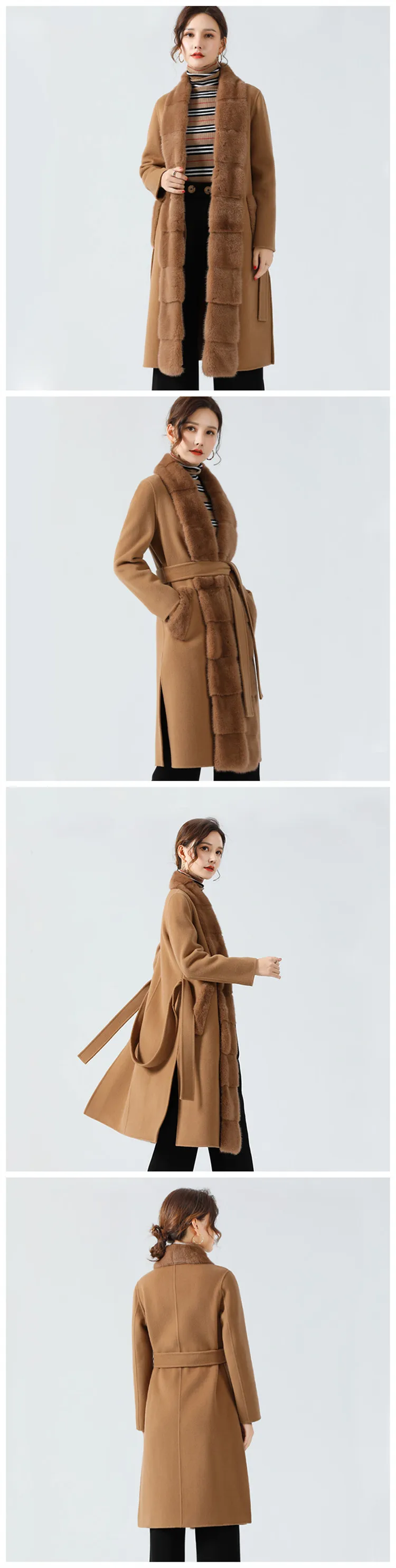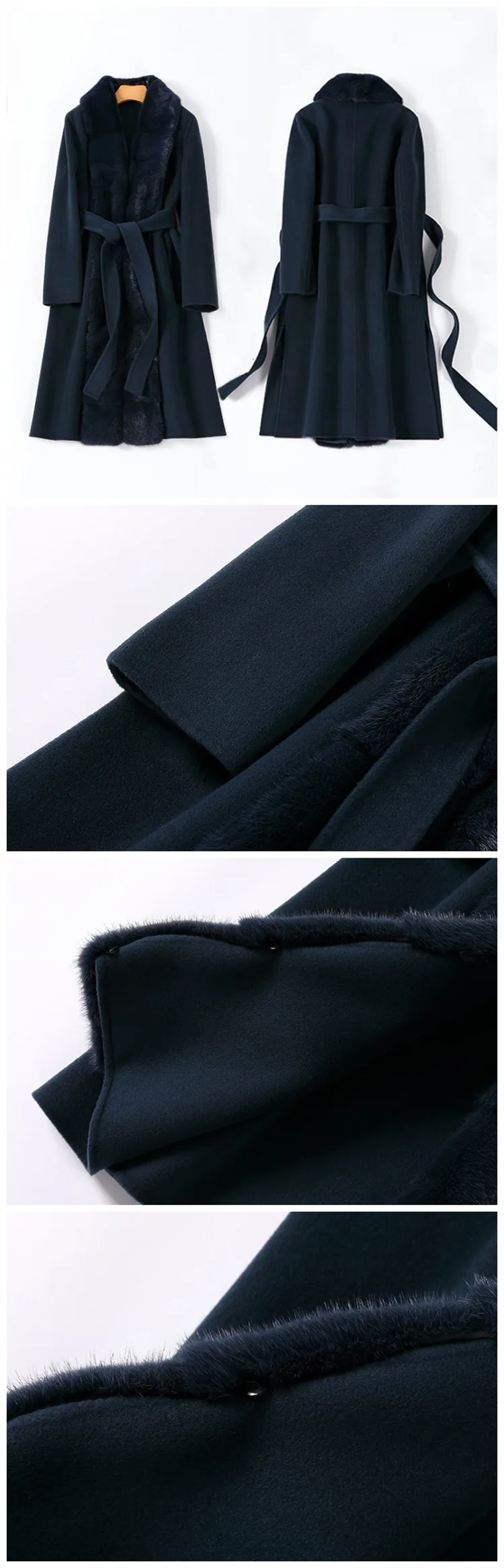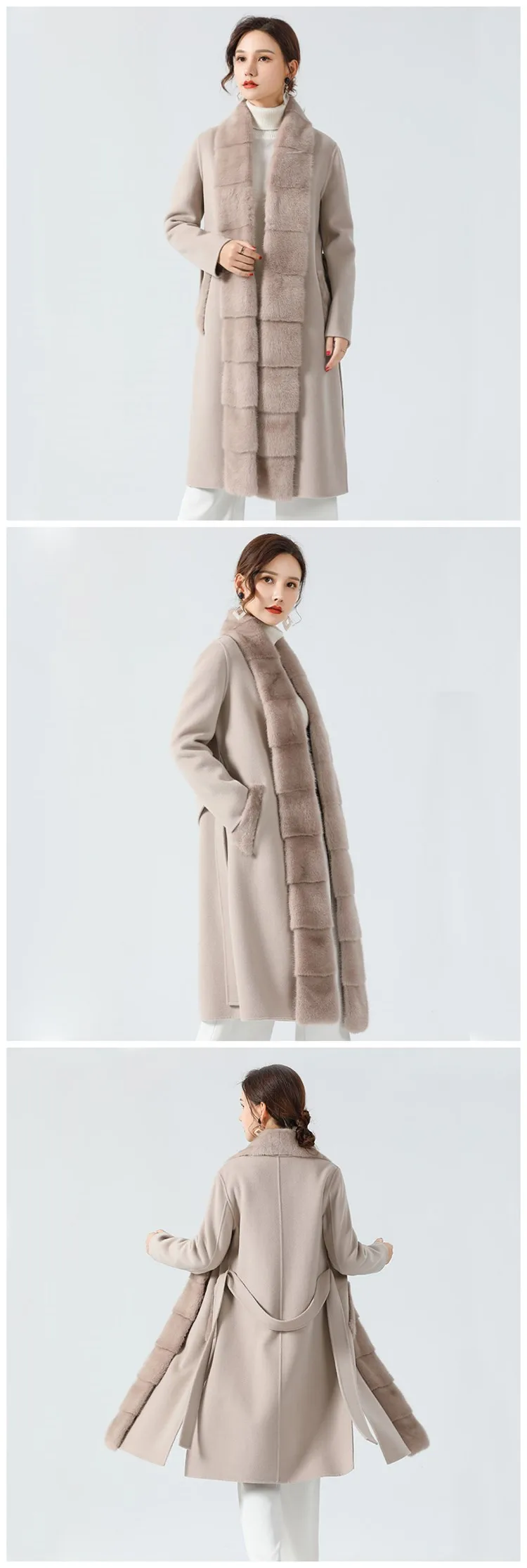 Elegant Double Sided Wool Coat Detachable Real Mink Fur Trim Ladies Cashmere Coat