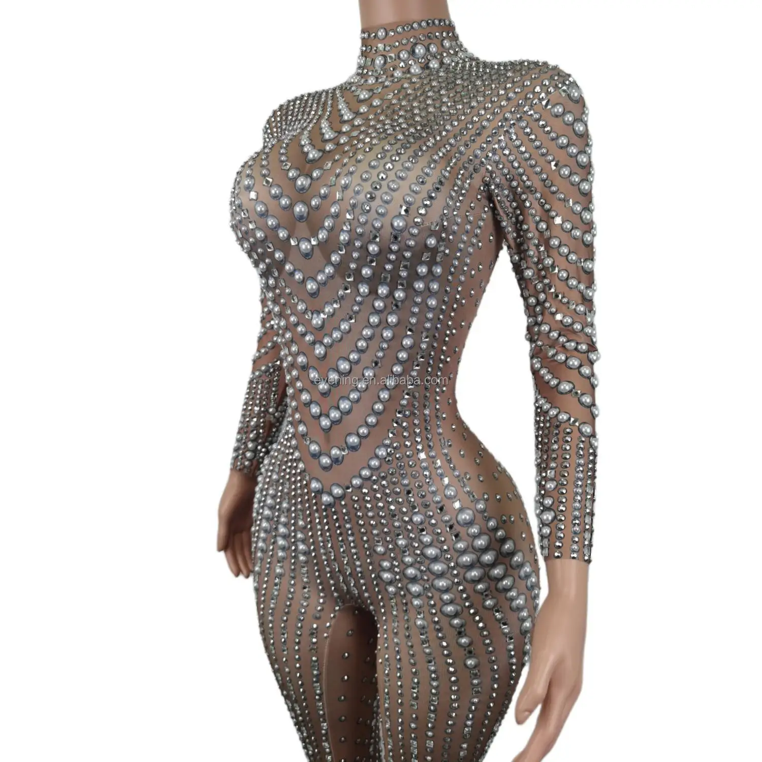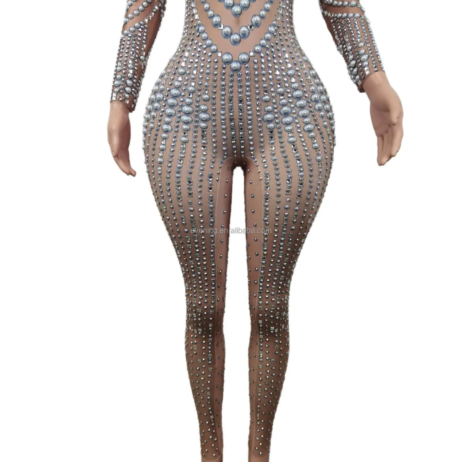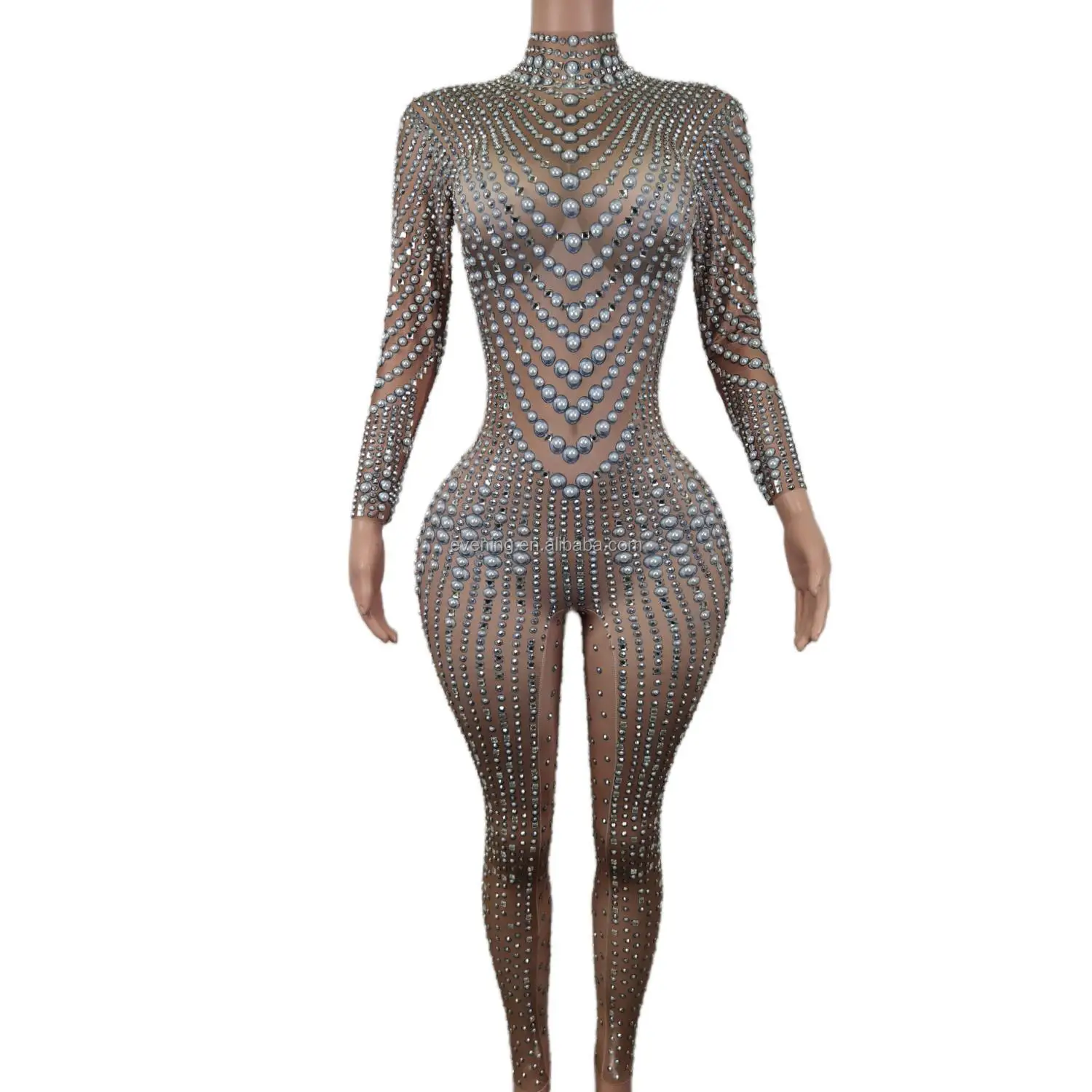 Elegant Long Sleeves Pearls Diamond One Piece Bodysuit Pole Dancer Festival Outfit Formal Party Ladies Rompers Women Jumpsuits