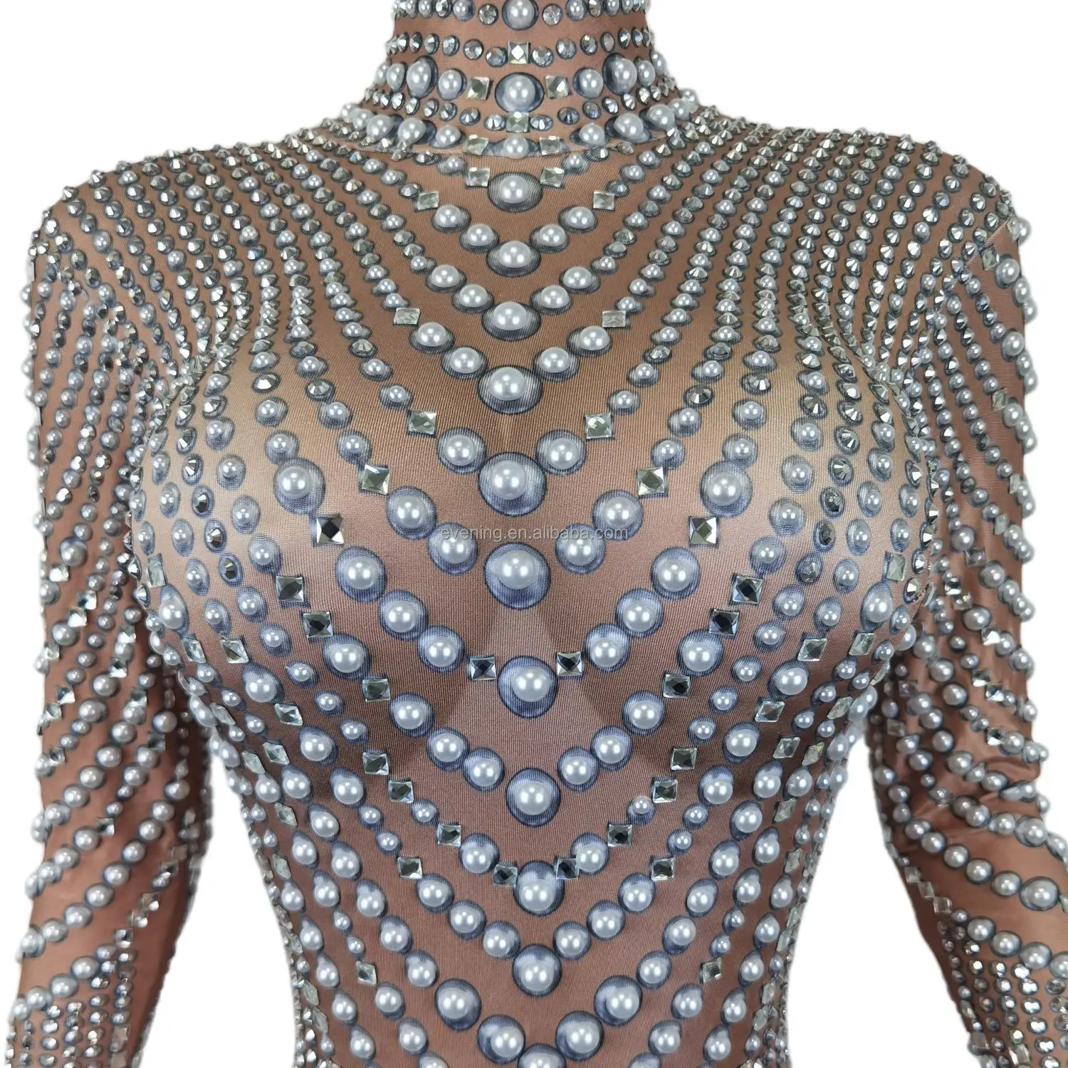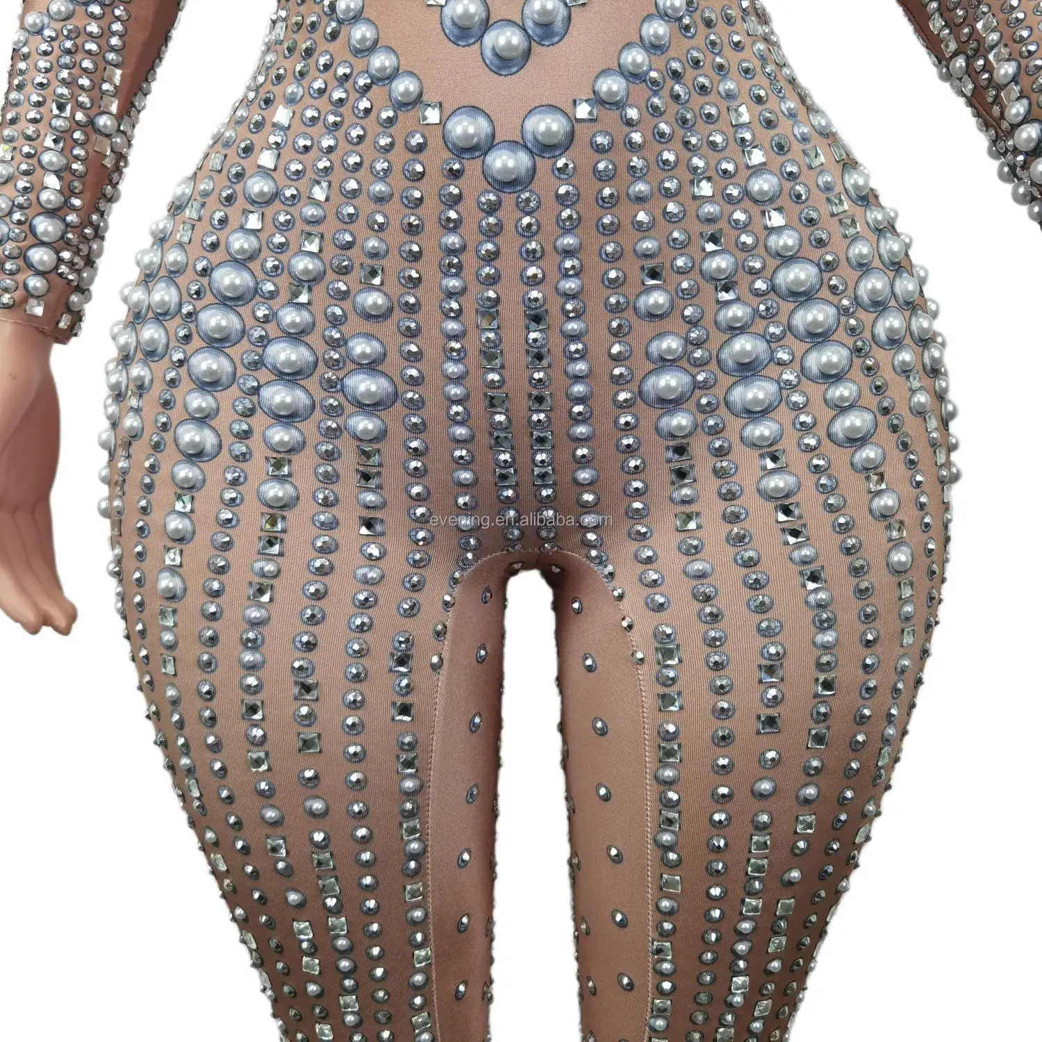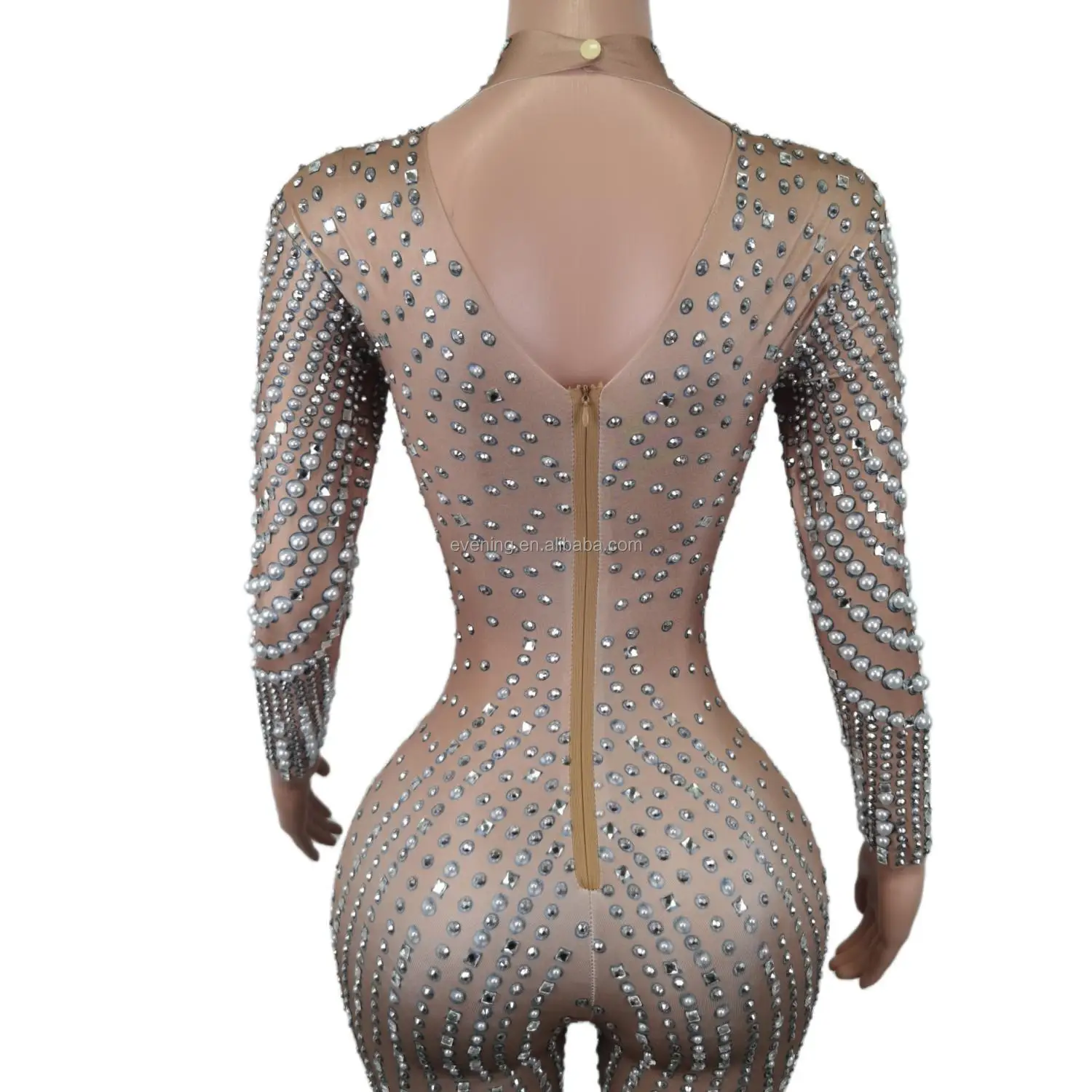Elegant Long Sleeves Pearls Diamond One Piece Bodysuit Pole Dancer Festival Outfit Formal Party Ladies Rompers Women Jumpsuits