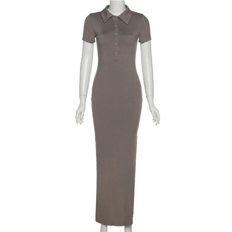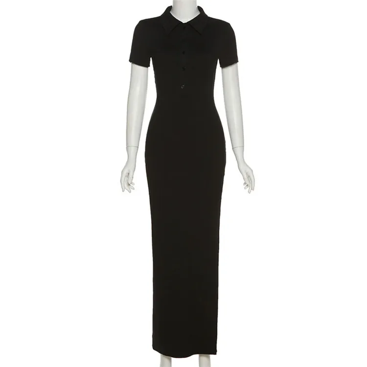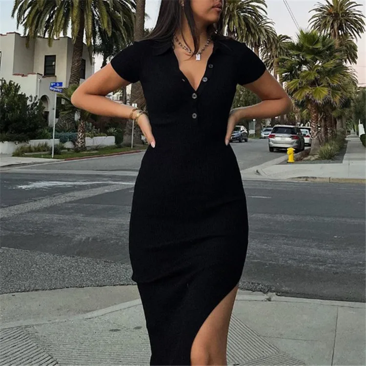 Elegant Office Lady Long Dress Women Solid Fashion Turn-down Collar Short Sleeve Button Side Split Street Bodycon Dress
