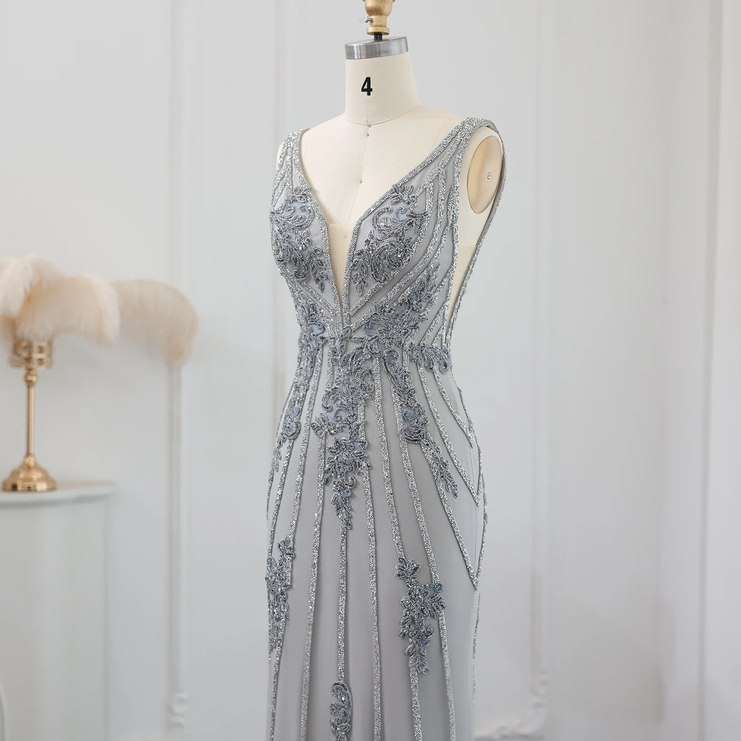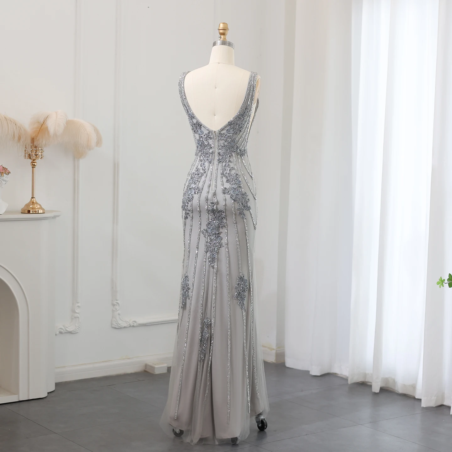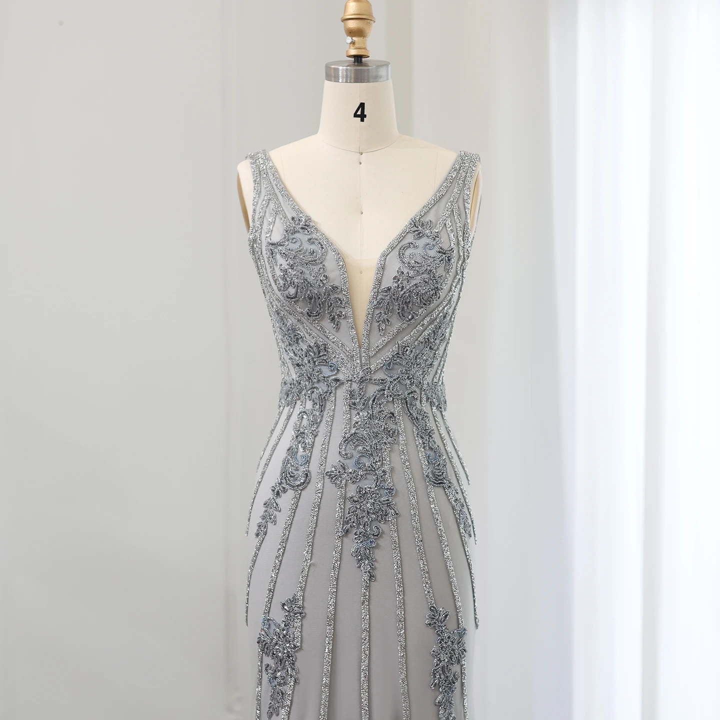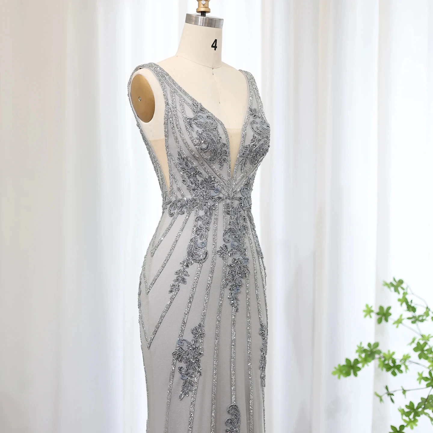 Elegant Silver Gray V-Neck Mermaid Evening Dress For Women Wedding 2024 Sexy Open Back Formal Party Gowns Sz188-2