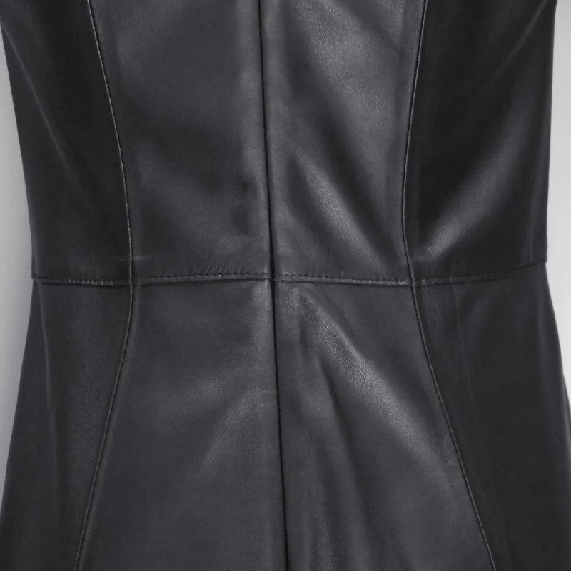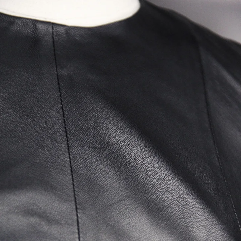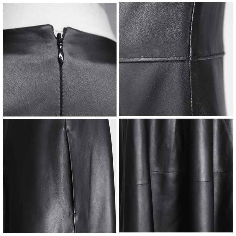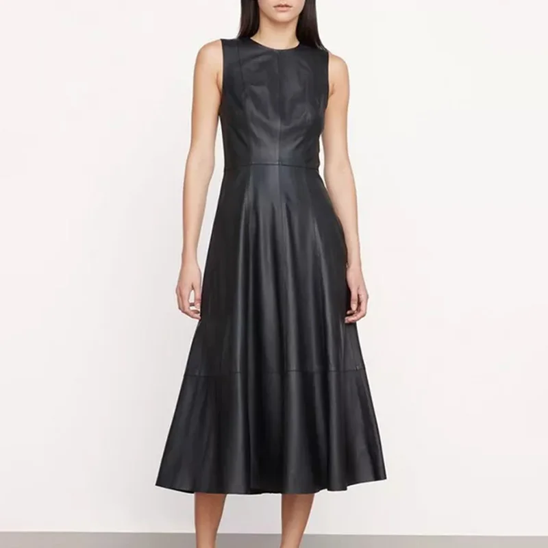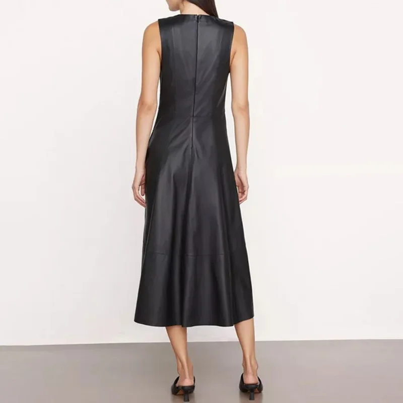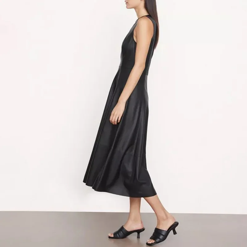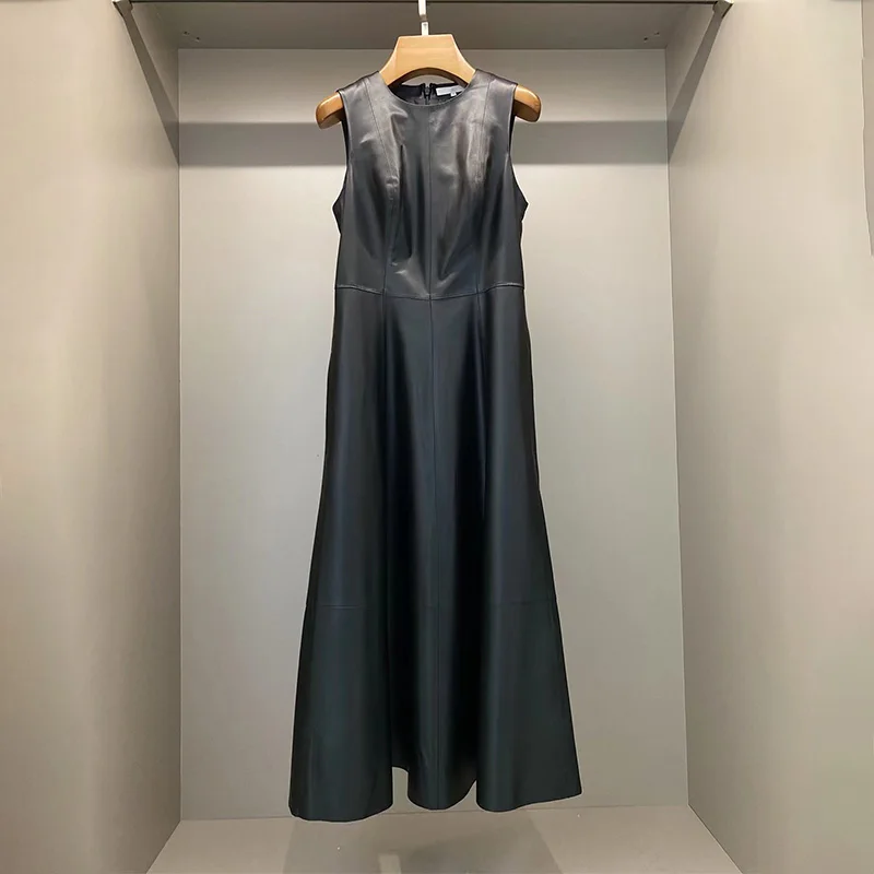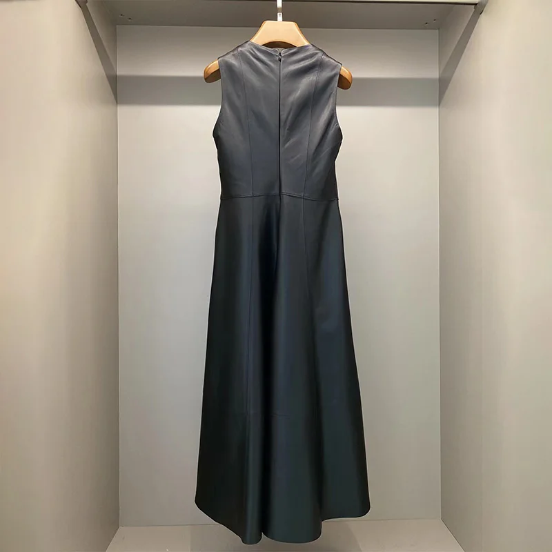 Elegant Solid Sleeveless Long Style Leather Dress Ladies Genuine Sheepskin Leather Dress