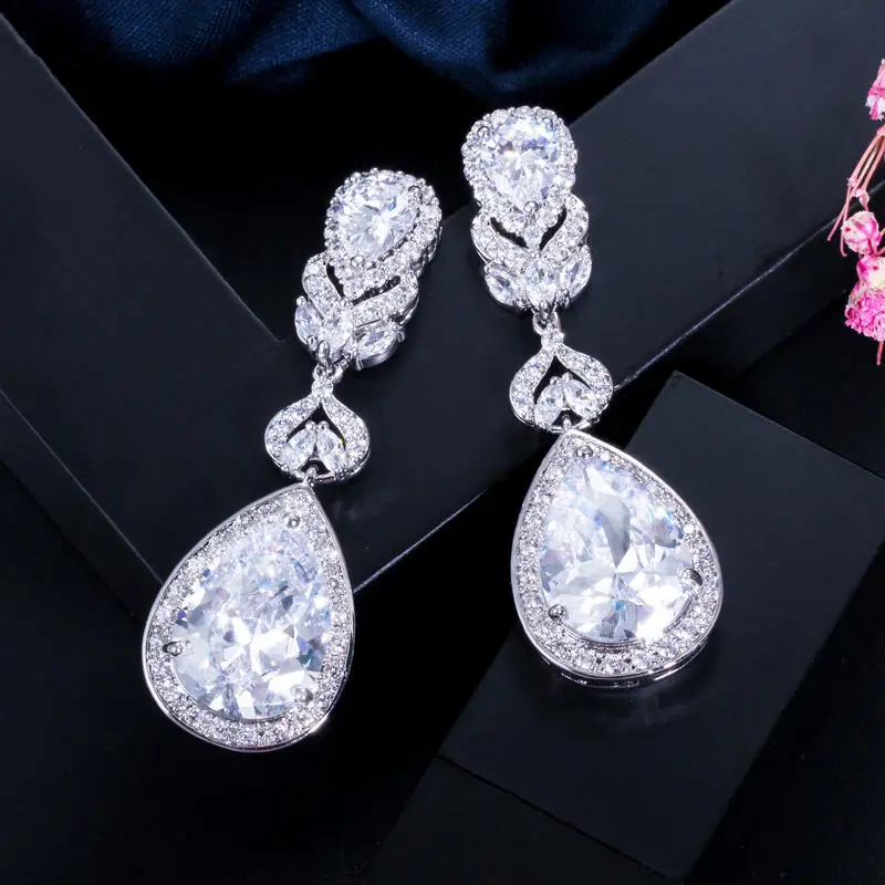 Elegant Water Drop Shaped Cubic Zirconia Crystal Women Dangle Hanging Bridal Long Earrings Luxury Wedding Jewelry for Brides