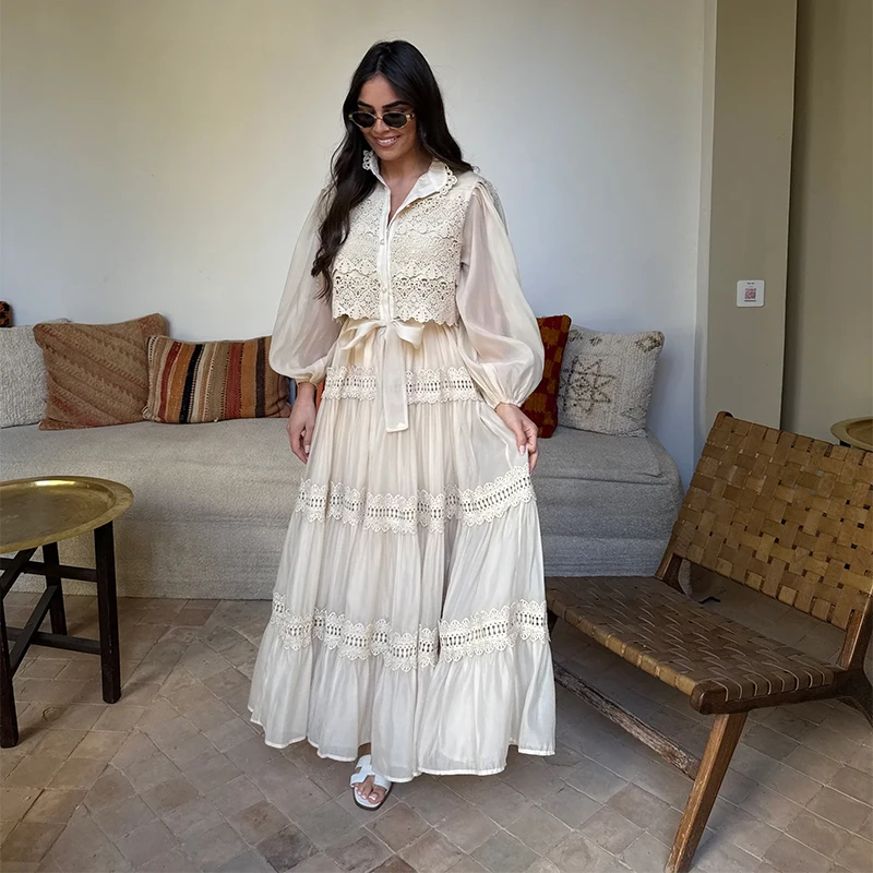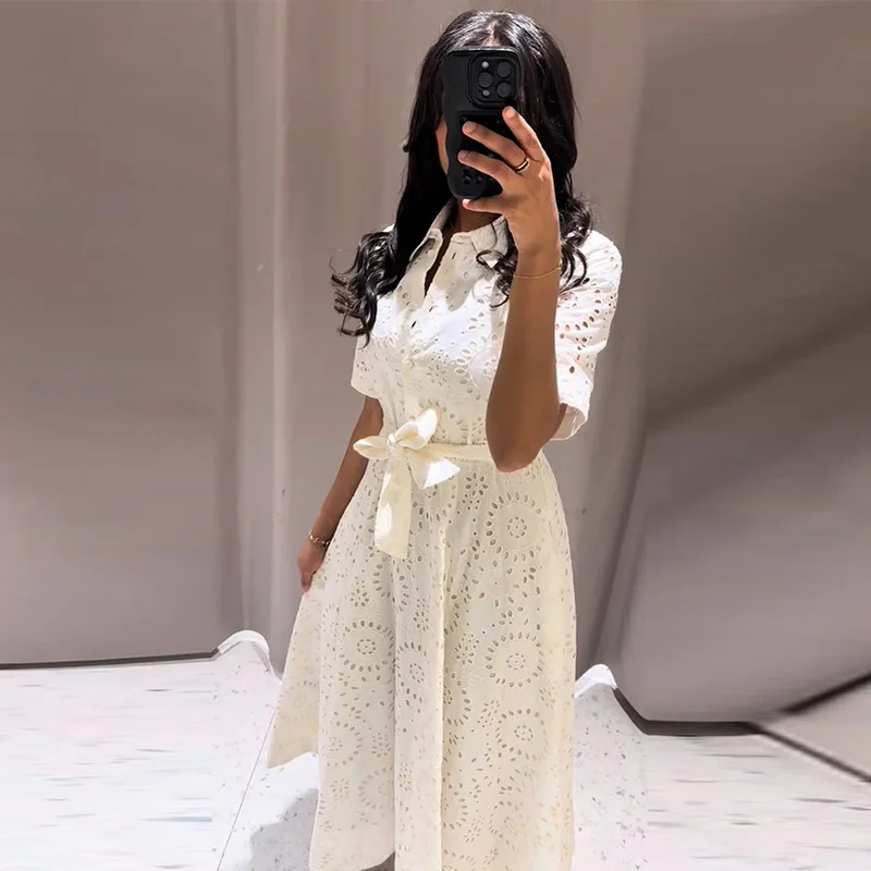 Embroidered maxi Dress Women Lapel Hollow Fashionable Short Sleeve Belt High Waist long Dresses Female Summer Chic robe